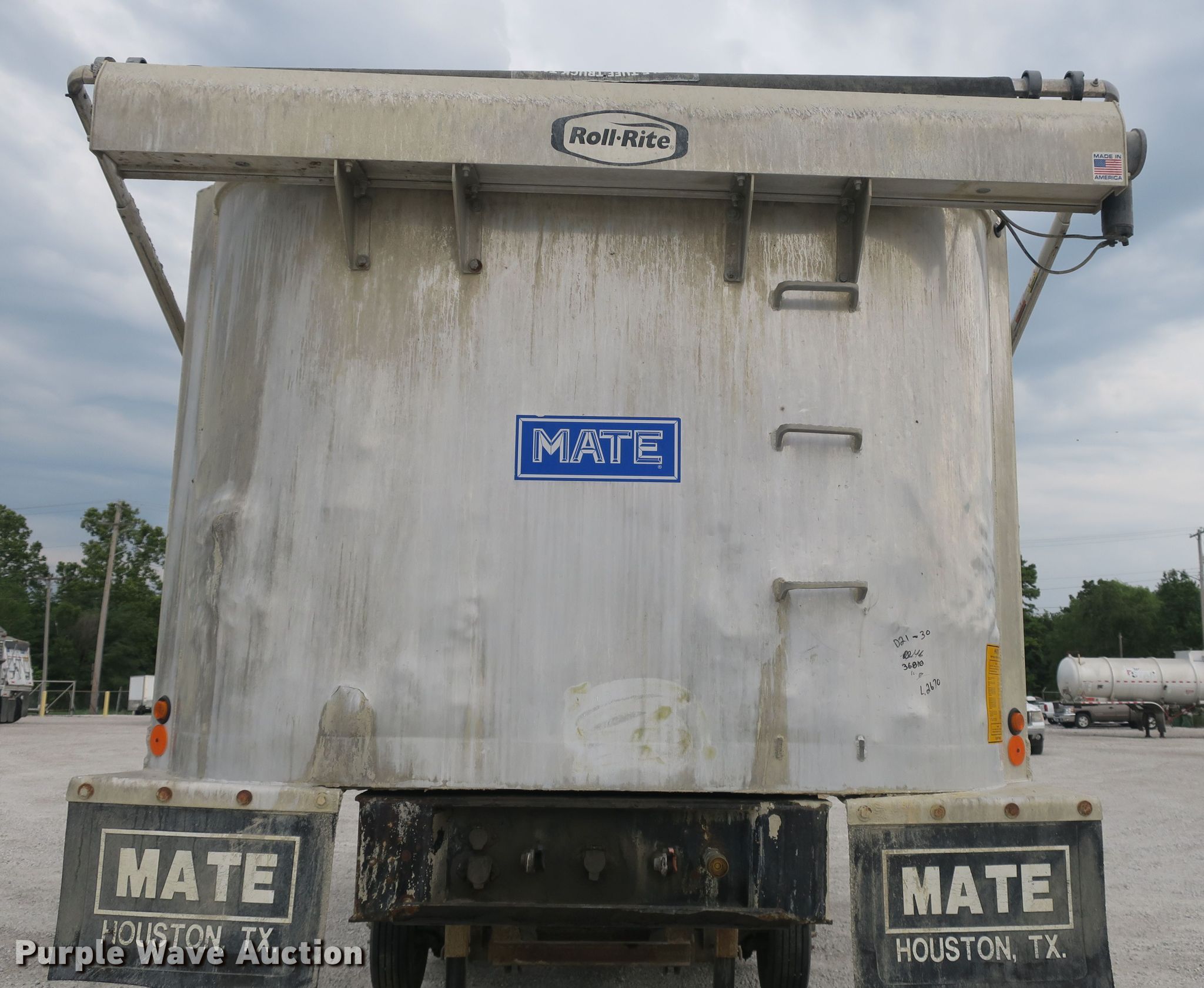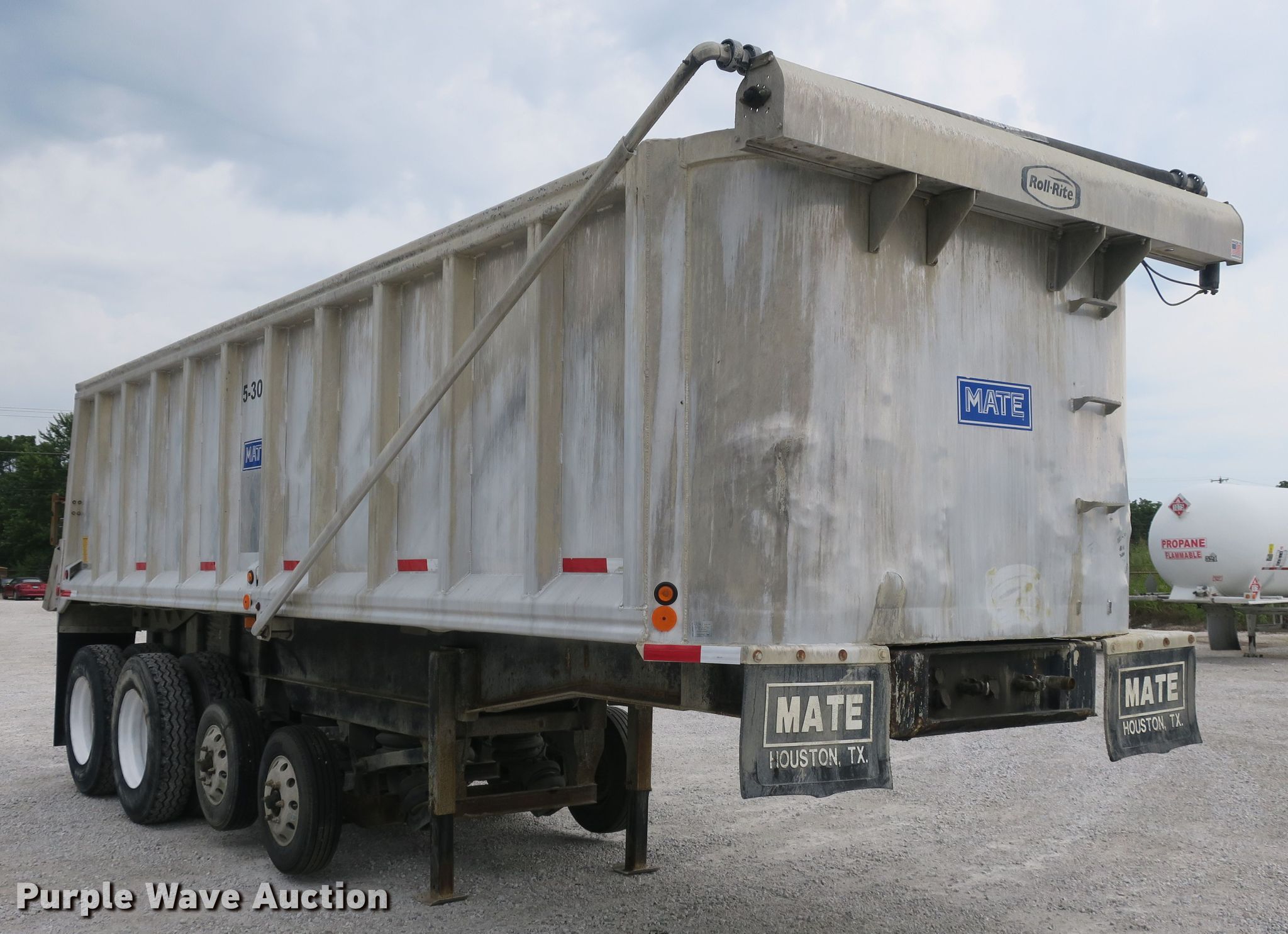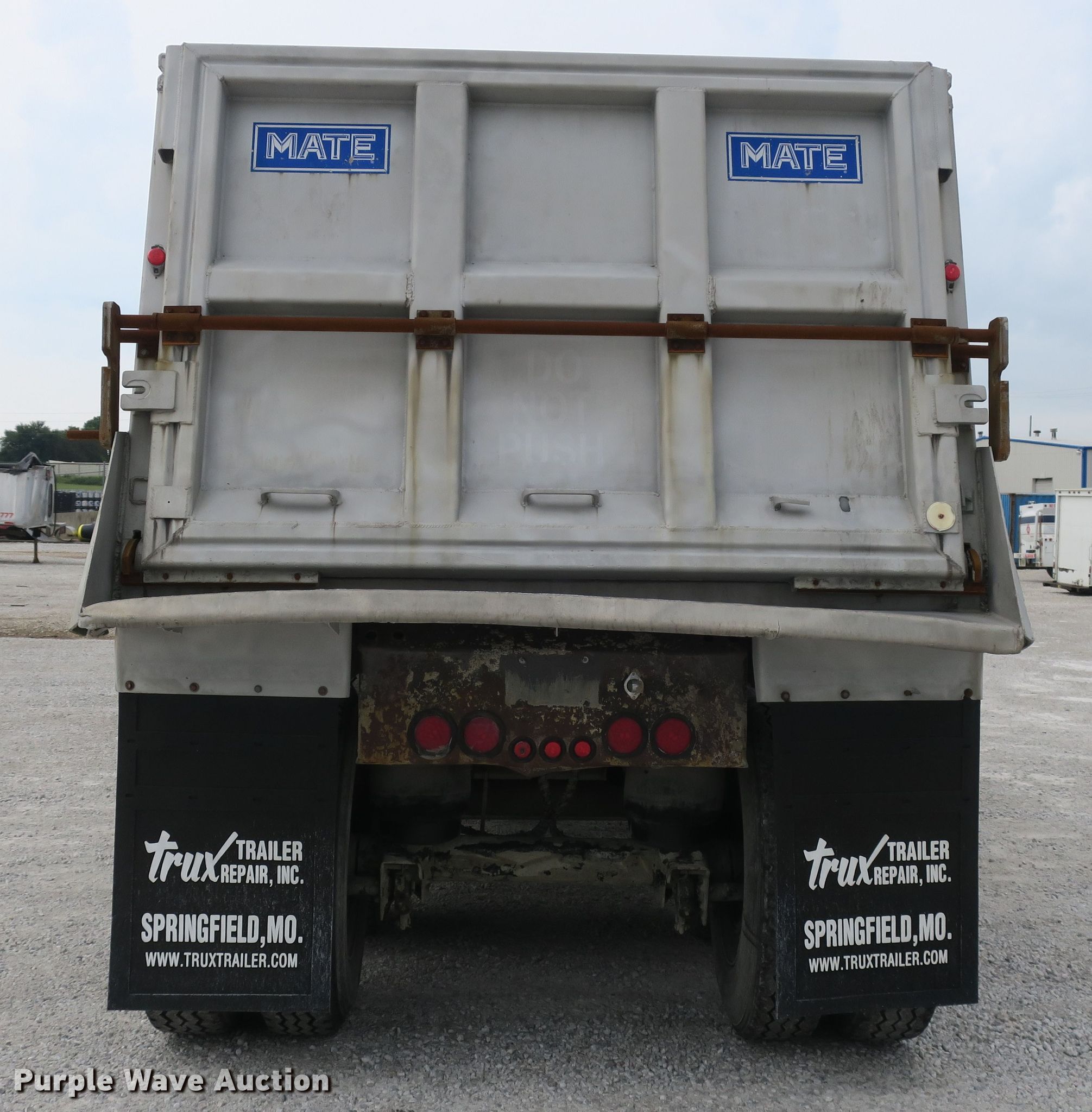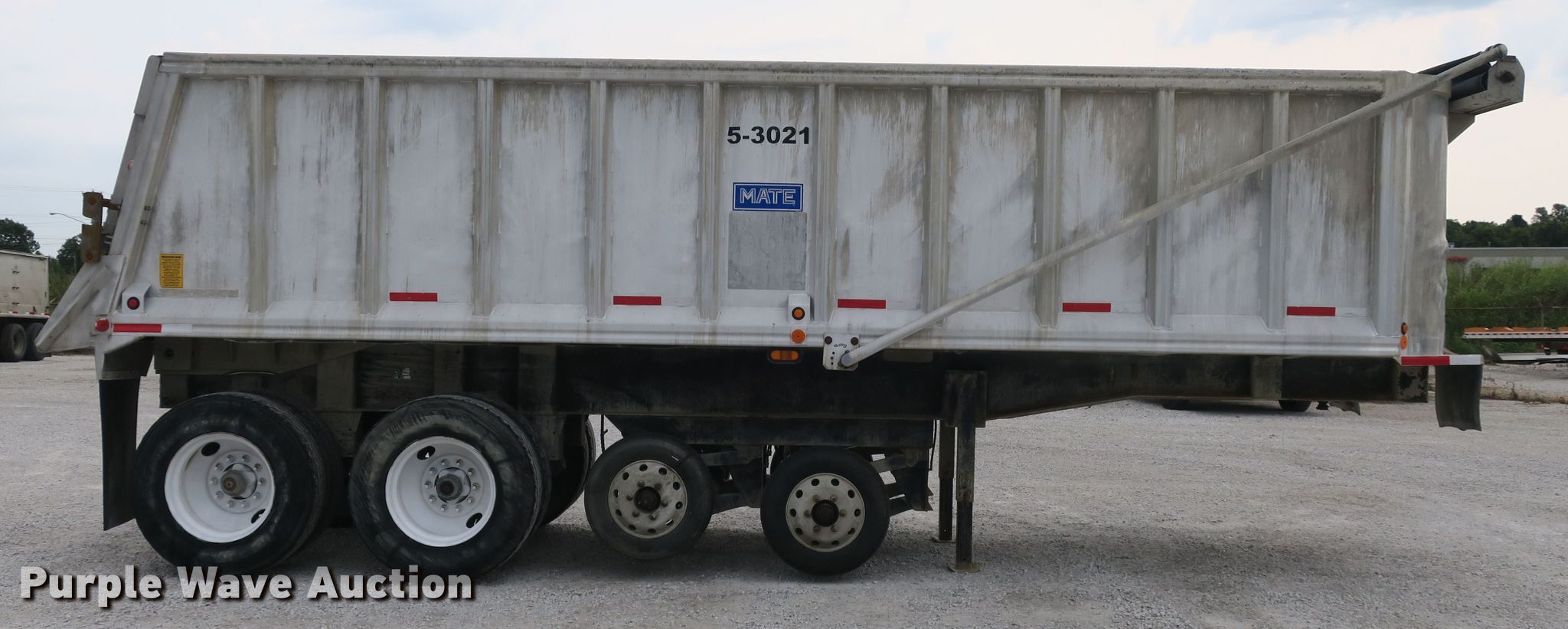 Purple Wave is selling a used End Dump Rock Trailer in Missouri. This item is a 2014 Mate end dump trailer with the following: 26'L x 96"W aluminum dump body, 60" side height, Air operated end gate, Electric roll tarp, Dual leg landing gear, Air suspension, Air brakes, Quad axle, Pusher axles, Steel wheels, 215/75R17.5 tires