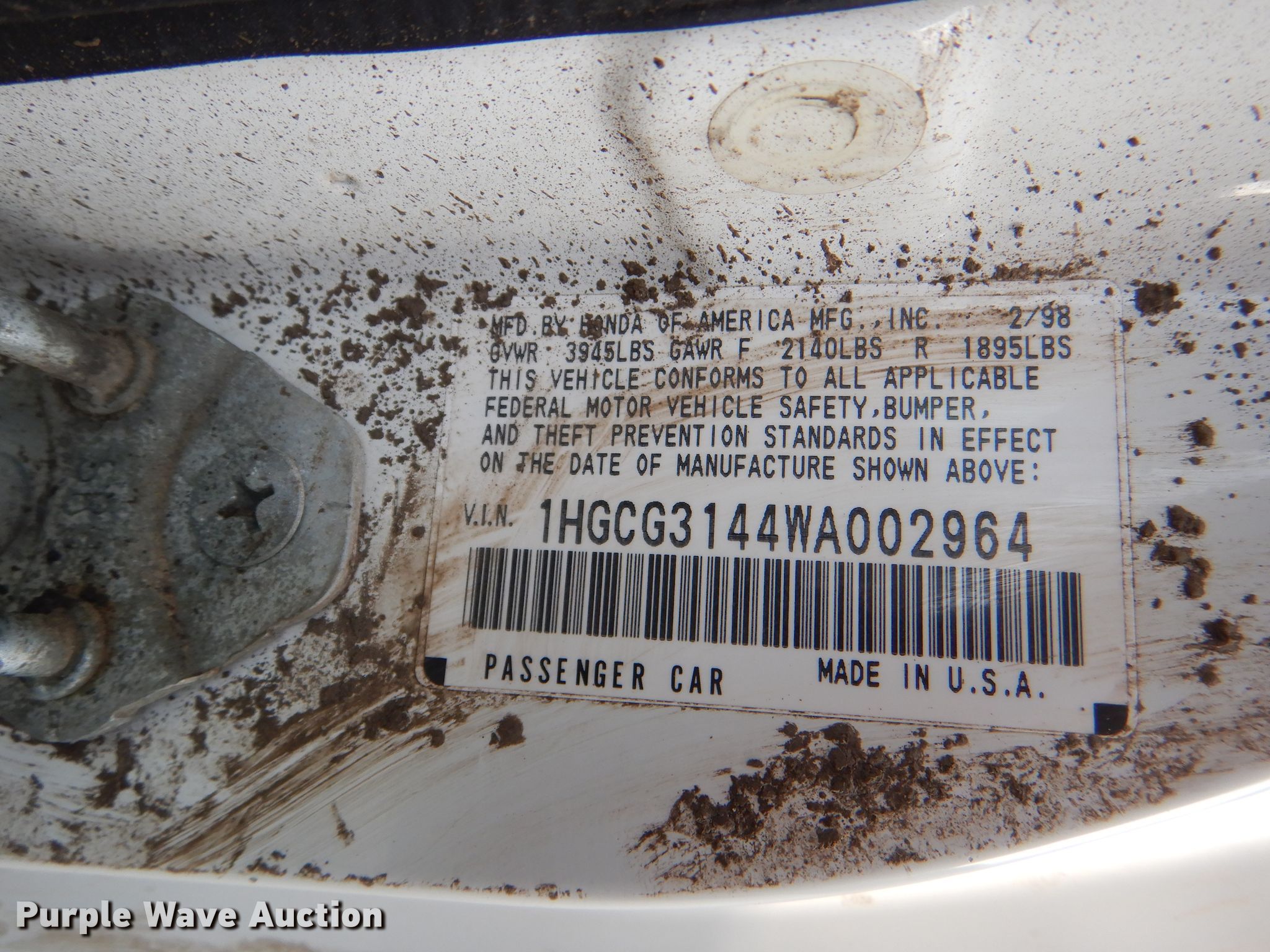 Purple Wave is selling a used Passenger Vehicle in Kansas. This item is a 1998 Honda Accord with the following: 179,059 miles on odometer, 2.3L L4 SOHC 16V gas engine, Five speed manual transmission, AC and heat, Cruise, Power windows and locks, 185/65R15 tires, Dead battery, Flat tires, Non-operational reverse and first gear, Non-operational parking brake