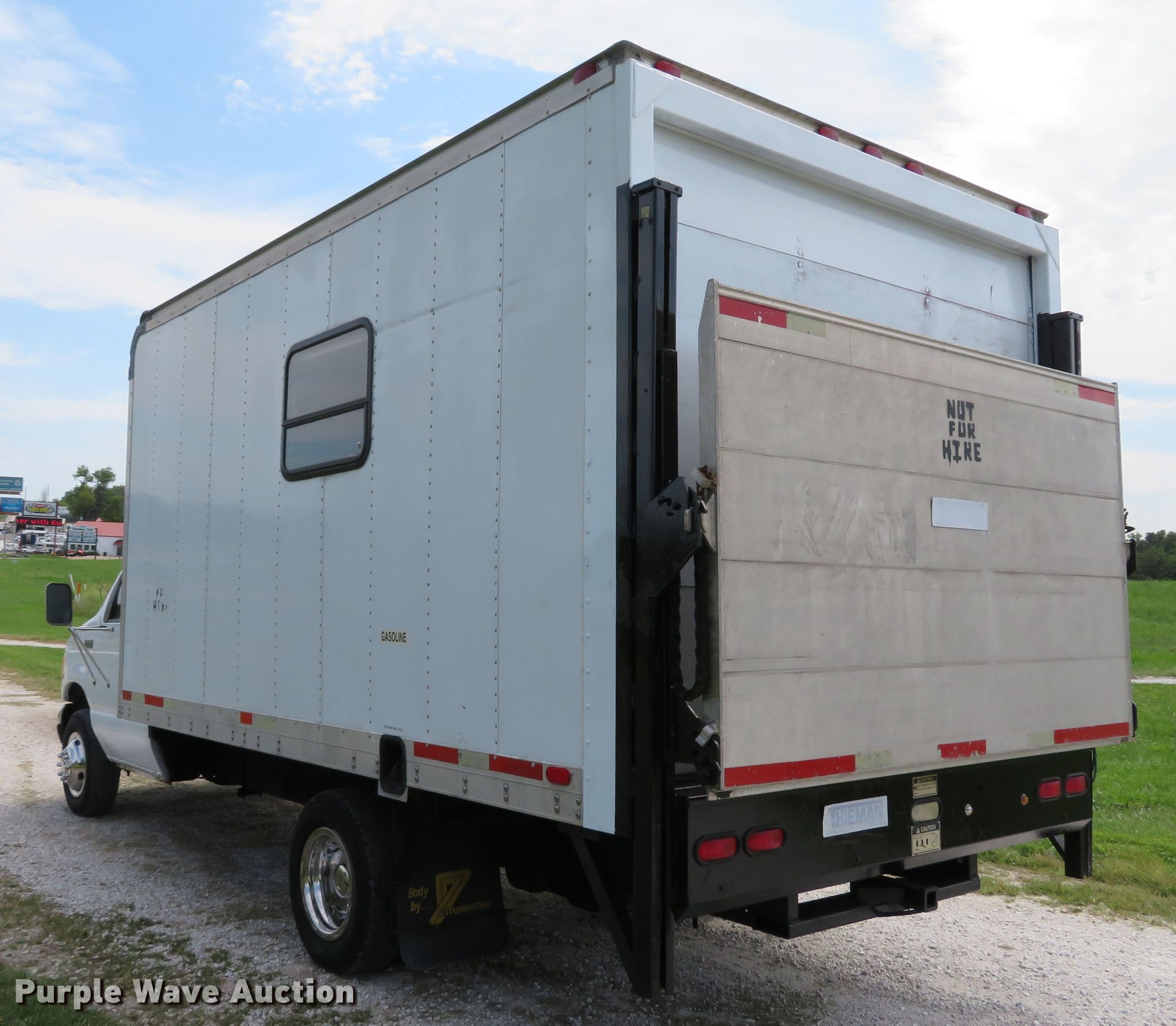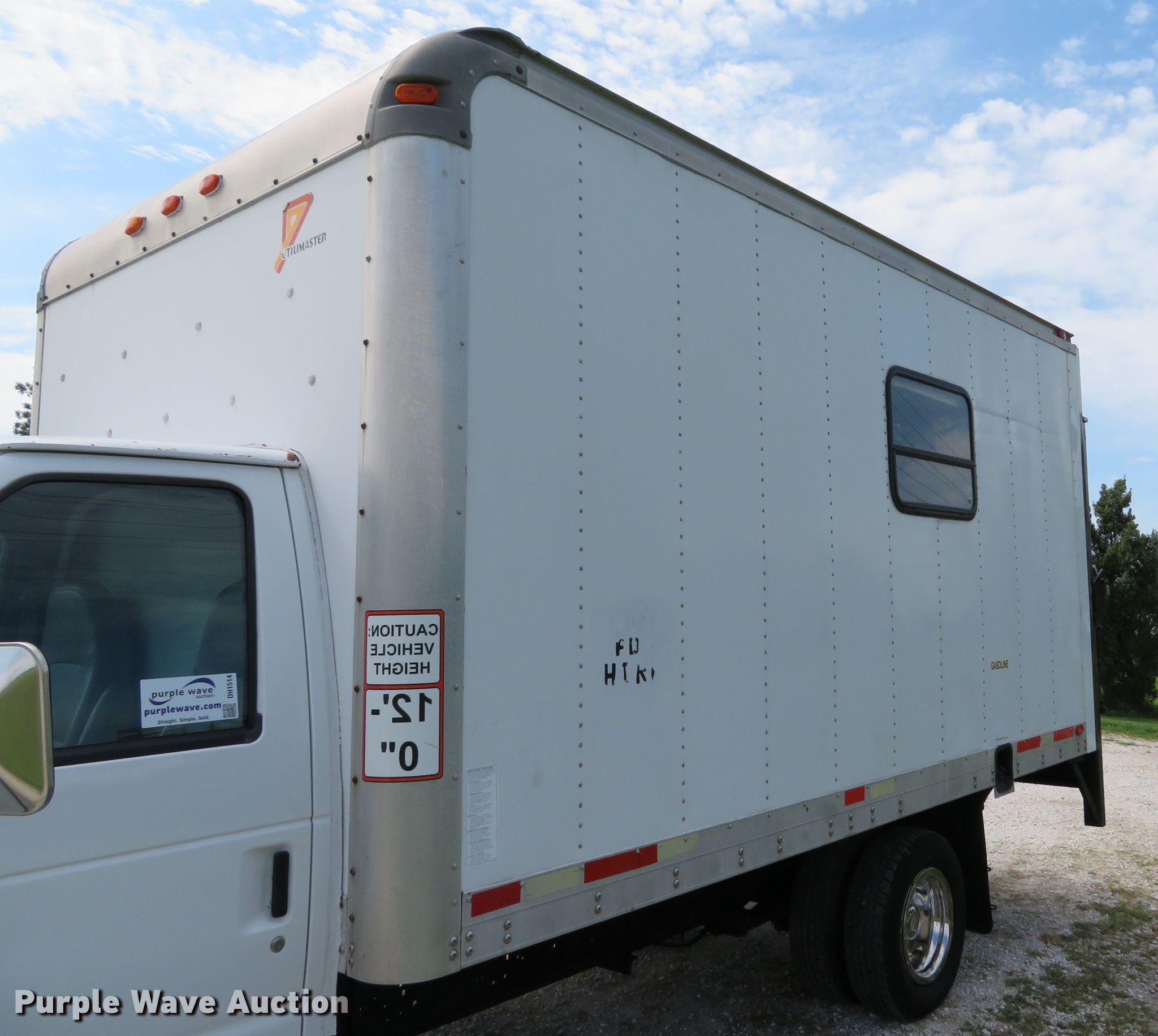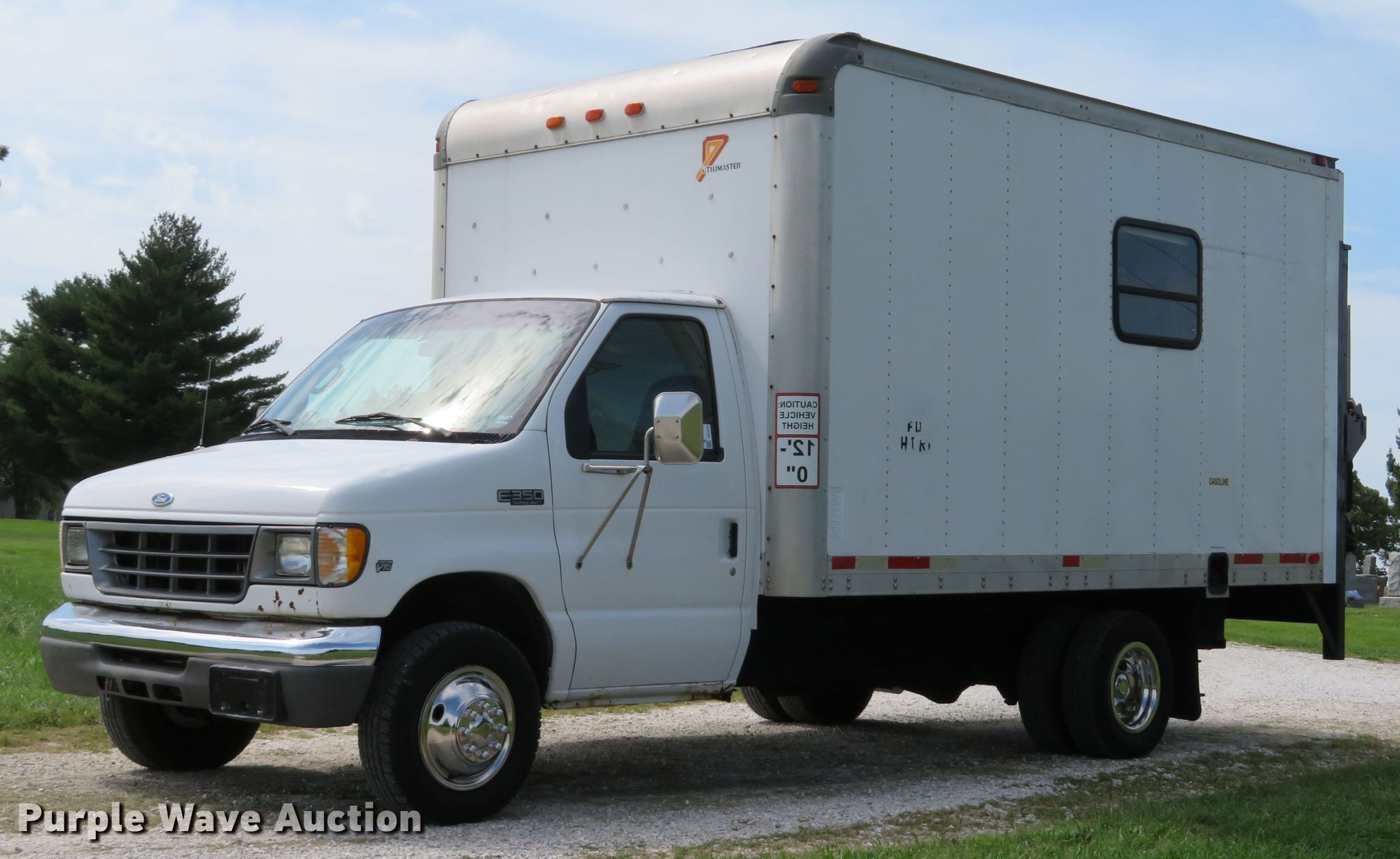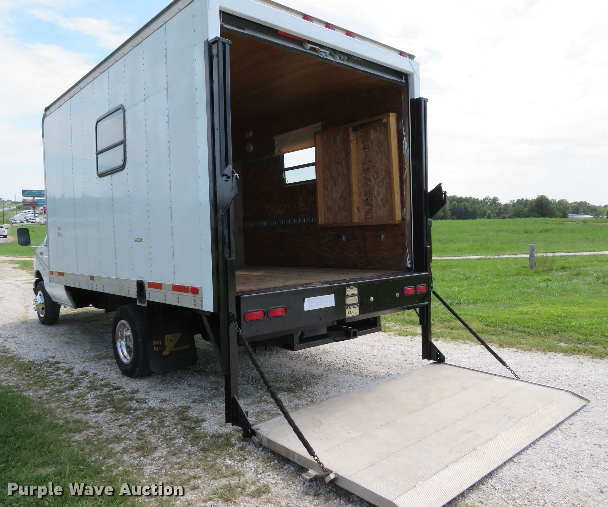 Purple Wave is selling a used Box Truck in Missouri. This item is a 2002 Ford Econoline E350 Super Duty box truck with the following: 209,834 miles on odometer, 6.8L V10 SOHC 20V gas engine, Automatic transmission, Single axle, AC and heat, Utilimaster box bed, 14'L x 95"W x 88"H, Wood floor, Thieman TVLR16A end gate lift, 1,600 lbs capacity,, 158" wheelbase, Spring suspension, Hydraulic brakes, LT225/75R16 tires, GVWR 11,500 lbs, Non-operational passenger side exterior door handle