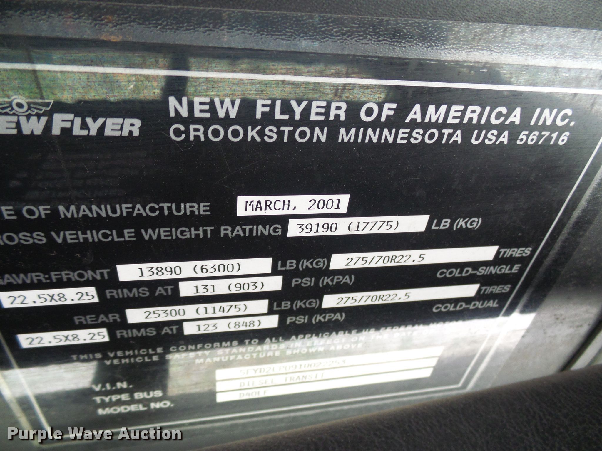 Purple Wave is selling a used Bus in Missouri. This item is a 2001 New Flyer D40 LF coach bus with the following: 386,039 miles on odometer, 4,664 hours on meter, Cummins ISC 8.3L L6 diesel engine, Allison automatic transmission, Single axle, AC and heat, Ceiling handrail, Ceiling emergency exits, Air brakes, 275/70R22.5 tires