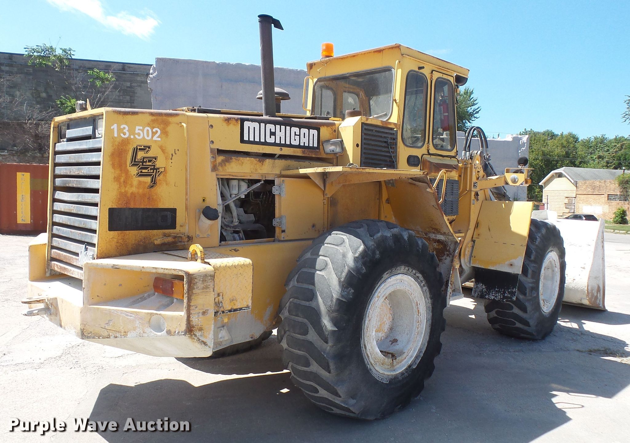 Purple Wave is selling a used Wheel Loader in Kansas. This item is a 1992 Volvo Michigan L120 wheel loader with the following: 13,297 hours on meter, Volvo TD71G six cylinder diesel engine, 200 HP, Powershift transmission, 4F-4R gears, Enclosed cab, AC and heat, Two-lever bucket controls, Volvo 112"W general purpose bucket, Bolt-on cutting edge, 4 cu.yd. capacity, Hydraulic quick coupler, 23.5-25 tires, Non-operational AC, Serial L120V60726
