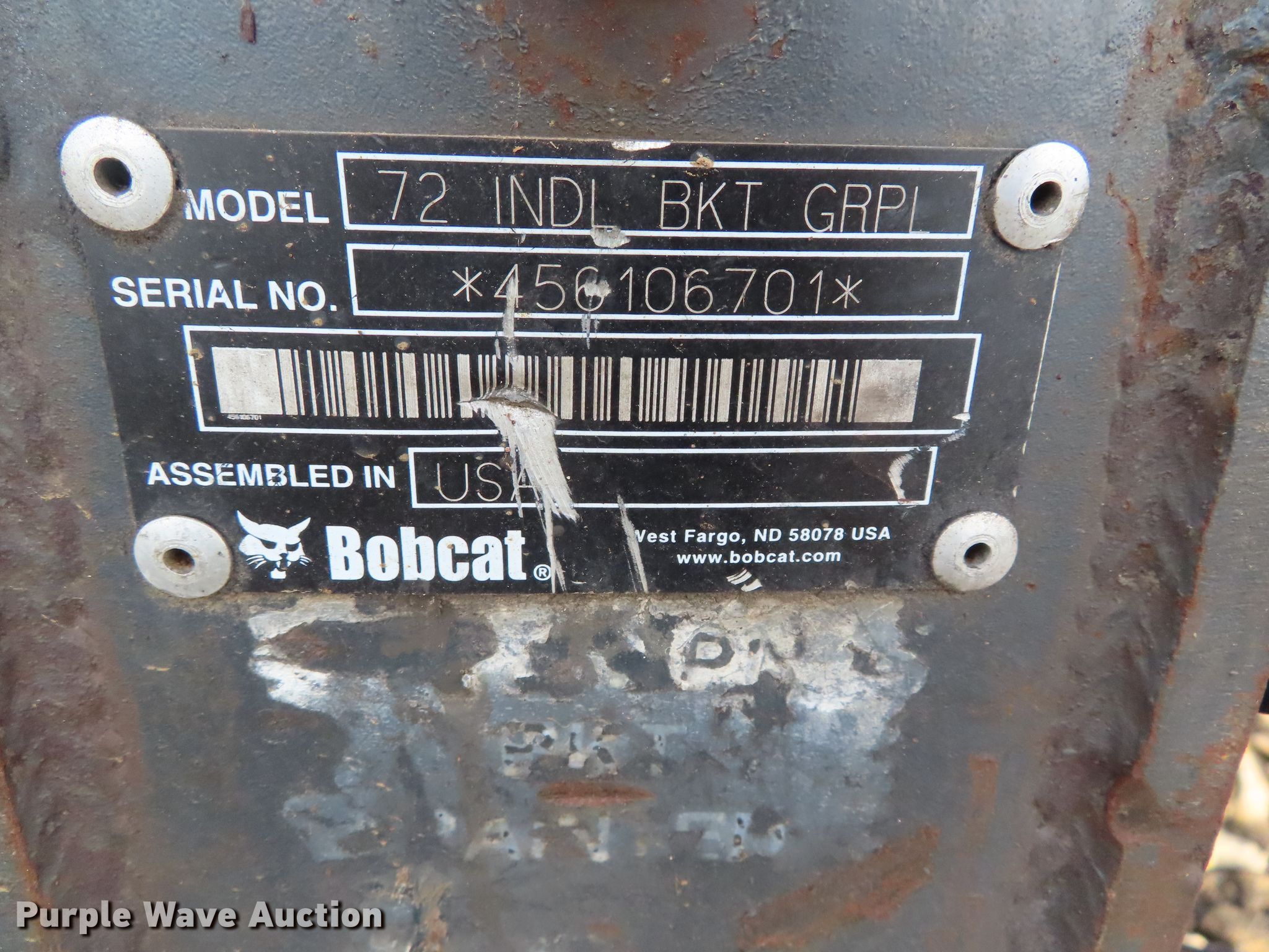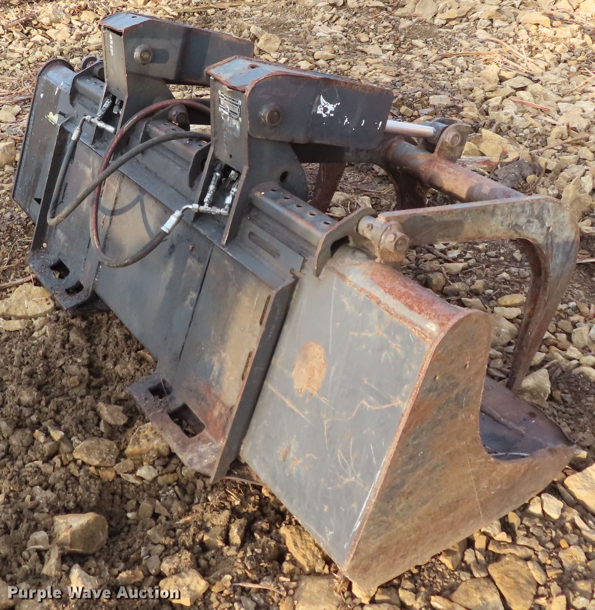 Purple Wave is selling a used Skid Steer Attach. in Kansas. This item is a Bobcat 72"W grapple bucket with the following: Flat faced couplers not included, Serial 456106701