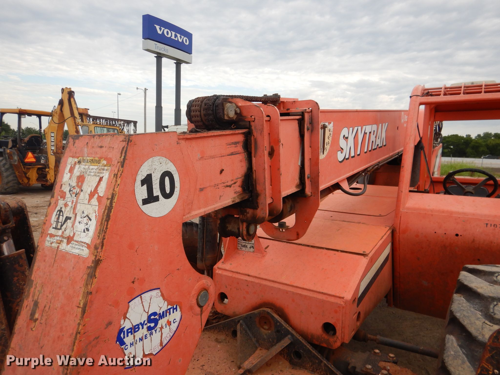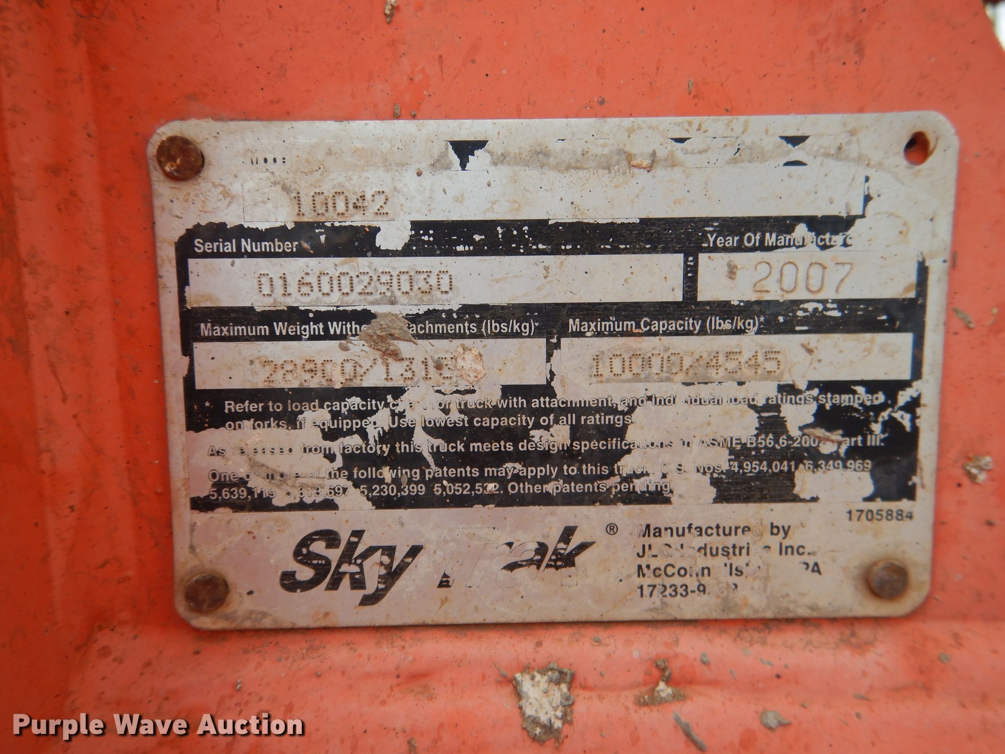 Purple Wave is selling a used Telehandler in Oklahoma. This item is a 2007 Sky Trak 10042 telehandler with the following: 2,422 hours on meter, Cummins OSB4.5 4.5L four cylinder diesel engine, Powershift transmission, 4R-4R, Four wheel drive, Canopy, Crab steering, Four wheel steering, 10,000 lbs max lift capacity, 42' max lift height, Three boom stages, 48"L forks, Tilt carriage, 17.5-25 tires, Serial 0160029030, Unit# 80-78