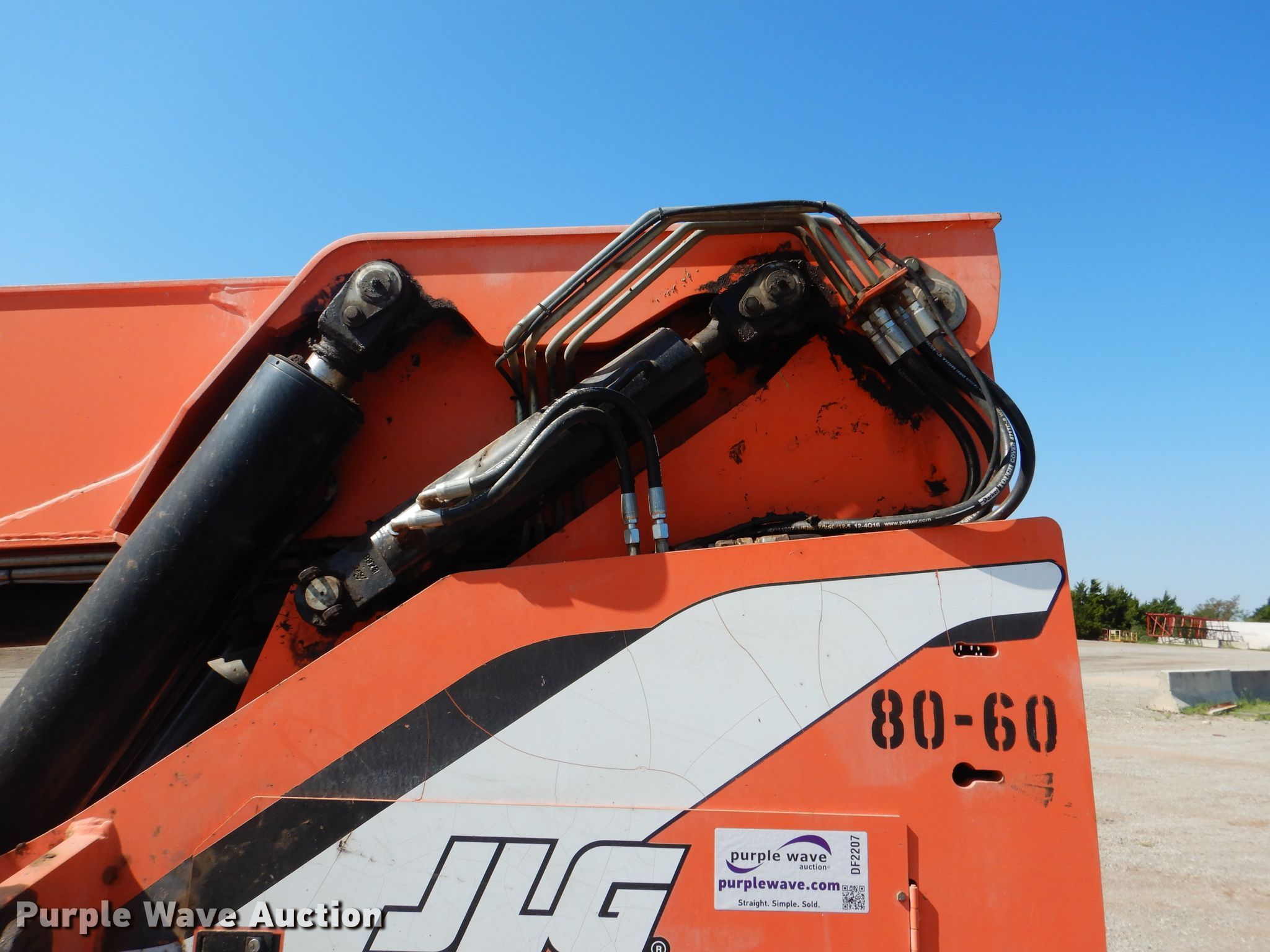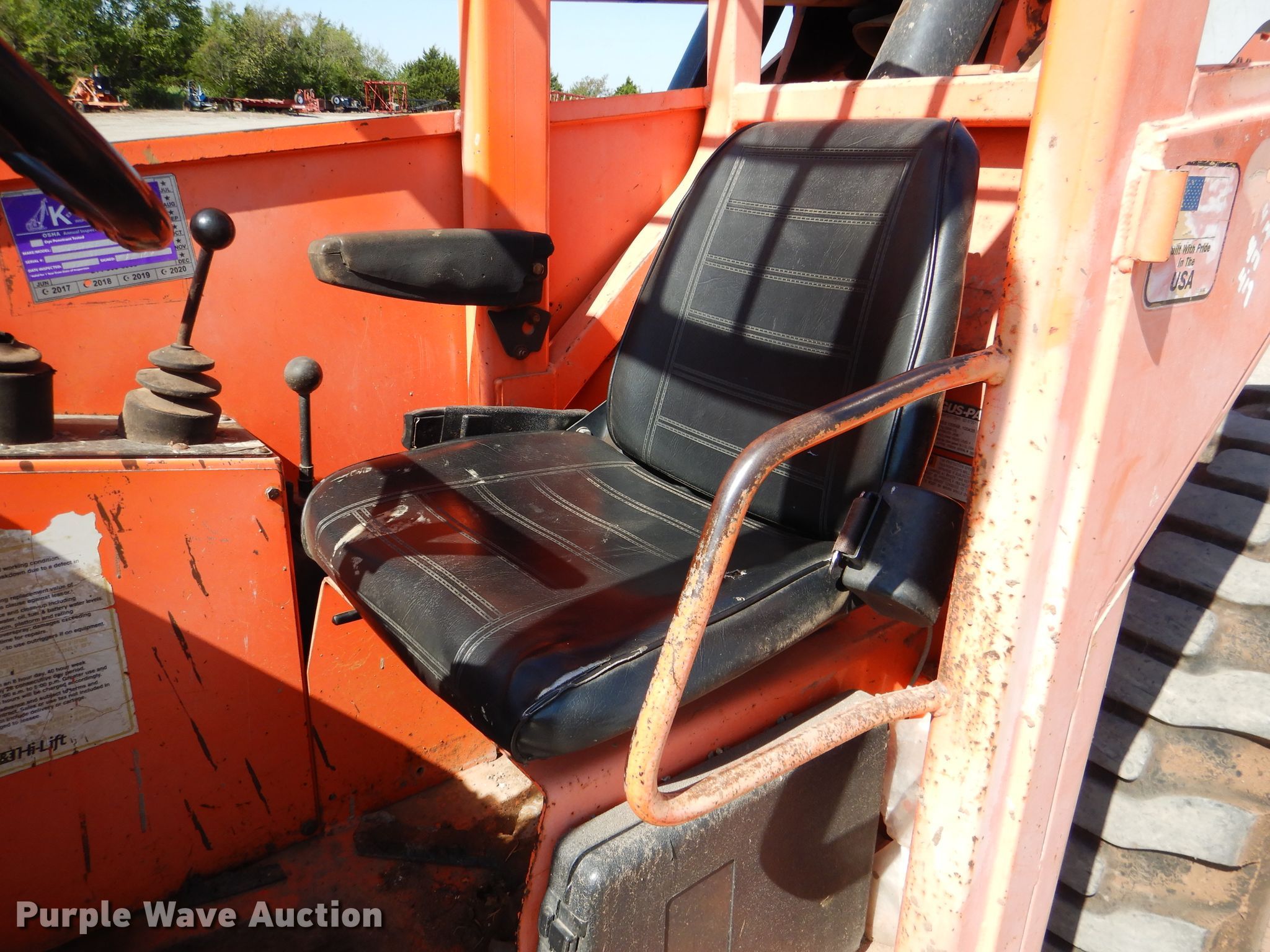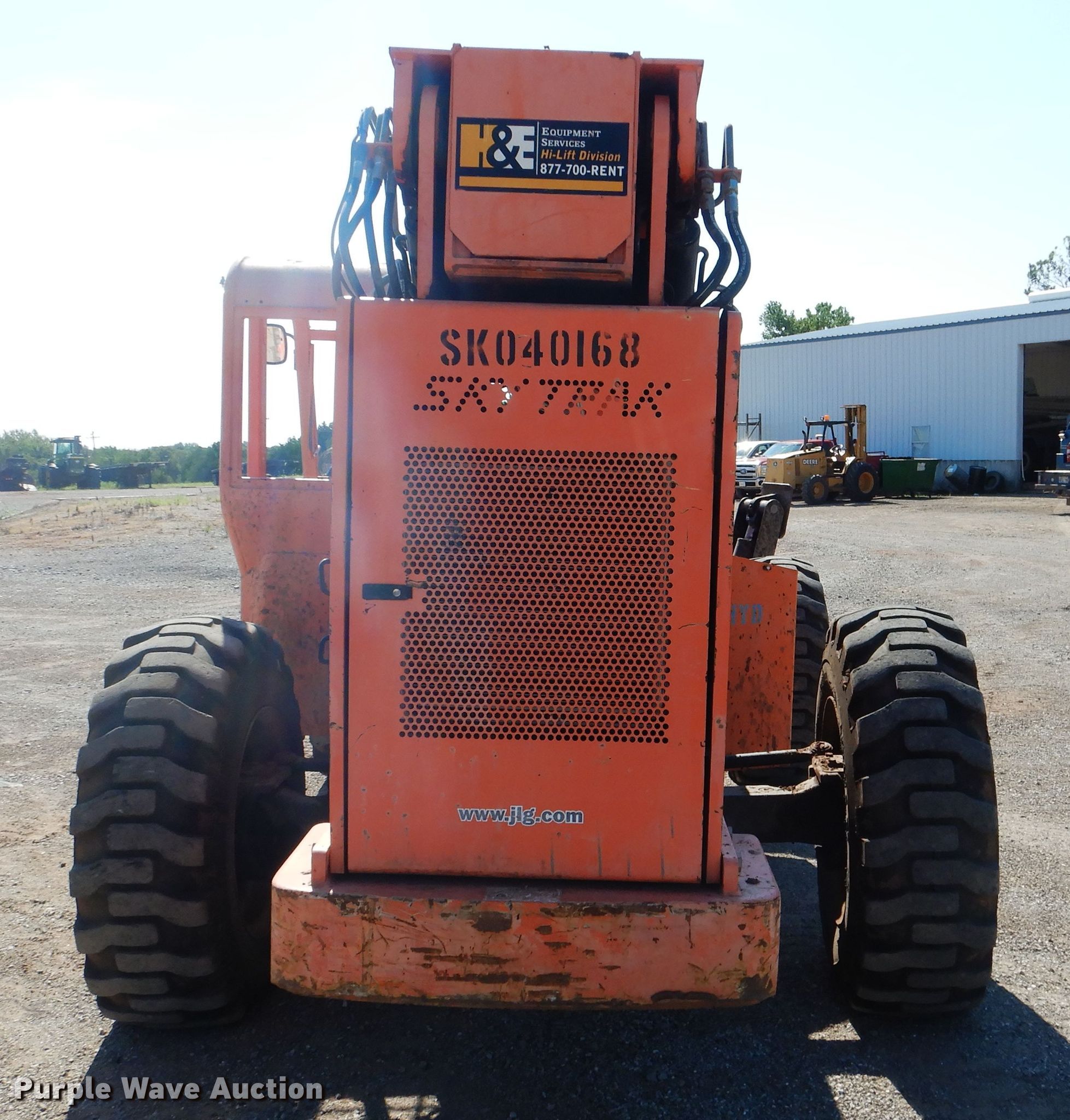 Purple Wave is selling a used Telehandler in Oklahoma. This item is a 2006 Sky Trak 10054 telehandler with the following: 8,047 hours on meter, Cummins QSB CPL6401 4.5L four cylinder diesel engine, Powershift transmission, Four wheel drive, Canopy, Crab steering, Four wheel steering, 10,000 lbs max lift capacity, 54' max lift height, Four boom stages, Side shift, 48"L forks, Tilt carriage, Hydraulic outriggers, 18.5-25 tires, Serial 040168, Unit# 80-60