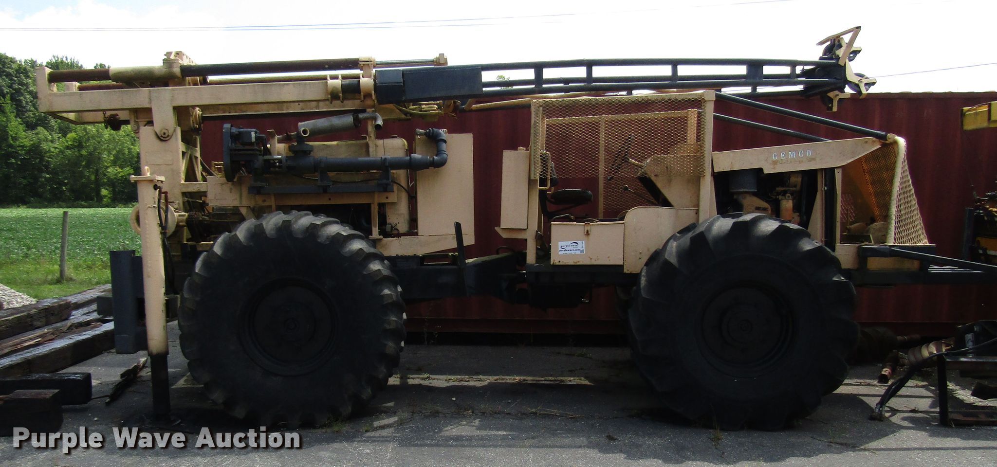 Gemco 300 drilling rig. Detroit Diesel four cylinder diesel engine, Five speed manual transmission, Four wheel drive, Ramsey winch, Central Mining Equipment 75 drill Ford 300 six cylinder gas engine, Four speed transmission, Cat head, Auxiliary hydraulic winch, L-6 Manyo pump, Outriggers, 23.1-26 tires. Jones Equipment. 1300 E US Highway 50. North Vernon, IN 47265