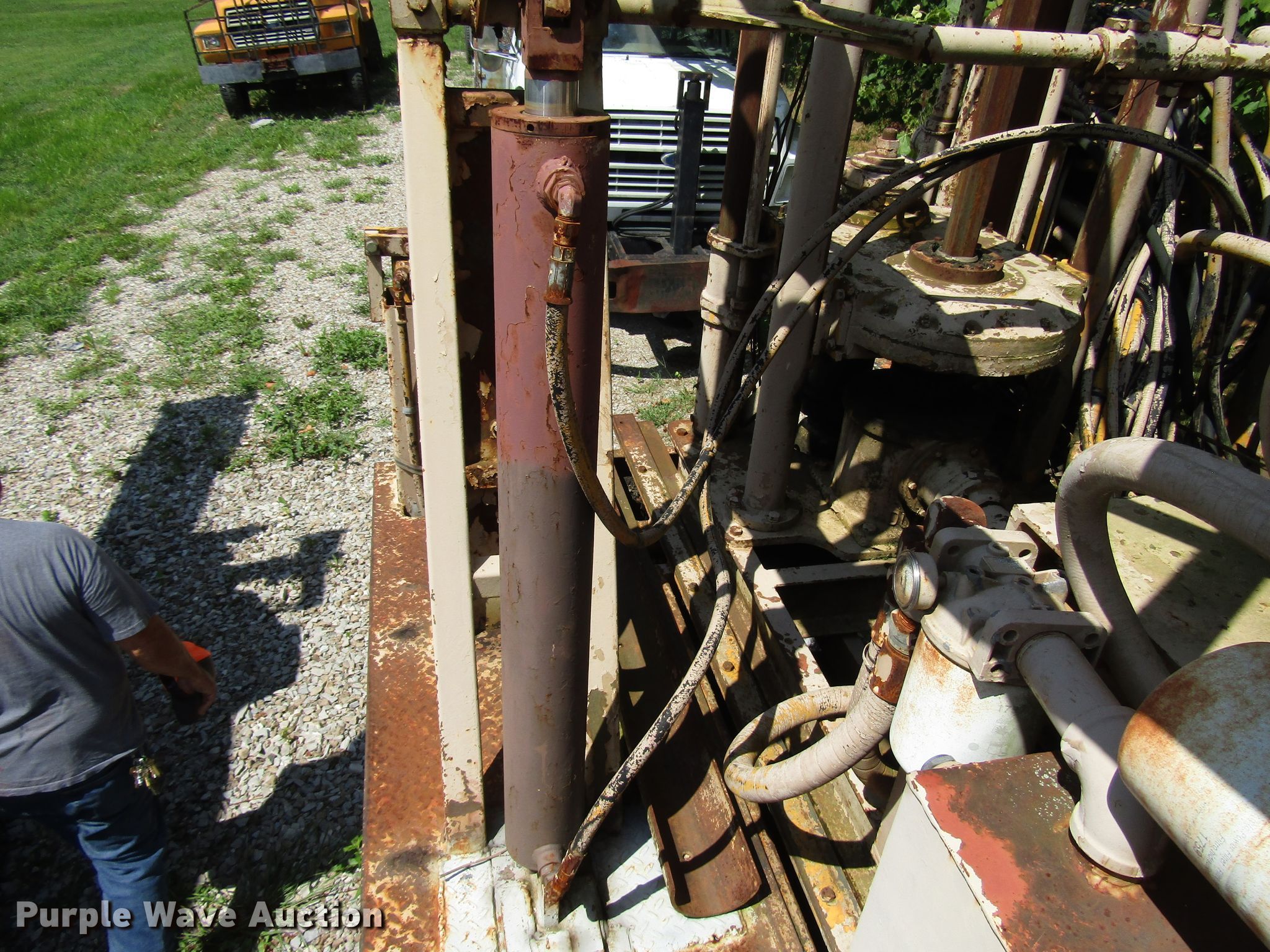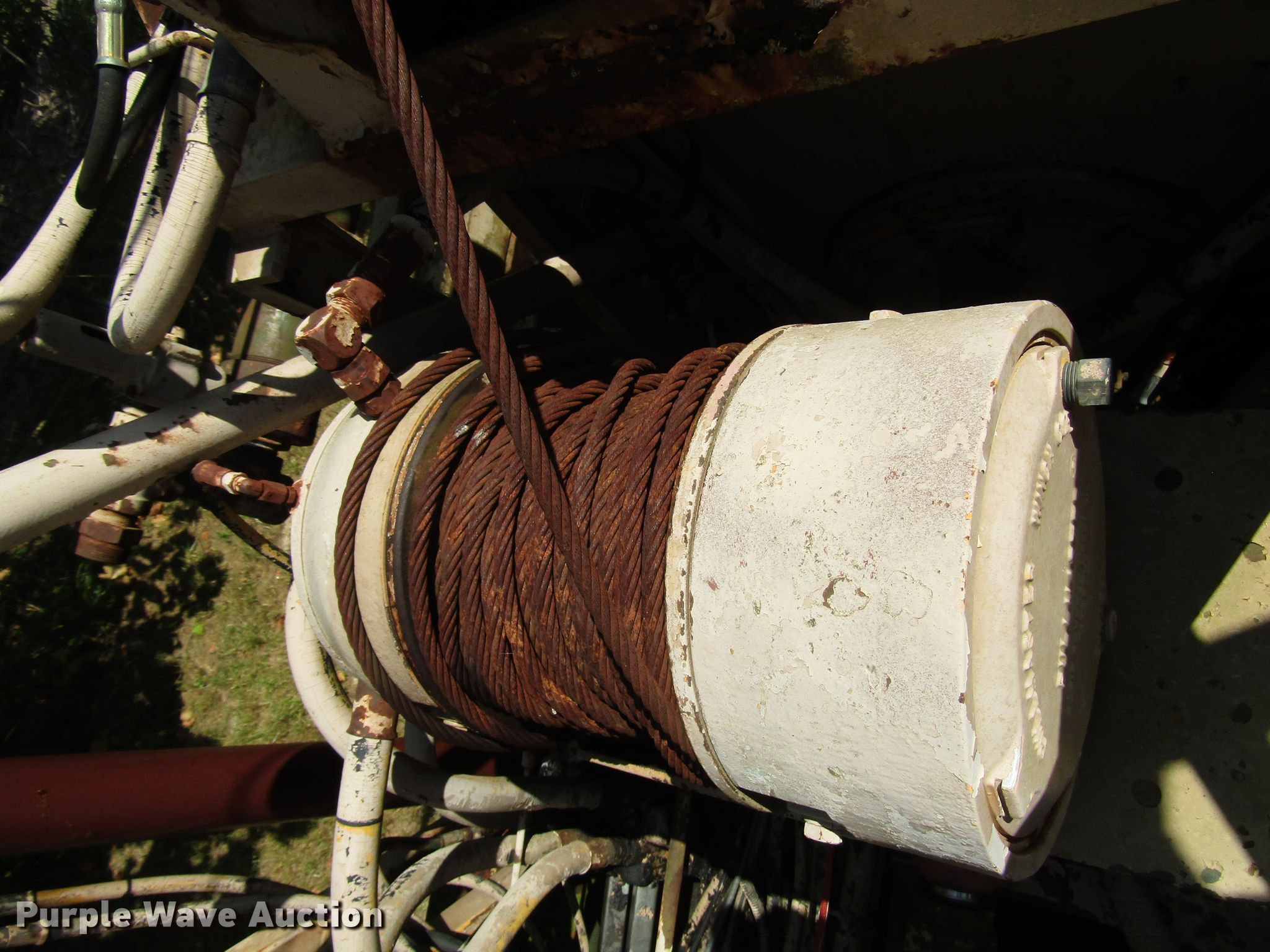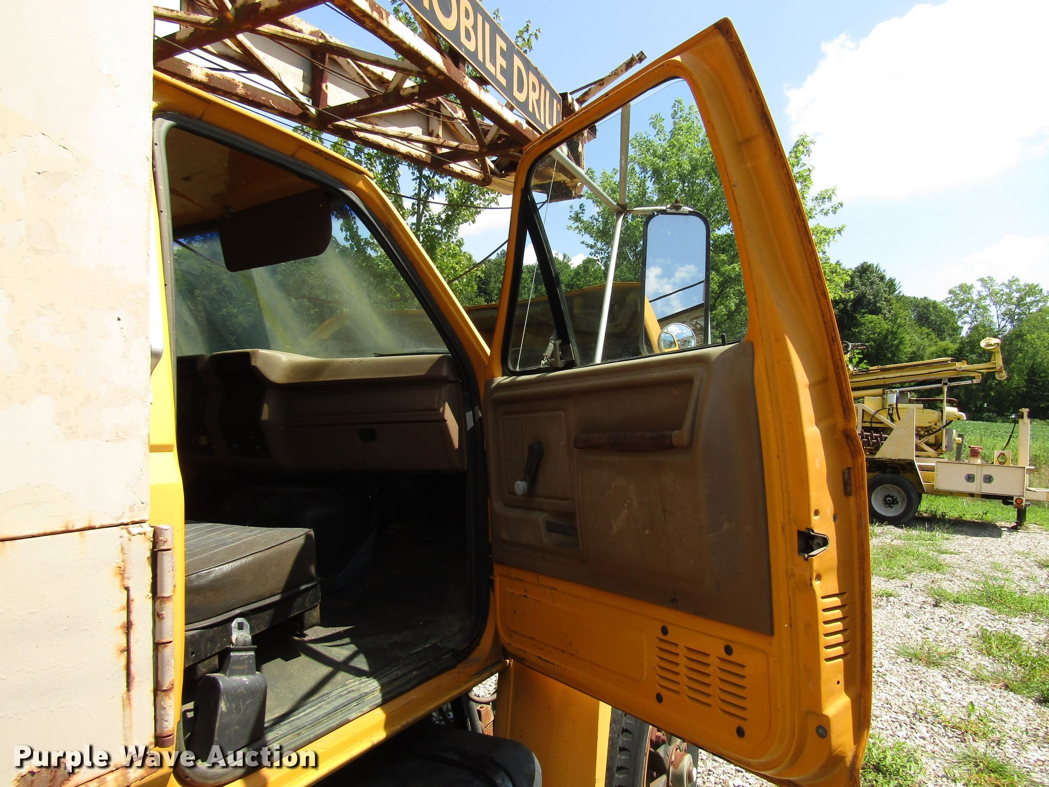 Purple Wave is selling a used Drilling Rig Truck in Indiana. This item is a 1988 Ford FT900 drilling rig truck with the following: 50,386 miles on odometer, 7.8L six cylinder diesel engine, Six speed manual transmission, Inter-axle differential lock, 1987 drilling rig, Model B61, 18'L x 96"W bed dimensions, Cummins 4BT 3.9L four cylinder diesel engine, Four speed manual transmission, Pullmaster winch, 10,000 lbs capacity, Safety driver winch, Auxiliary hydraulic winch, Wireline winch, L-8 Manyo pump, Breakout wrench, Swing-out auger rack, 300 gallon tank, Outriggers, Spring suspension, Air brakes, 214" wheelbase, 10.00-20 tires, GVWR 44,800 lbs, Serial 87147