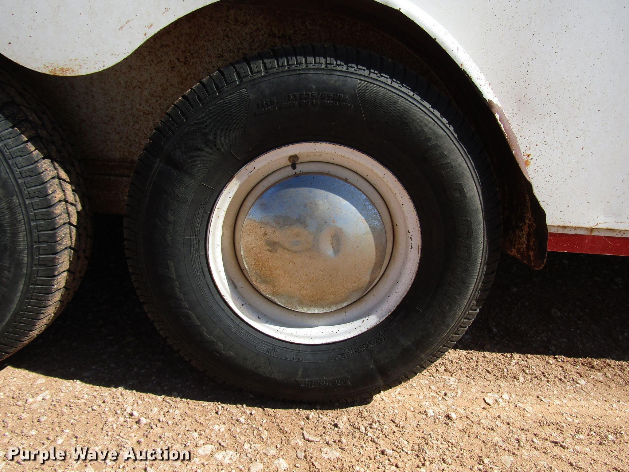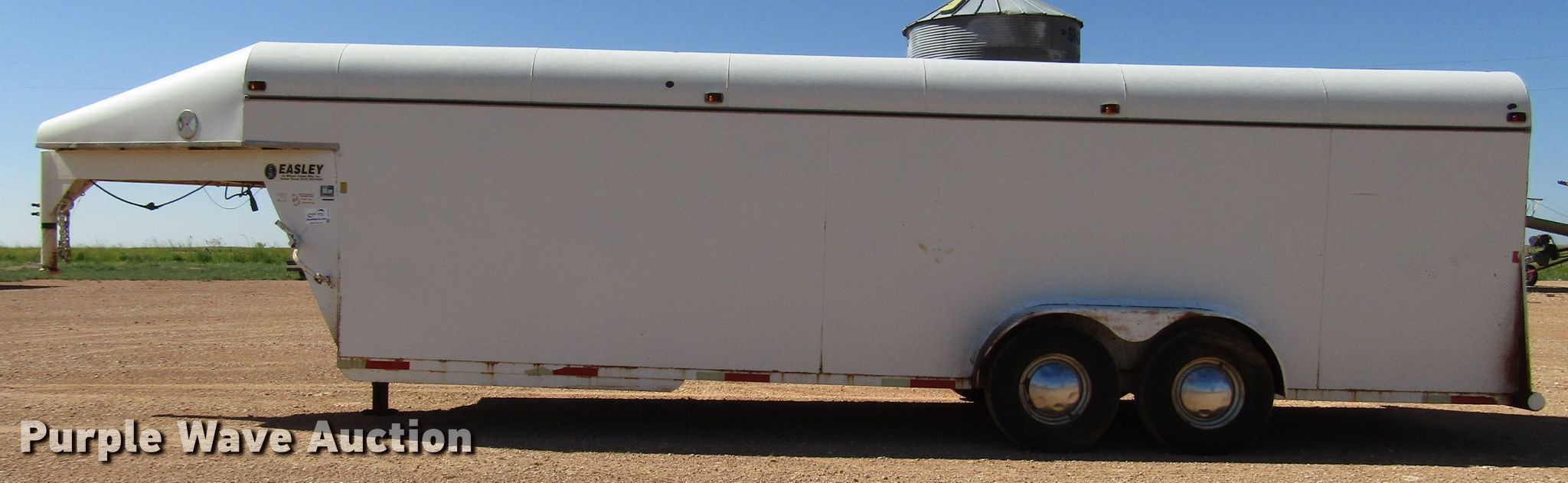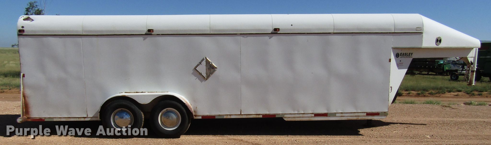 2002 Easley enclosed cargo trailer. 32' overall length, 24'L x 97"W steel floor, Refrigeration unit, Single leg landing gear, Spring suspension, Electric brakes, Tandem axle, Steel wheels, 235/85R16 tires, GVWR 7,257 lbs. Texas title. Title distribution may be delayed up to 30 days from verification of funds. 4AUVG24292A132835. Black Hills Land & Cattle. Muleshoe, TX 79347