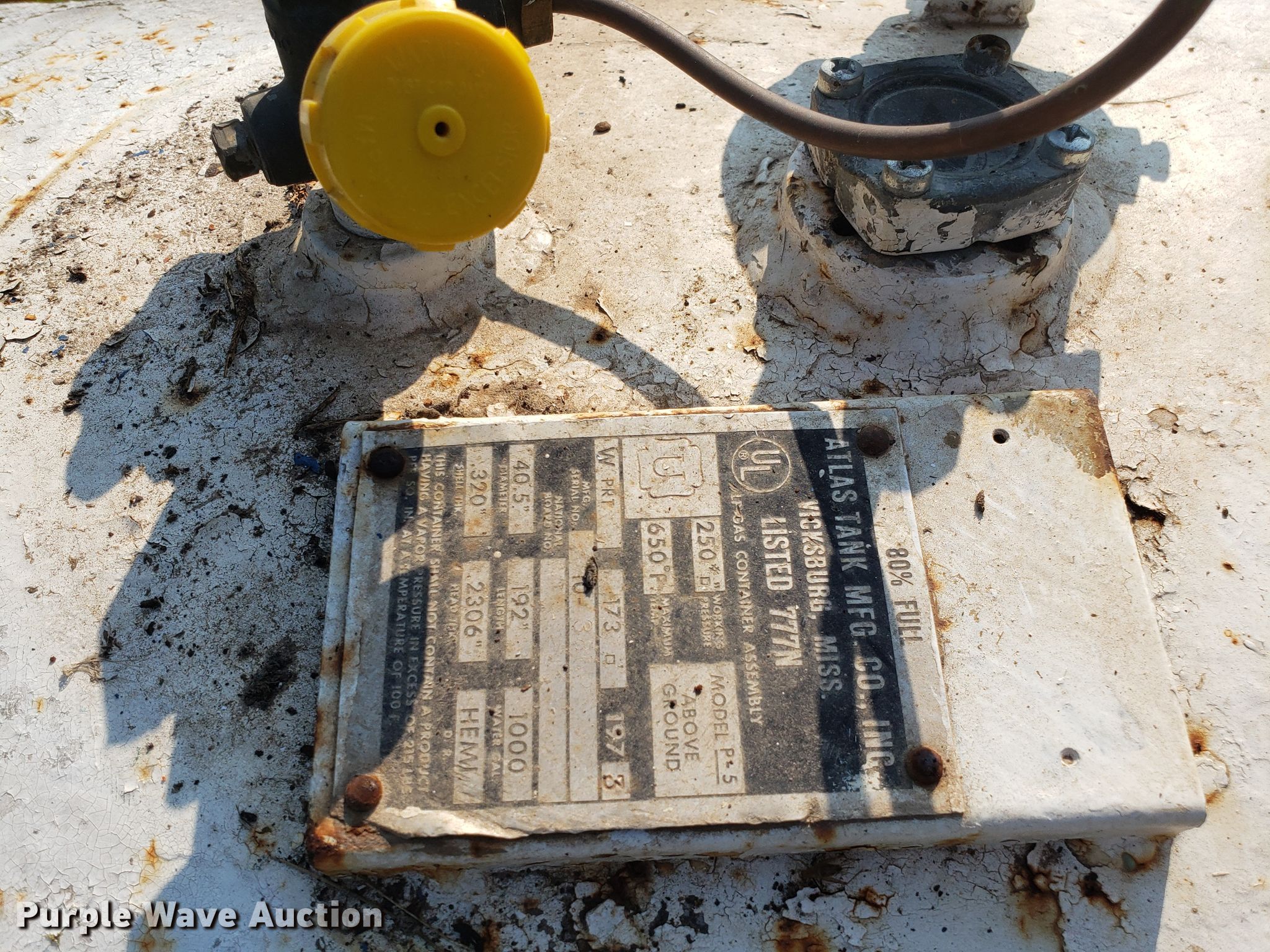 Purple Wave is selling a used Fuel and Lube in Missouri. This item is a Atlas propane tank with the following: 1,000 gallon capacity
