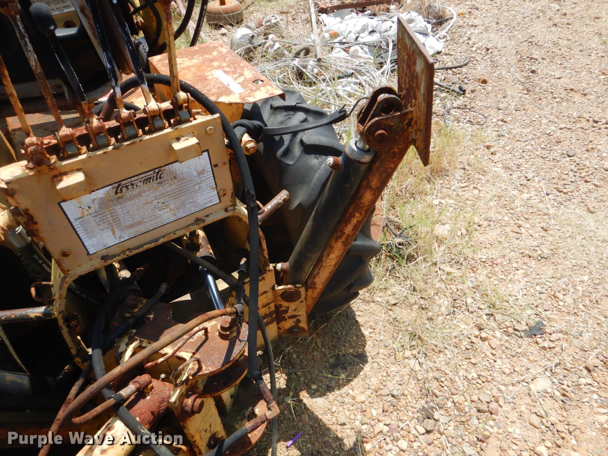 Purple Wave is selling a used Tractor Loader Backhoe in Oklahoma. This item is a Terramite T5C backhoe with the following: Kohler 725cc two cylinder gas engine, 20 HP, Hydrostatic transmission, Four stick backhoe controls, 4'W loader bucket, 0.25 cu.yd. capacity, Weld-on cutting edge, Hydraulic quick coupler, 24"W backhoe bucket, (3) teeth, 20.5 x 8 x 10 front tires, 9.5 x 16.5 rear tires, Non-operational unit, Hour meter broken