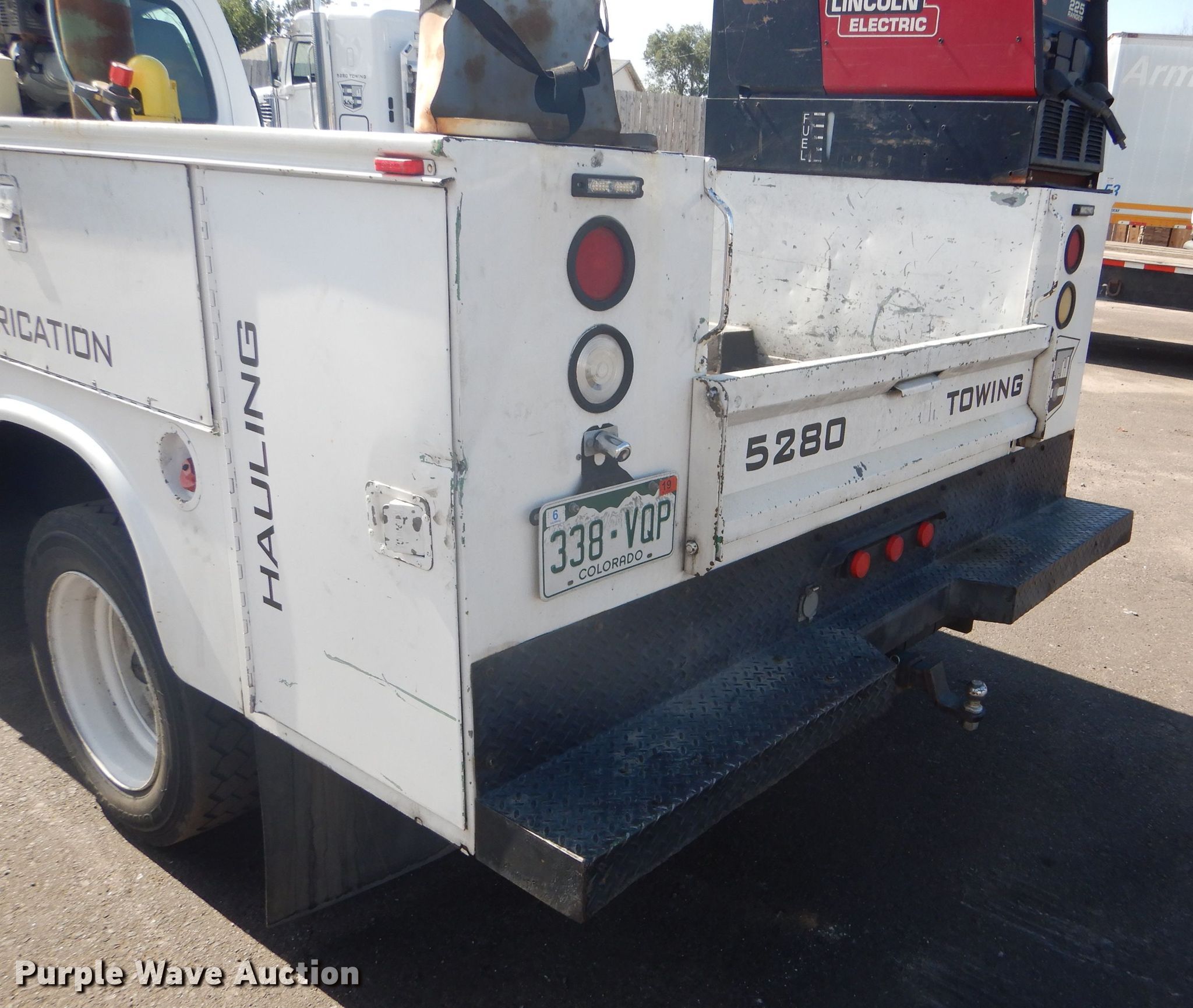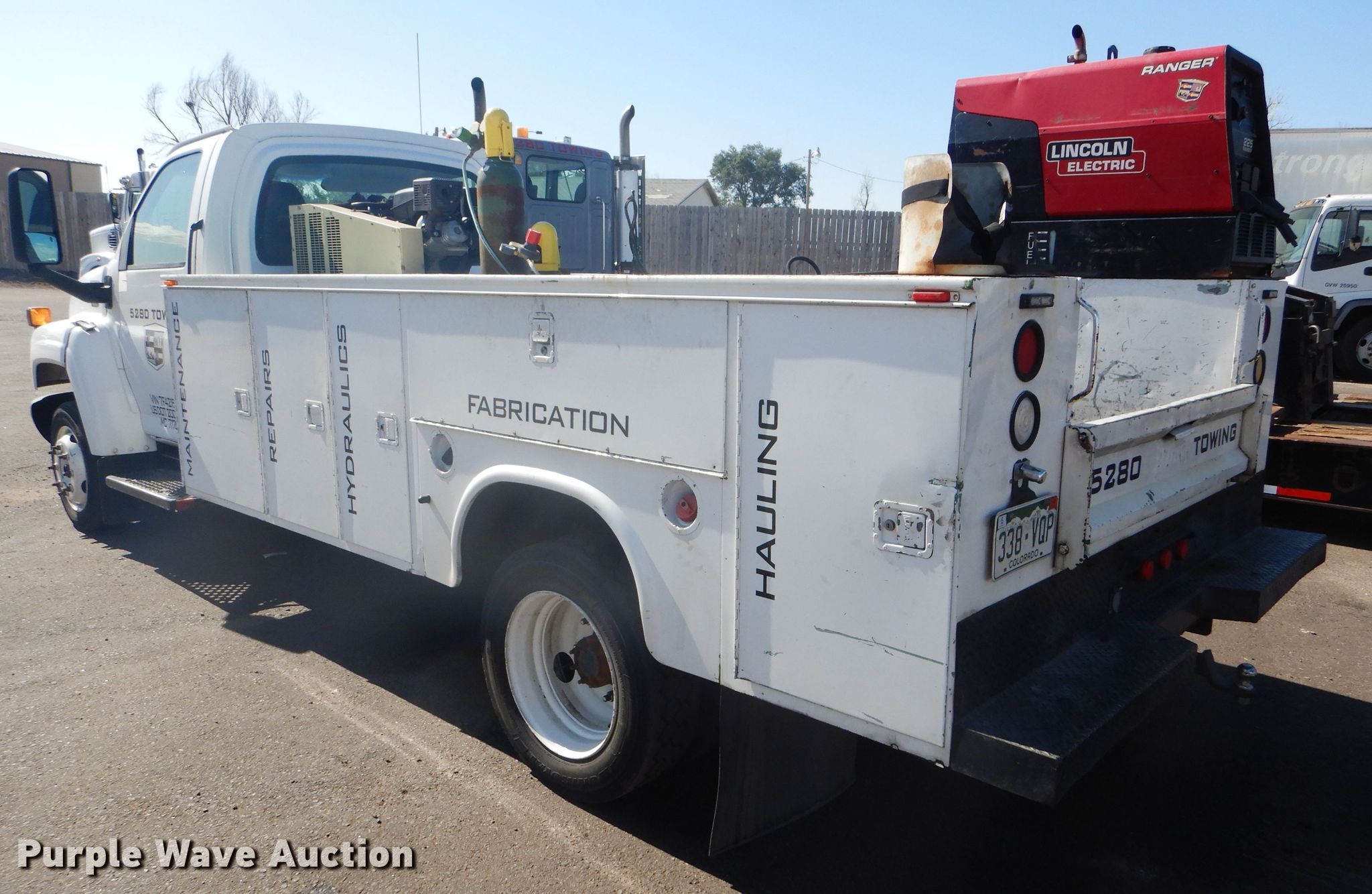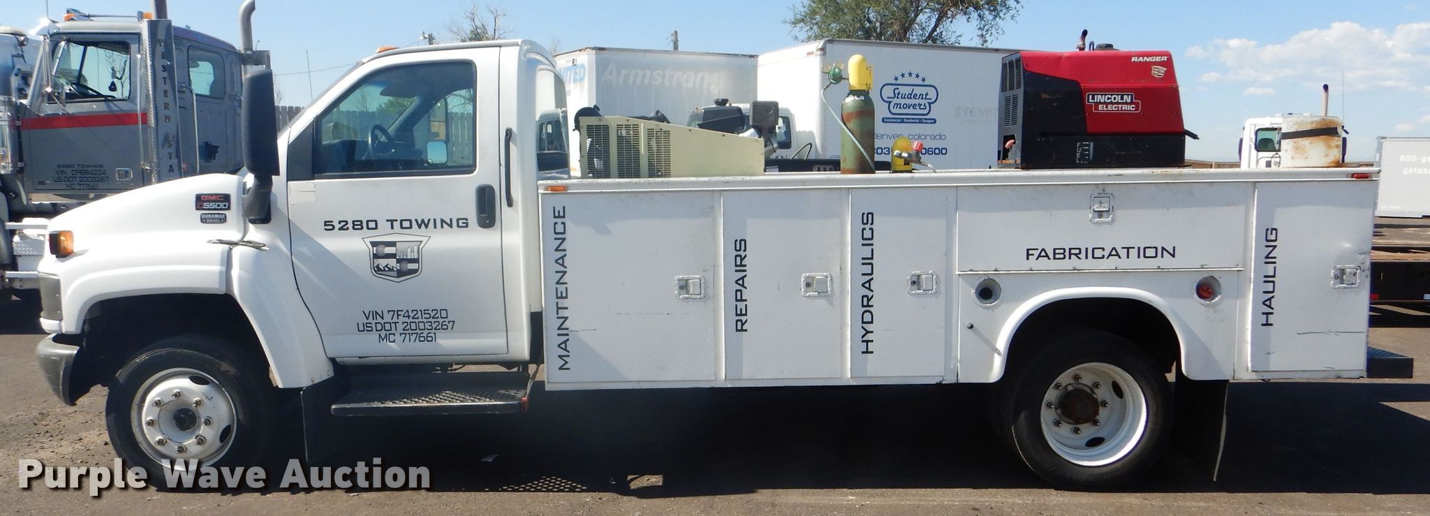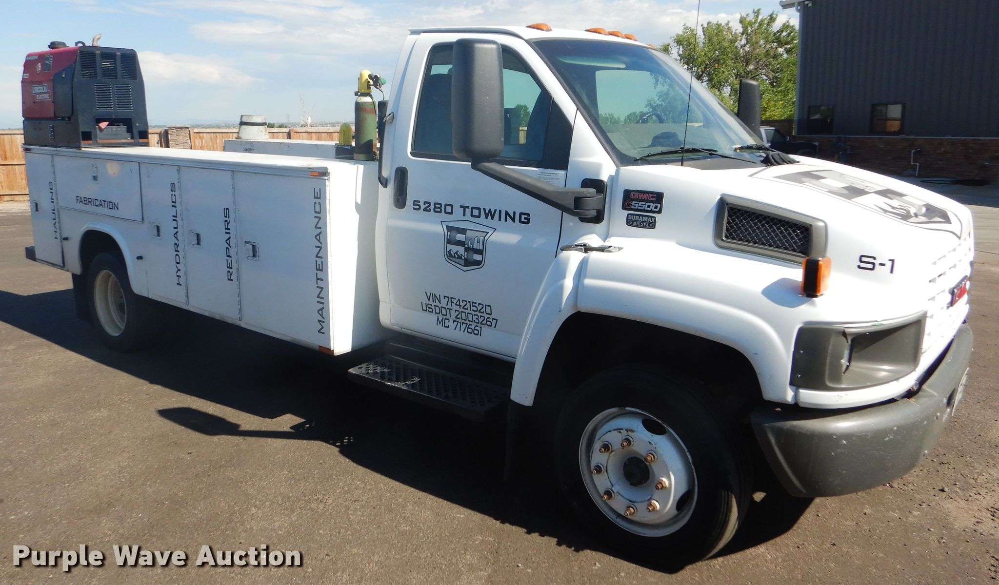 Purple Wave is selling a used Service Truck in Colorado. This item is a 2007 GMC C5500 service truck with the following: 274,559 miles on odometer, 6.6L V8 diesel engine, Allison automatic transmission, Single axle, AC and heat, Brake controller, Knapheide 6157D54J utility bed, 13'L, Torch bottle rack, Lincoln 225 Ranger welder/generator, 229 hours on meter, Gas engine, 240V outlet, (4) 120V outlets, Leads, AC/DC, Ingersoll Rand 2475F14G air compressor, Kohler Command Pro 14 gas engine, Oxygen and acetylene torch, Tools included, Spring suspension, Hydraulic brakes, 225/70R19.5 tires, GVWR 19,500 lbs