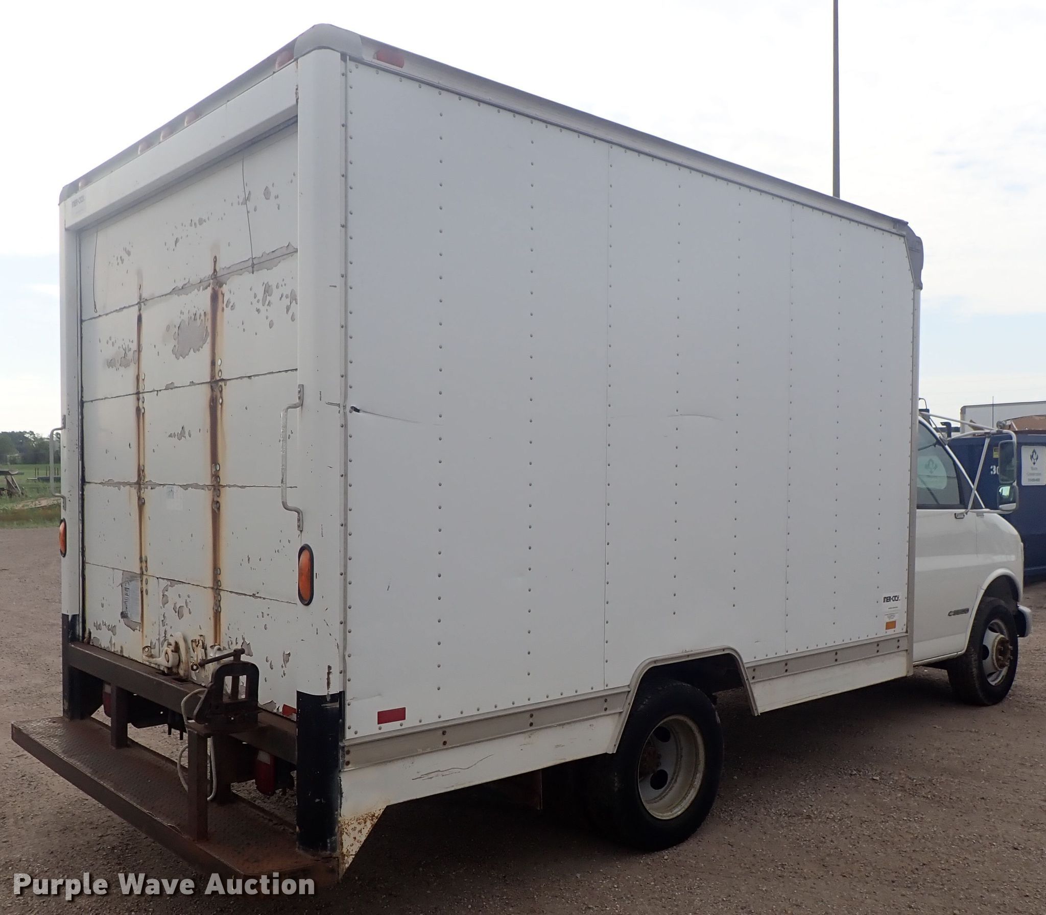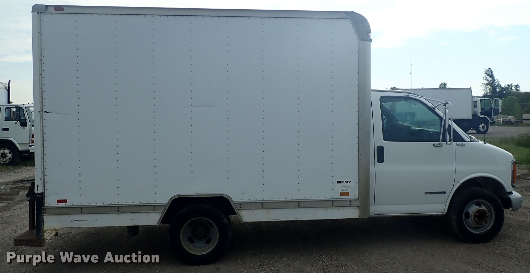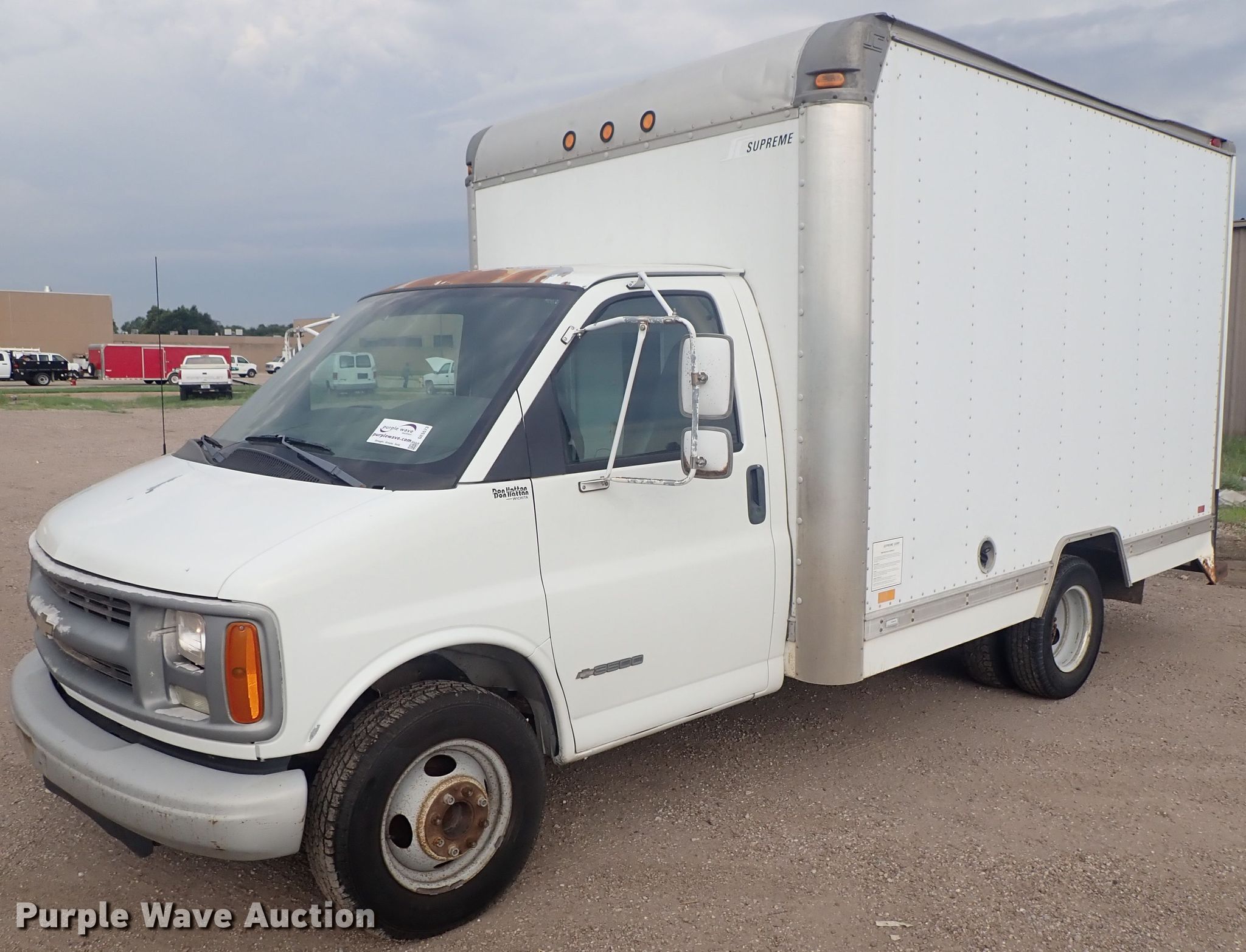 Purple Wave is selling a used Box Truck in Kansas. This item is a 2001 Chevrolet Express 3500 box truck with the following: 162,787 miles on odometer, 5.7L V8 OHV 16V gas engine, Automatic transmission, Single axle, AC and heat, Supreme box bed, 12'L x 96"W, Spring suspension, Hydraulic brakes, 225/75R16 tires, Weak battery