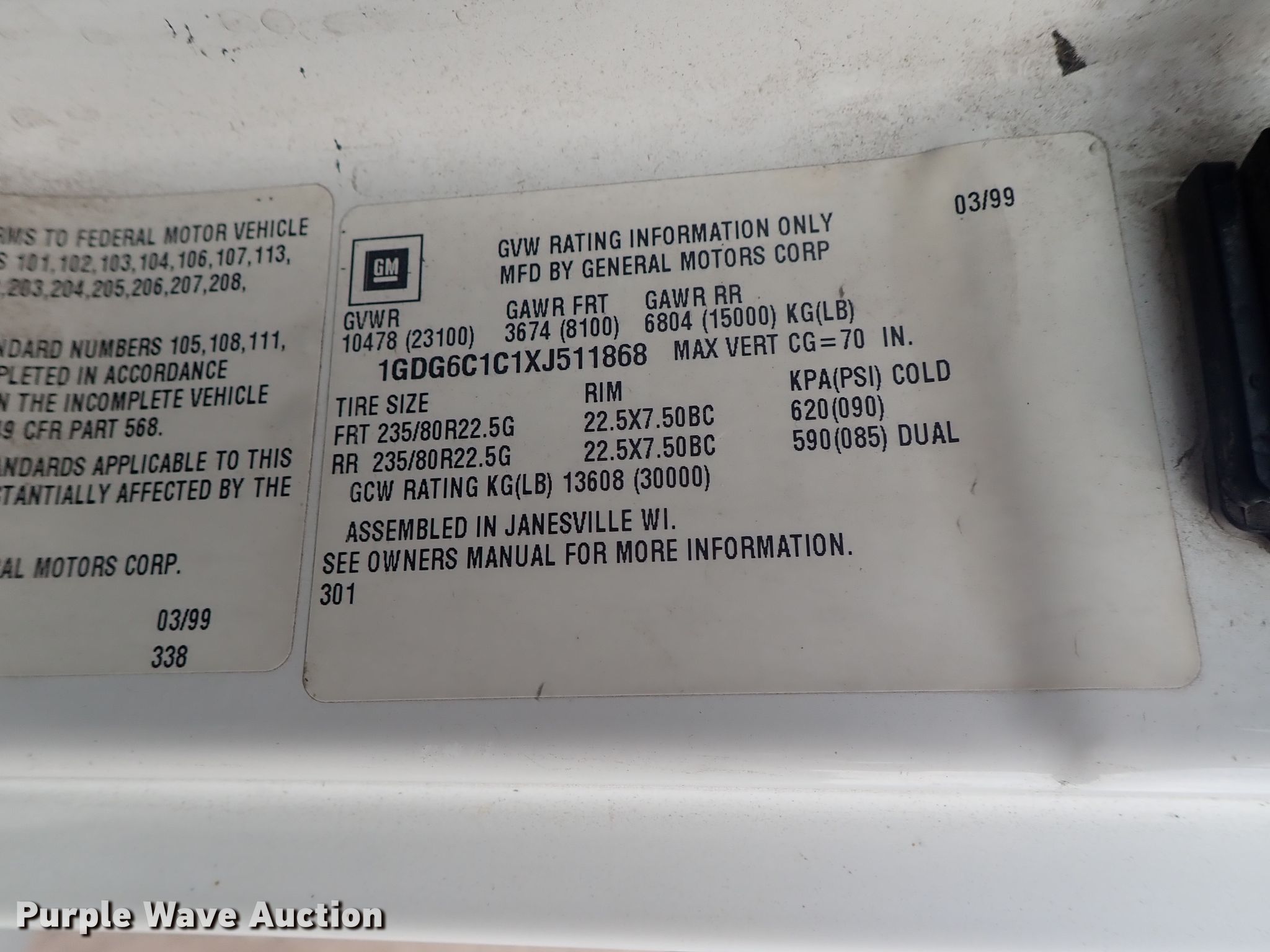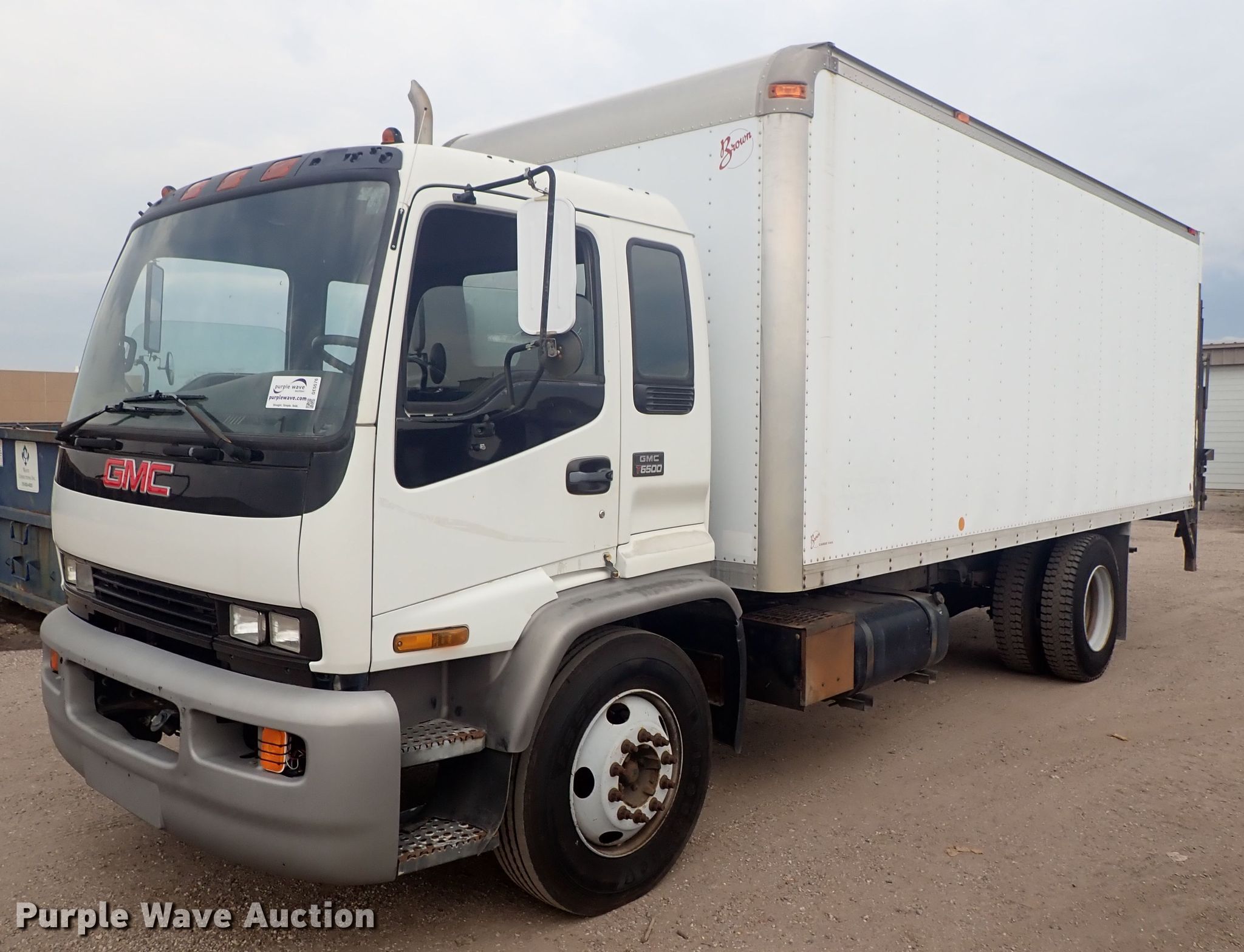 Purple Wave is selling a used Box Truck in Kansas. This item is a 1999 GMC T6500 box truck with the following: 214,281 miles on odometer, Caterpillar 3126 7.2L six cylinder diesel engine, Automatic transmission, Single axle, AC and heat, Brown box bed, 20'L x 96"W, Maxon RC-3B end gate lift, 3,000 lbs capacity,, Spring suspension, Hydraulic brakes, 10R22.5 tires, GVWR 23,100 lbs, Weak battery