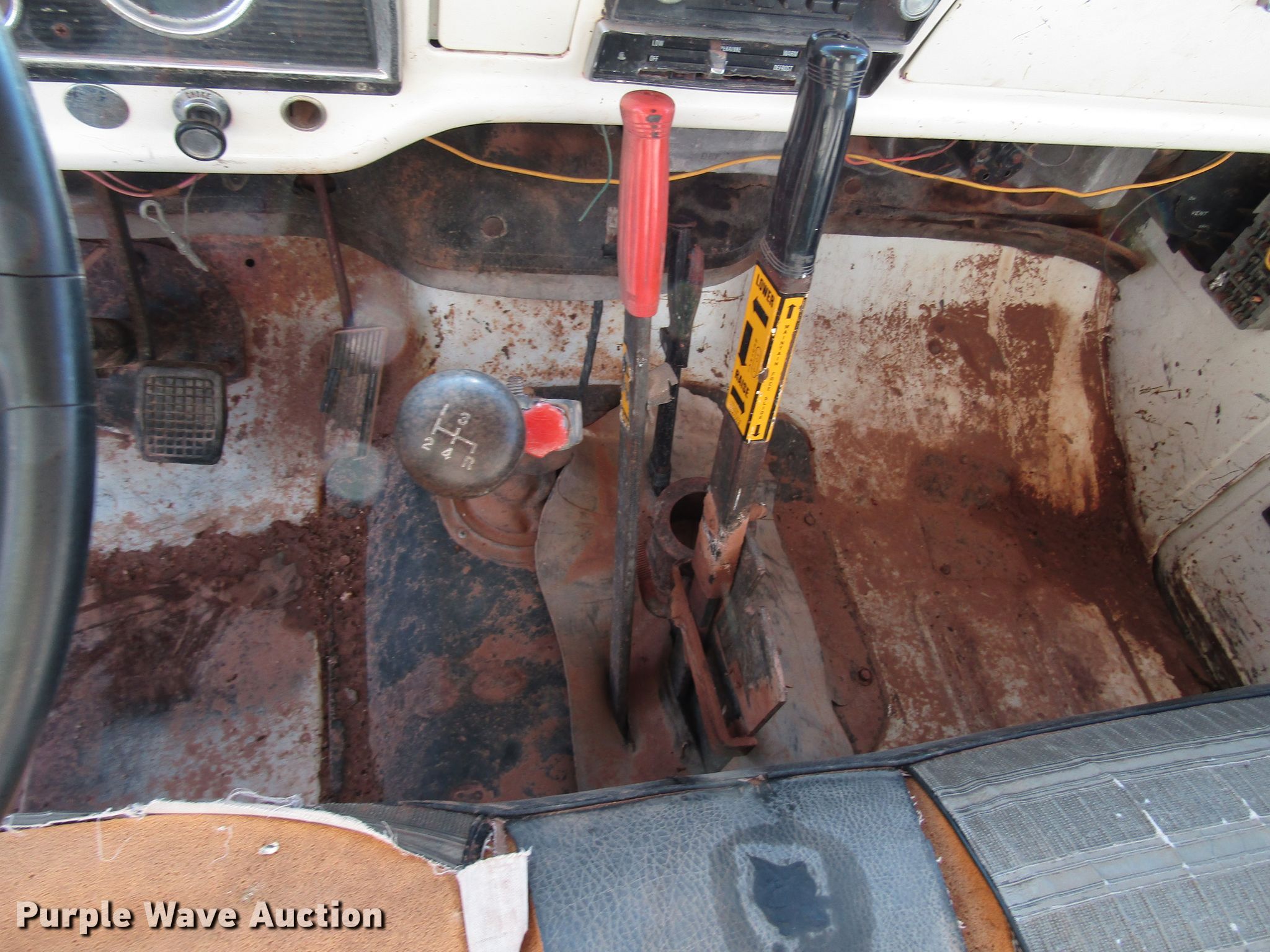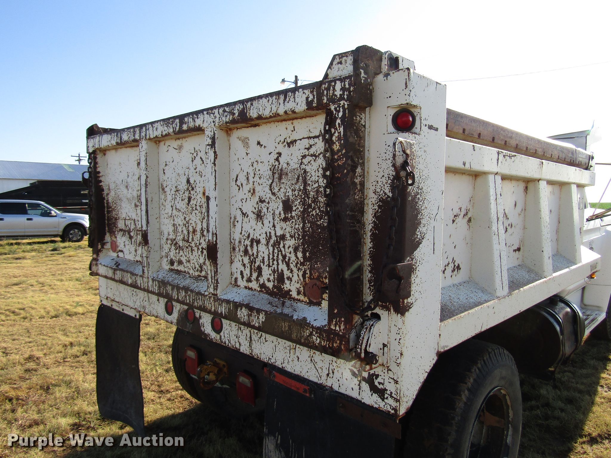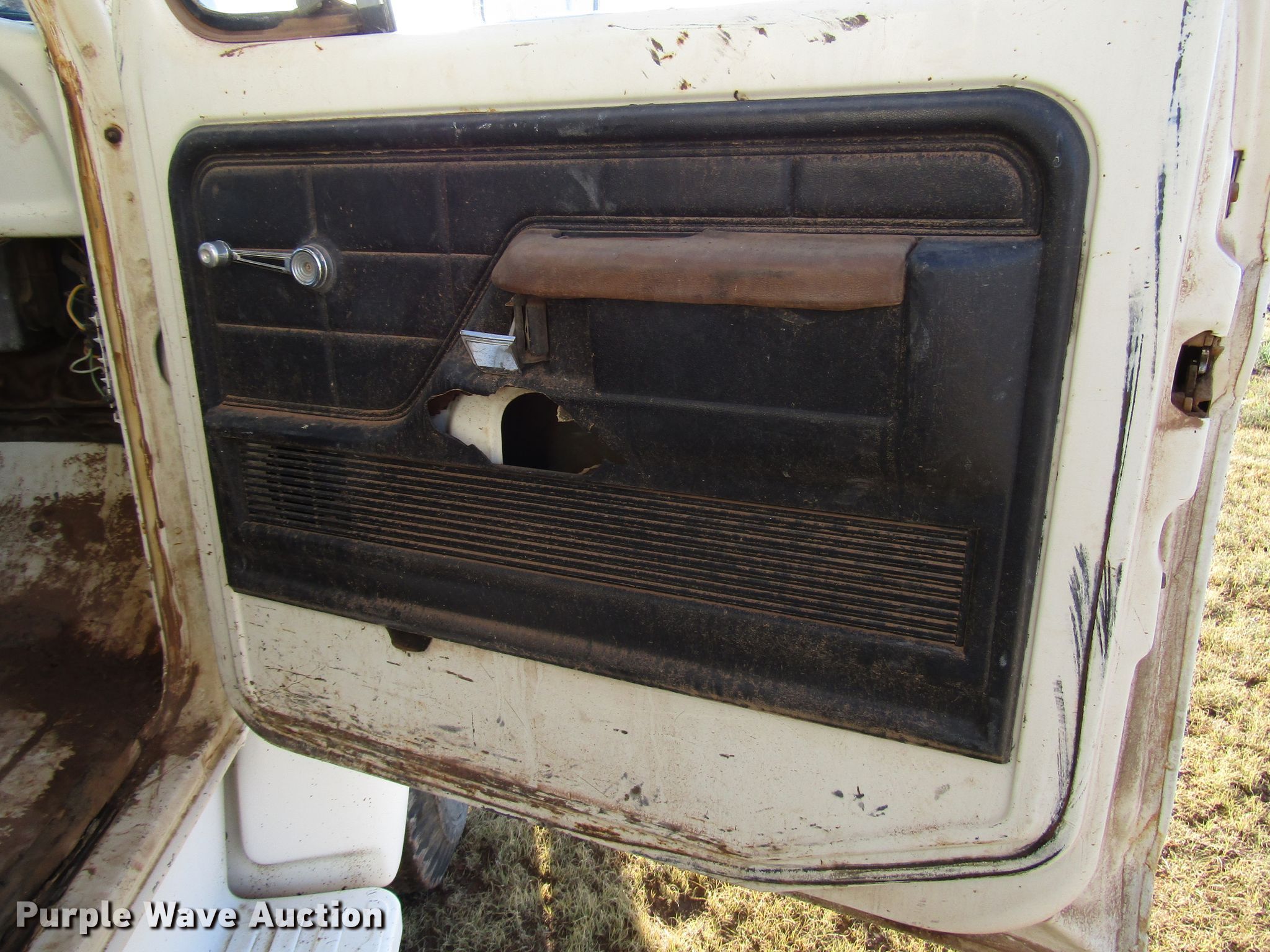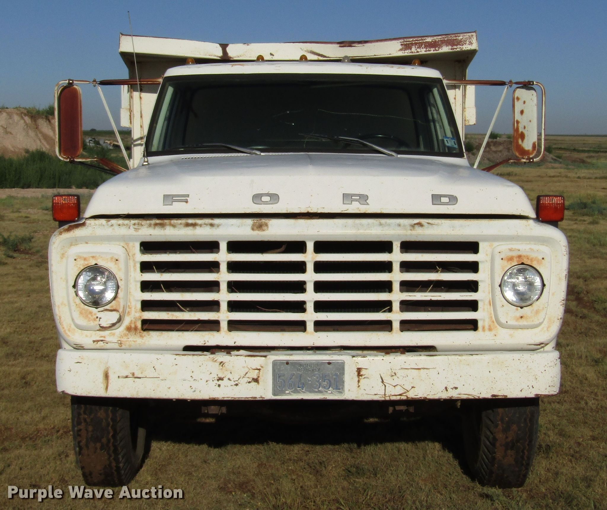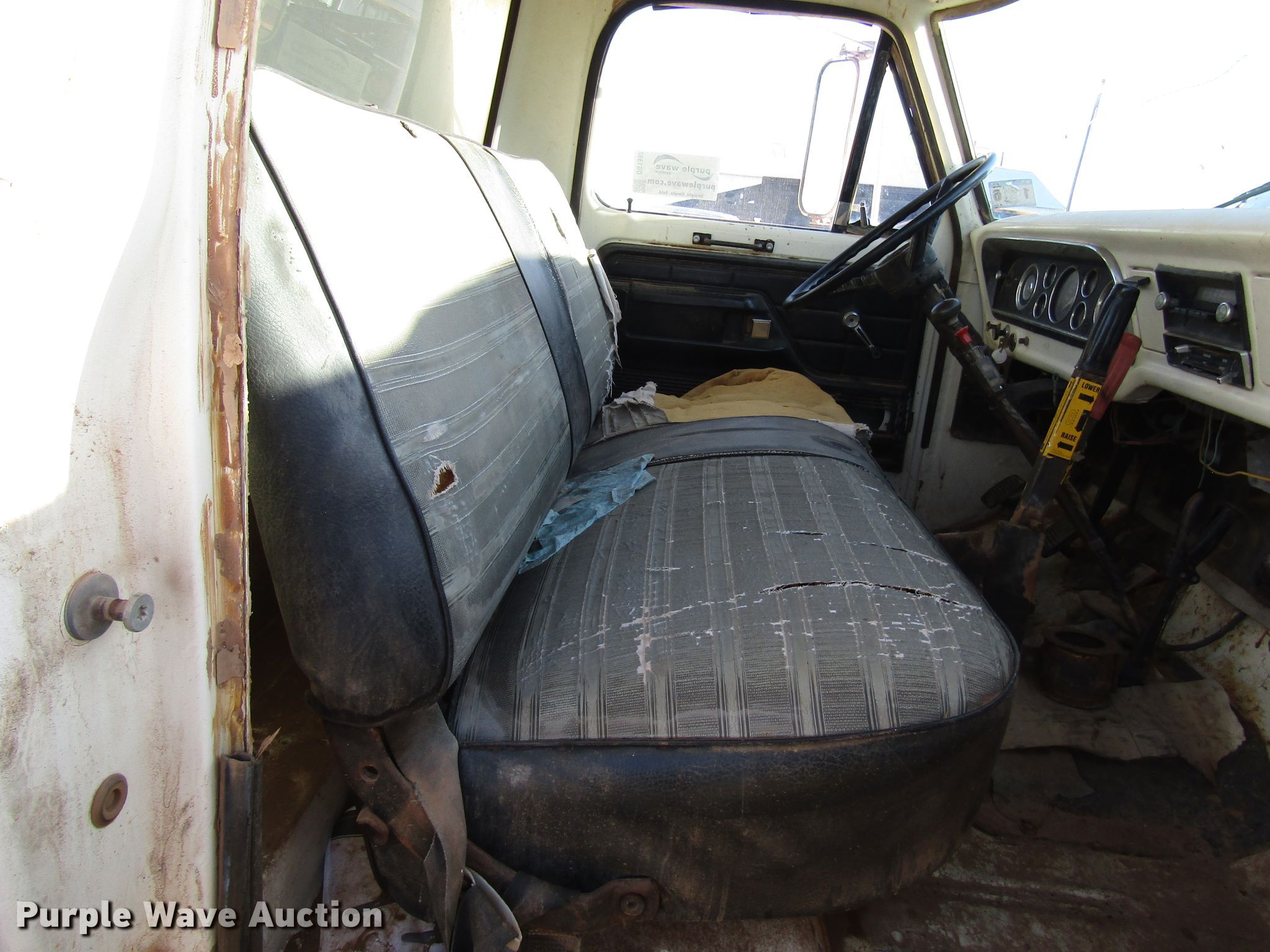 Purple Wave is selling a used Construction Dump Truck in Texas. This item is a 1977 Ford F600 dump truck with the following: 98,580 miles on odometer, Eight cylinder gas engine, Eight speed manual transmission, Single axle, Peabody 402F steel dump bed, 10'L x 96"W, 27" side height, 6" side board height, Single ram hoist, Manual end gate, Spring suspension, Hydraulic brakes, 194" wheelbase, 9.00-20 tires, GVWR 19,200 lbs, Cracked windshield