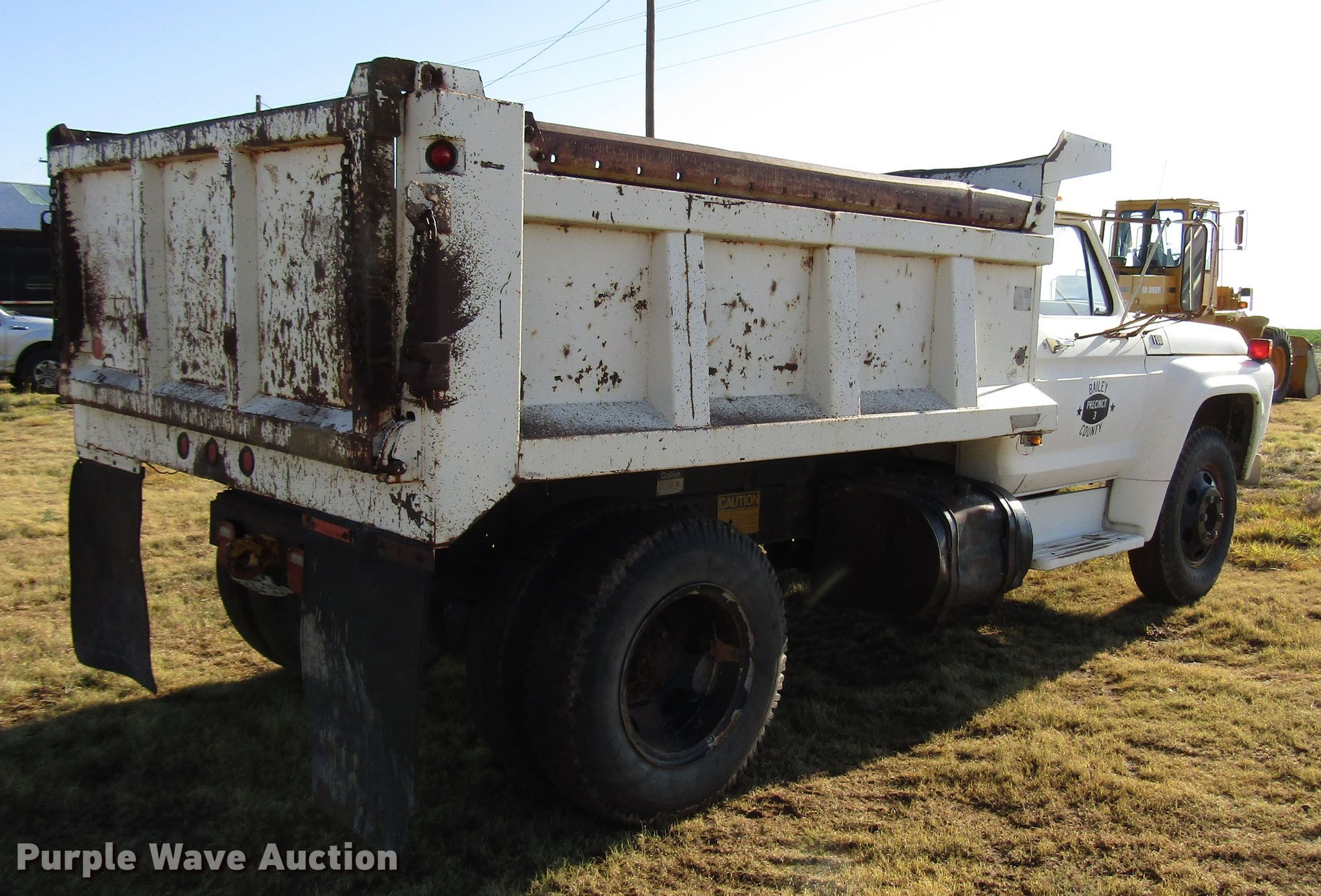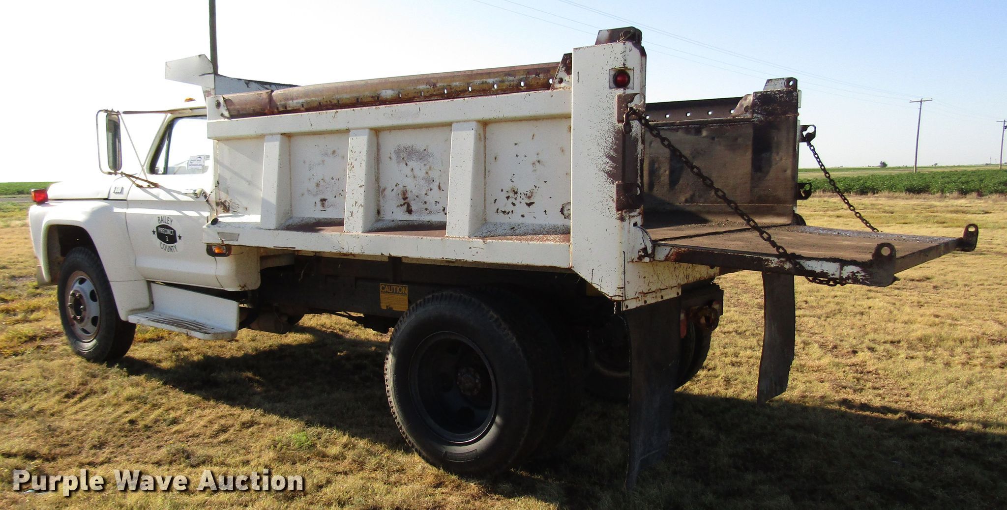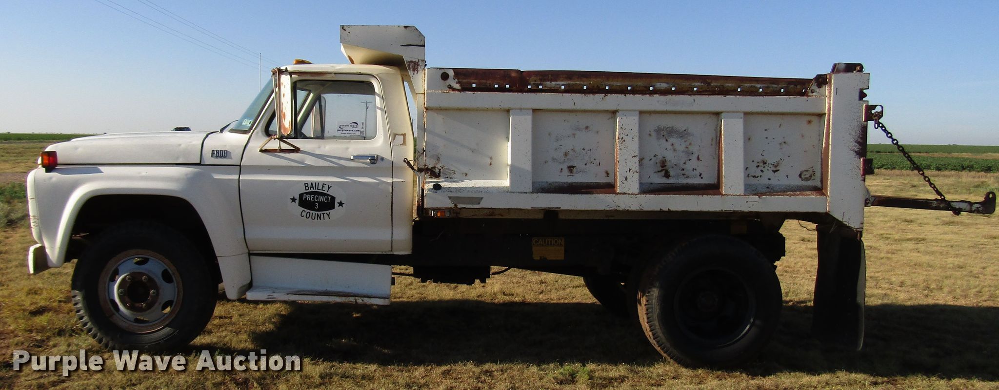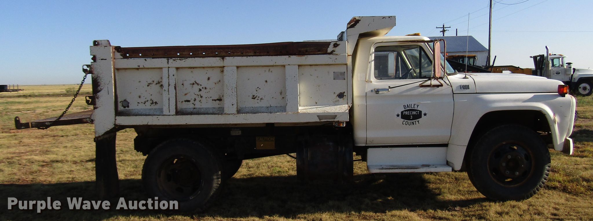 1977 Ford F600 dump truck. 98,580 miles on odometer, Eight cylinder gas engine, Eight speed manual transmission, Single axle, Peabody 402F steel dump bed 10'L x 96"W, 27" side height, 6" side board height, Single ram hoist, Manual end gate, Spring suspension, Hydraulic brakes, 194" wheelbase, 9.00-20 tires, GVWR 19,200 lbs, Cracked windshield. Texas title. Title distribution may be delayed up to 30 days from verification of funds. F60DV000348. Bailey County. 3019 SH 214. Enochs, TX 79324