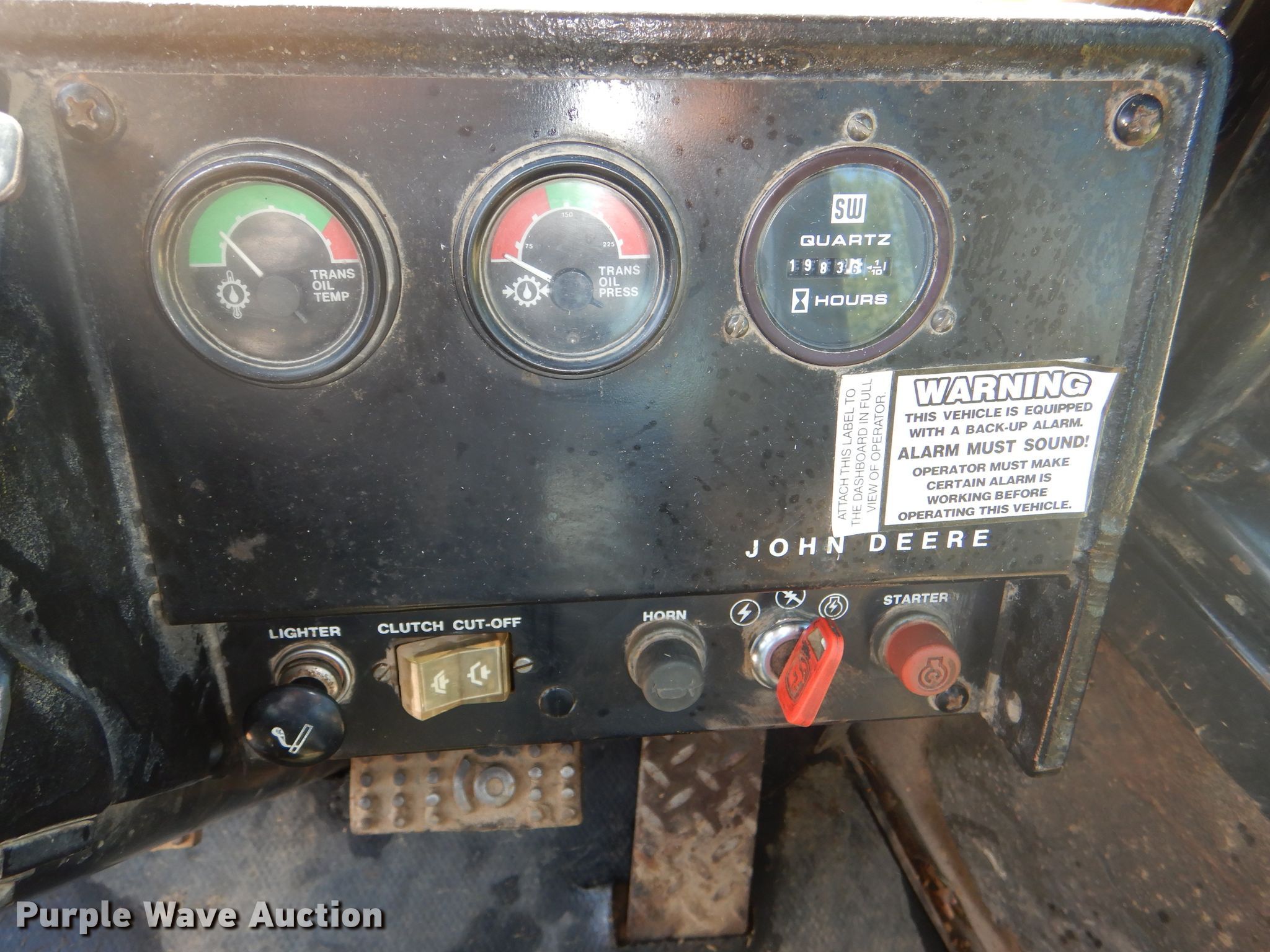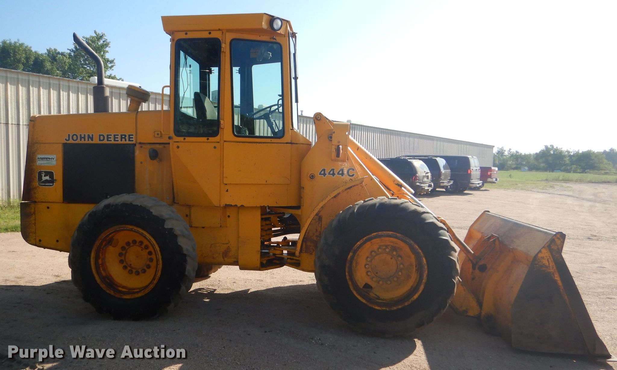 Purple Wave is selling a used Wheel Loader in Kansas. This item is a 1983 John Deere 444C wheel loader with the following: 1,983 hours on meter, John Deere six cylinder diesel engine, Serial 609386T, Powershift transmission, 4F-2R gears, Enclosed cab, Heat, John Deere 86"W general purpose bucket, Bolt-on cutting edge, 1.5 cu. yd. capacity, Titan 15.5-25 tires, Serial DW444CB407097