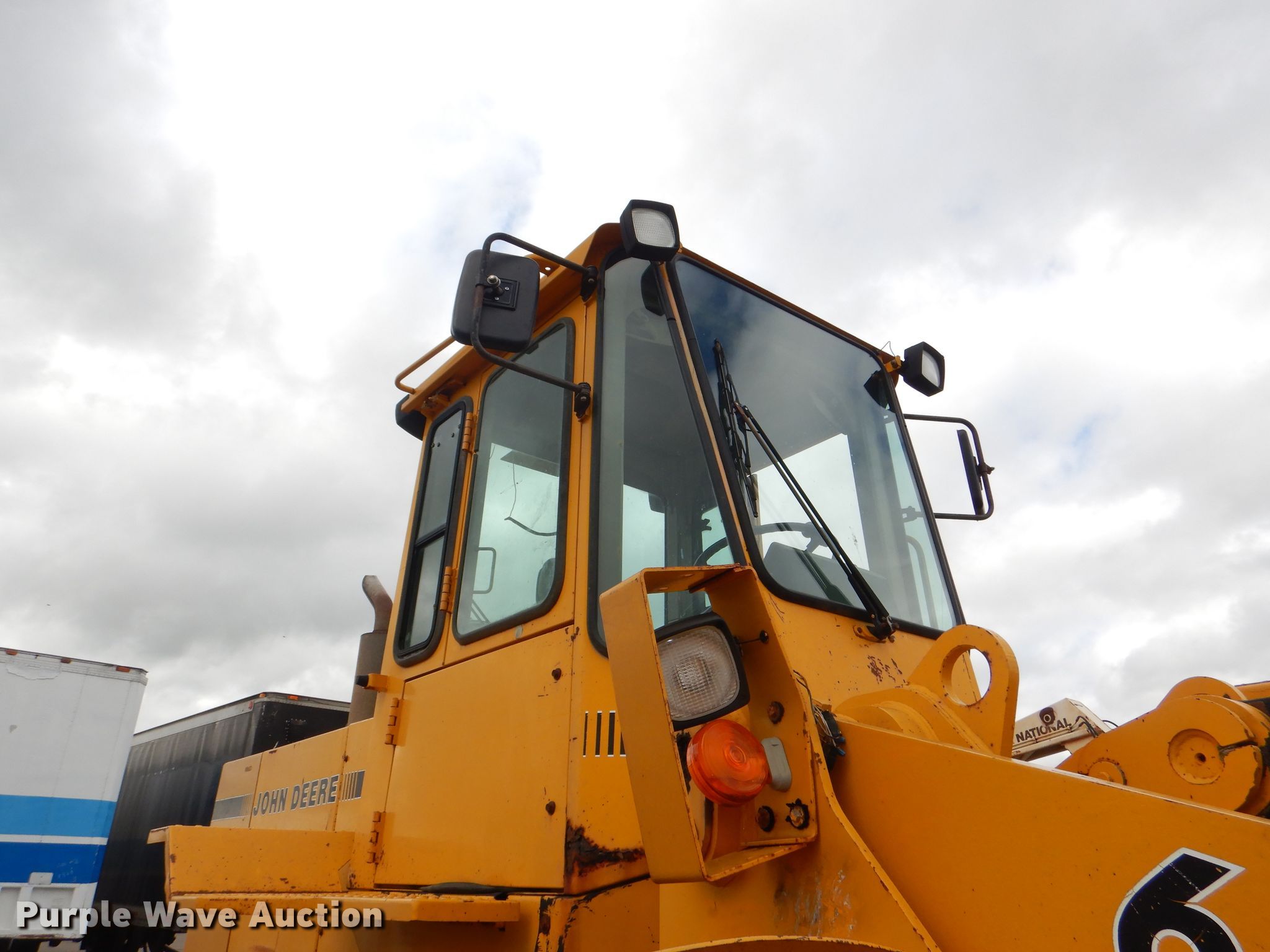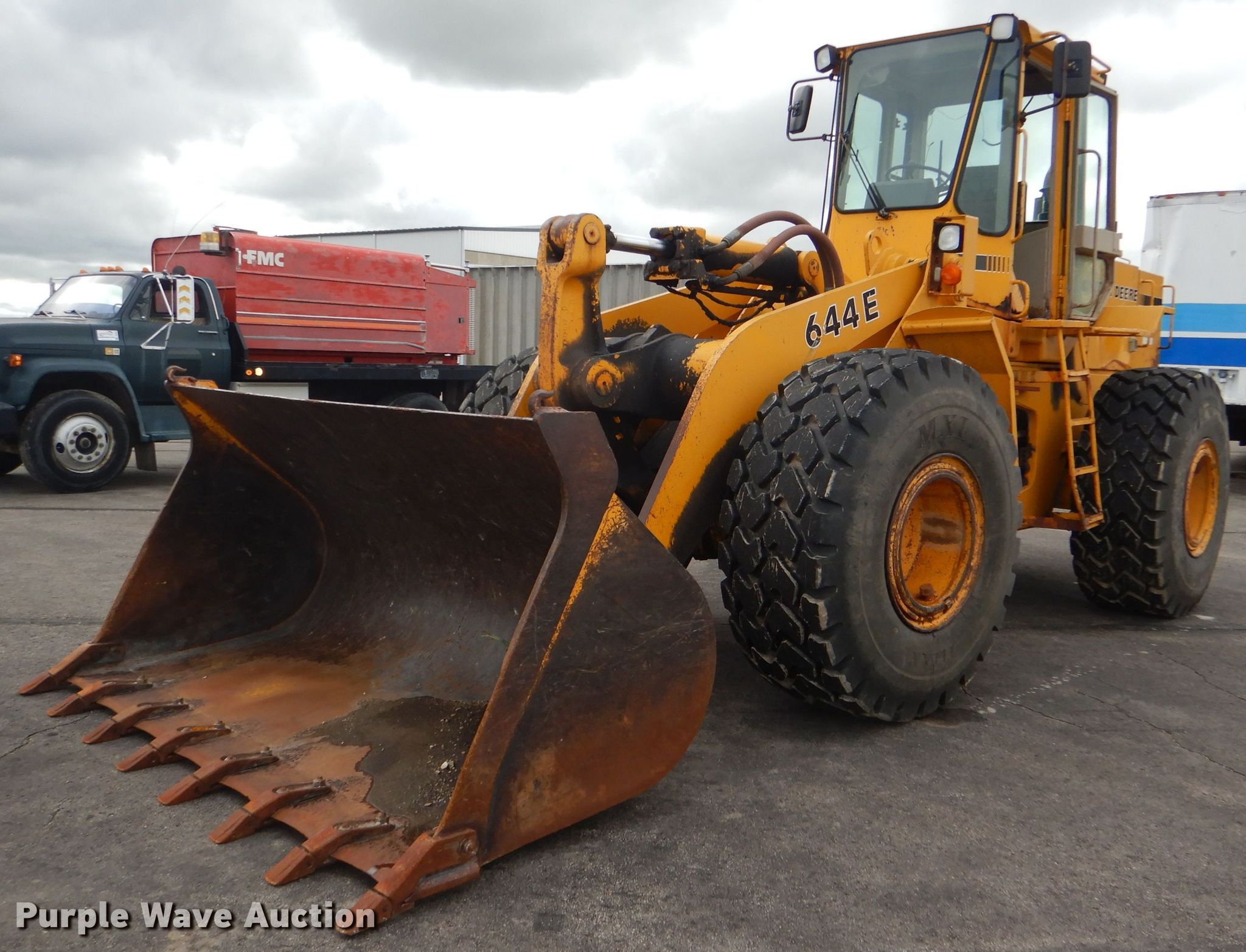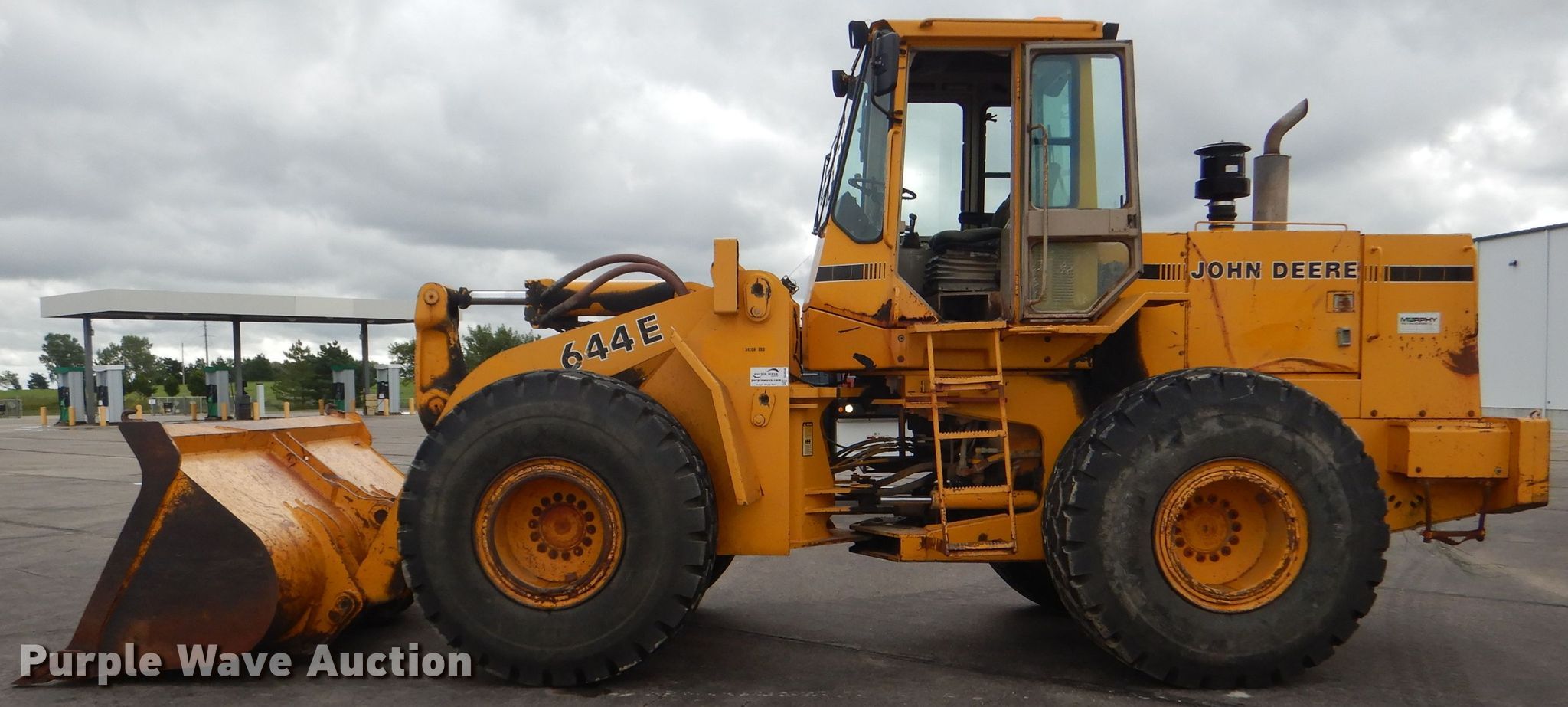 Purple Wave is selling a used Wheel Loader in Kansas. This item is a 1990 John Deere 644E wheel loader with the following: 7,730 hours on meter, Six cylinder diesel engine, Powershift transmission, Enclosed cab, AC and heat, 107"W general purpose bucket, Bolt-on cutting edge, (8) teeth, 3.75 cu. yd. capacity, Counterweight, Titan 23.5R25 tires, Cracked glass, Serial DW644EB528165, Unit# 606
