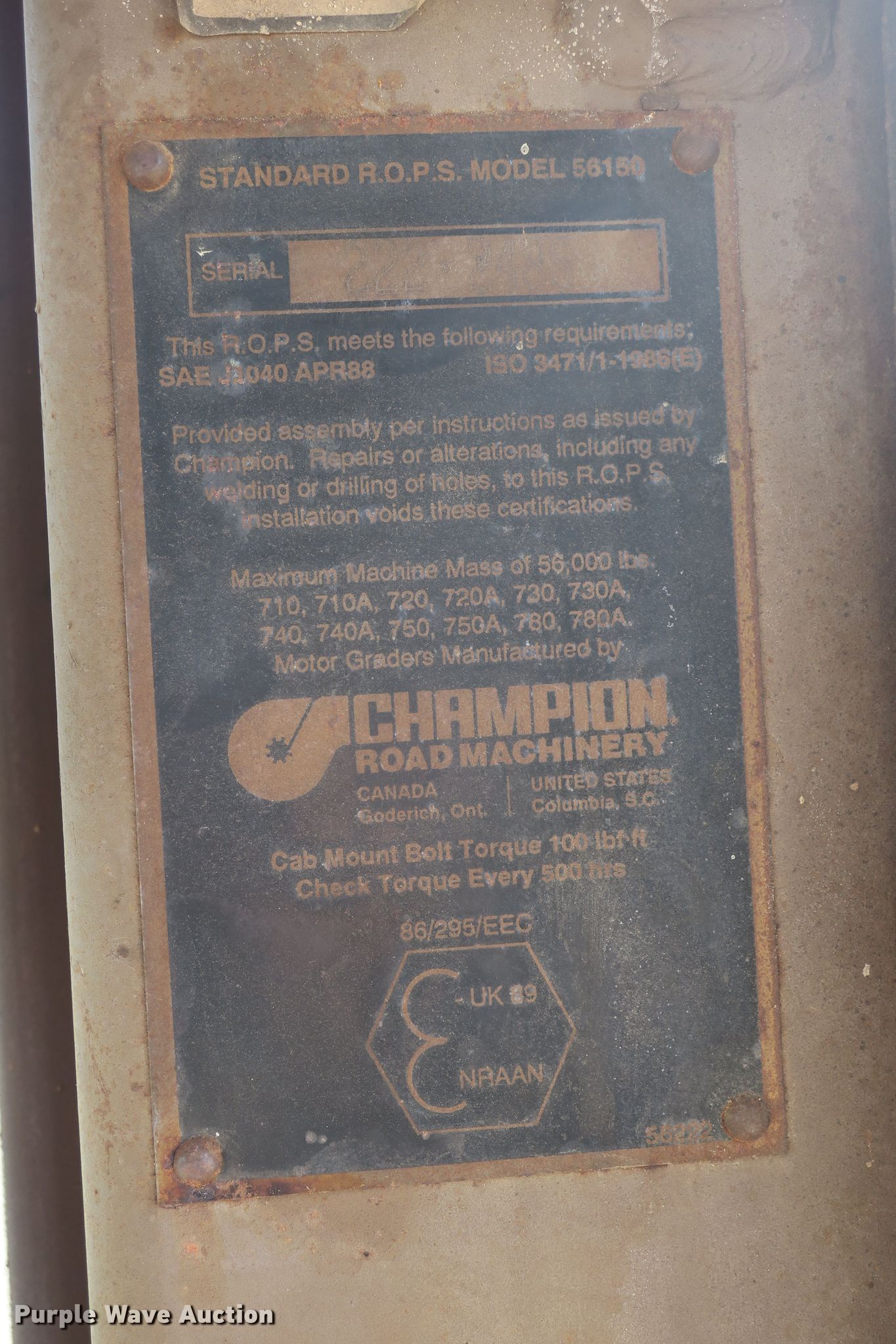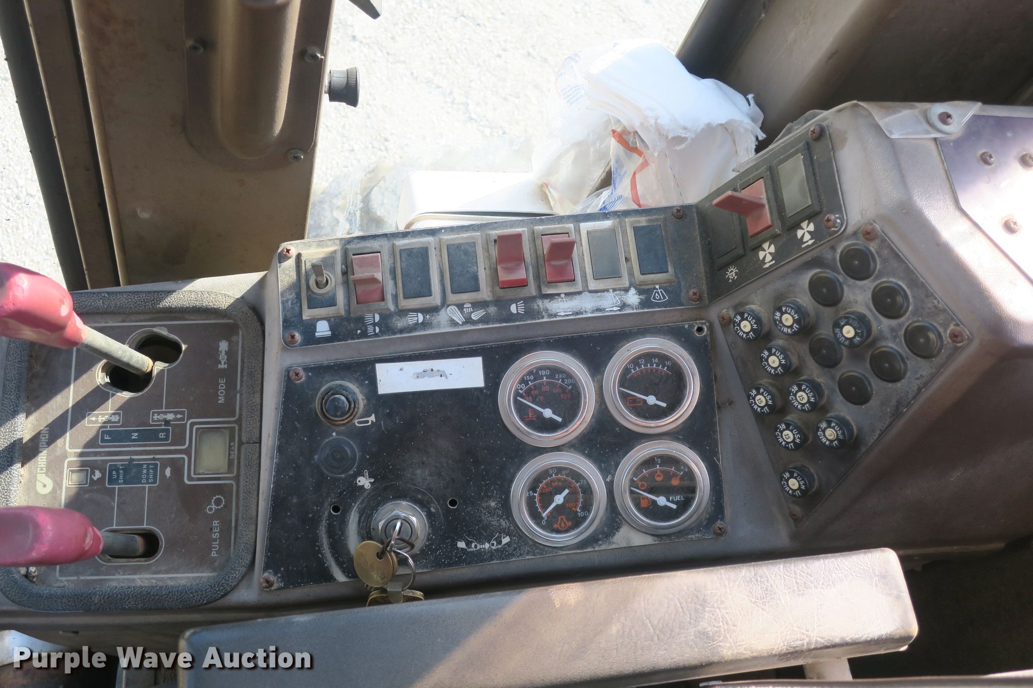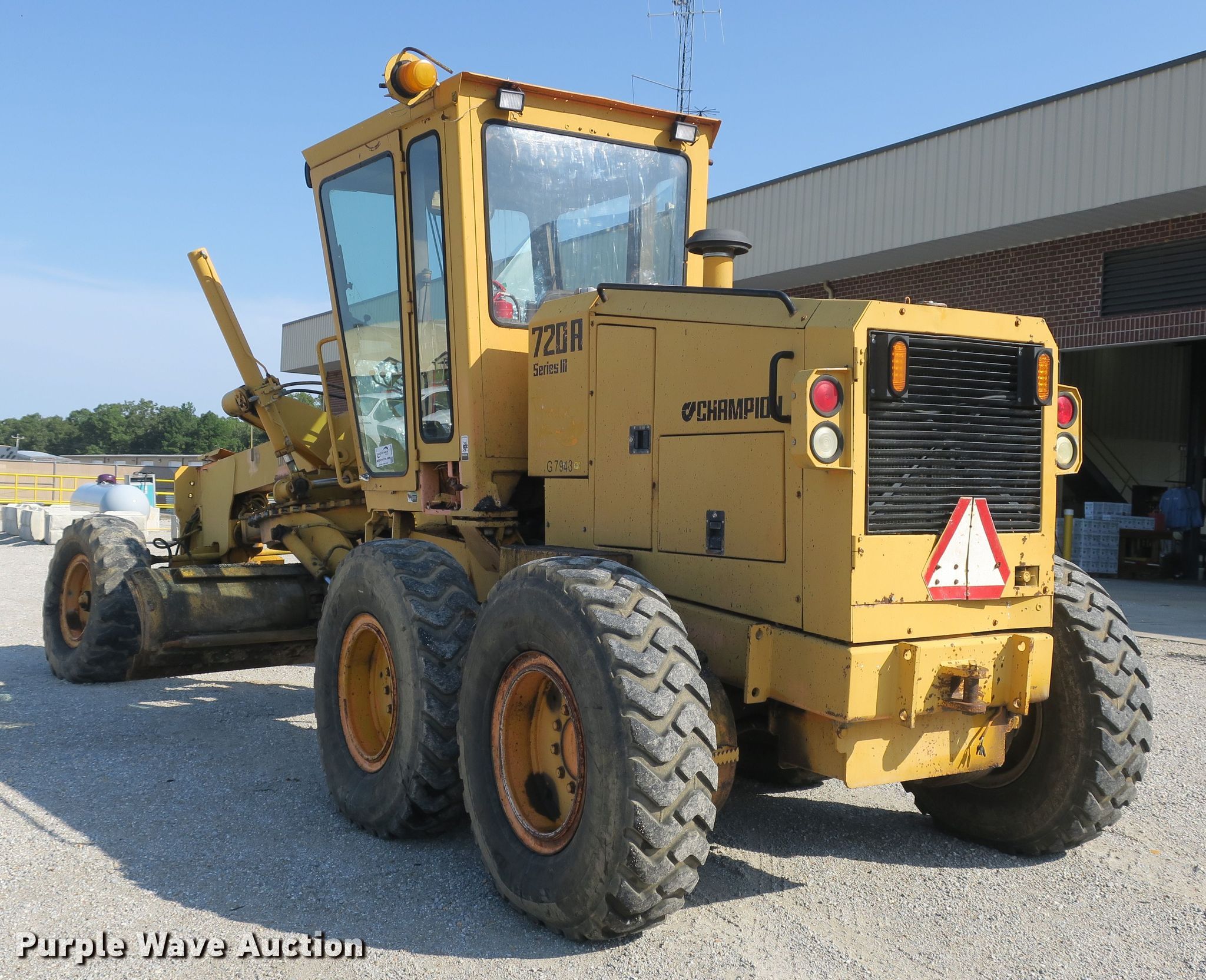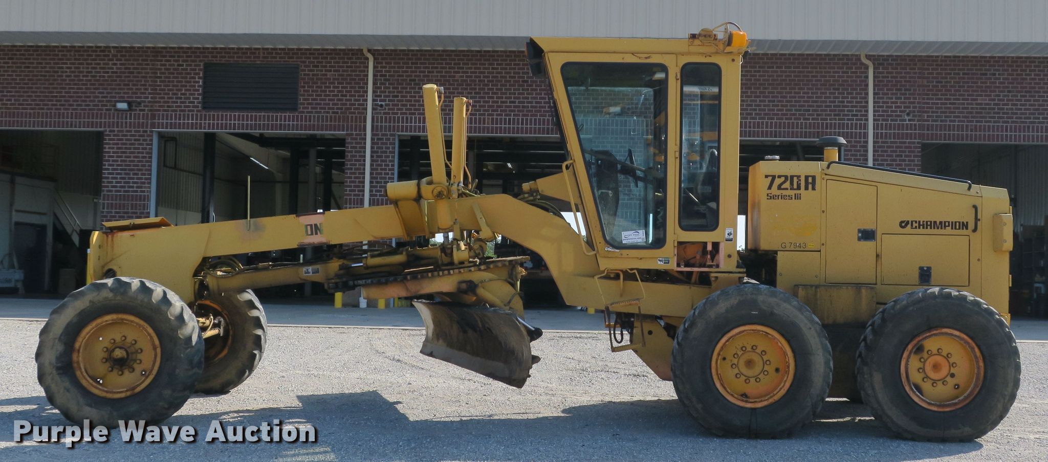 Purple Wave is selling a used Motor Grader in Missouri. This item is a 1993 Champion 720A motor grader with the following: 6,511 hours on meter, Six cylinder diesel engine, Powershift transmission, 8F-4R gears, Enclosed cab, Heat, Eight control valves, 12'W moldboard, Tip control, Side shift, 14.00-24 tires, Needs a muffler, Serial 720A-187-1528-23321, MODOT ID G7943