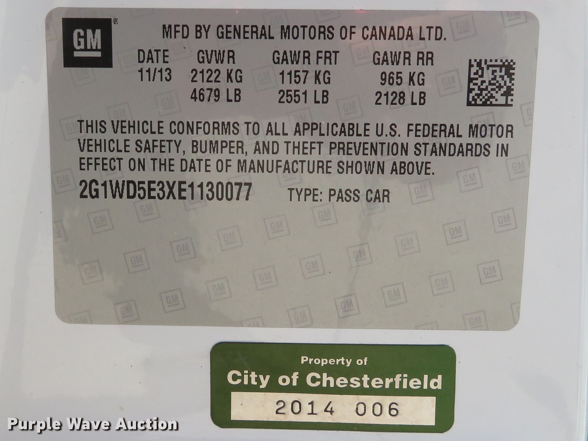 2014 Chevrolet Impala Limited Police Cruiser. 96,075 miles on odometer, 3.6L V6 DOHC 16V FFV gas engine, Automatic transmission, AC and heat, Cruise, Power windows, locks, and seats, P235/55R17 tires. Missouri title. 2G1WD5E3XE1130077. City of Chesterfield. Chesterfield, MO 63017