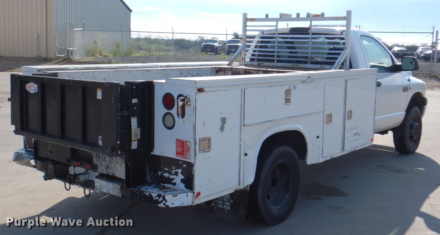 Purple Wave is selling a used 3/4 or 1 Ton Pickup or Van in Texas. This item is a 2008 Dodge Ram 3500 utility bed pickup truck with the following: 111,844 miles on odometer, 6.7L L6 OHV 24V diesel engine, Automatic transmission, AC and heat, Knapheide utility bed, 11'L, Tommy Gate end gate lift, 1,300 lbs capacity, Serial 00592438,, Michelin 235/80R17 tires, Check engine light on, Check gauges light on, Non-operational AC, Compressor is locked up and shreds belts, Non-operational power brakes