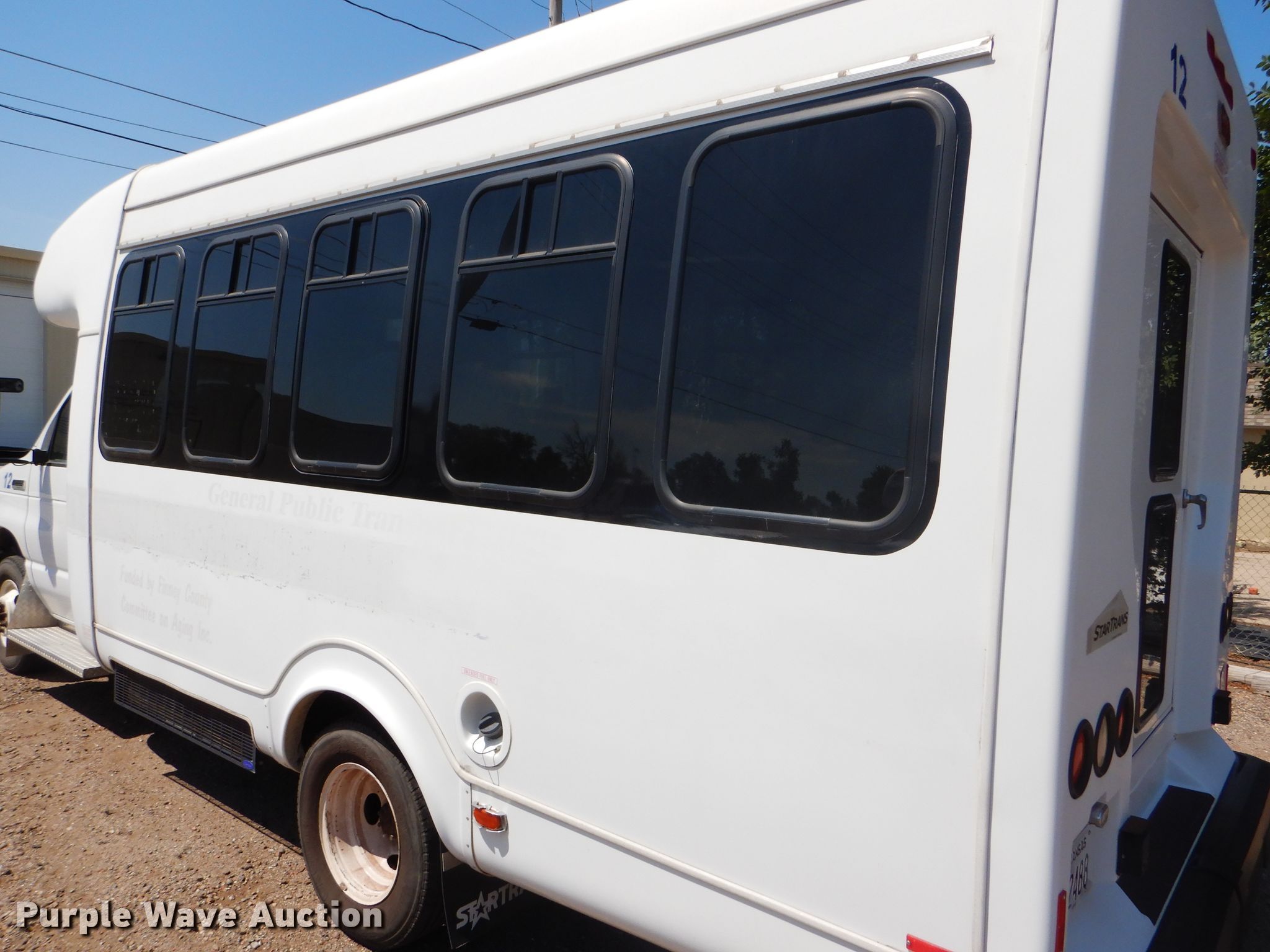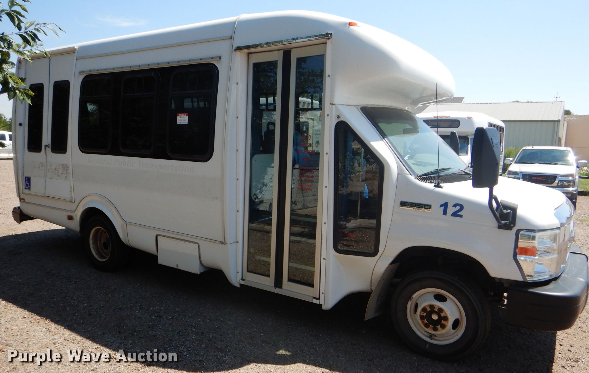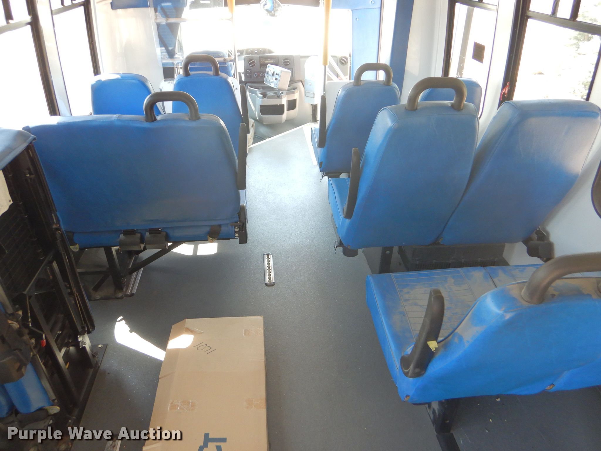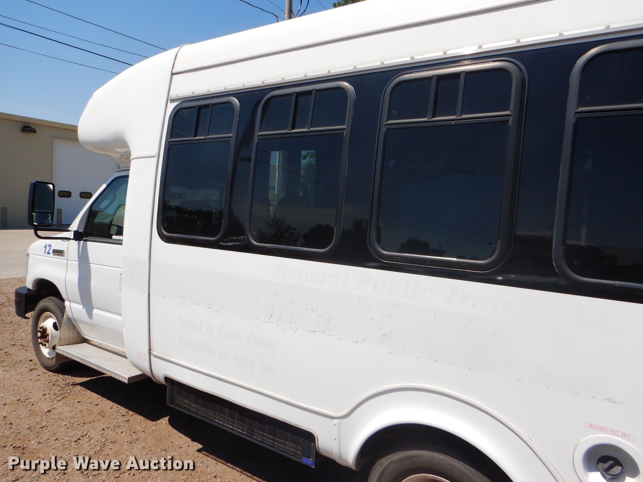 Purple Wave is selling a used Bus in Kansas. This item is a 2009 Ford E350 Super Duty shuttle bus with the following: 100,630 miles on odometer, 6.8L V10 SOHC 20V gas engine, Automatic transmission, Single axle, AC and heat, Auxiliary controls, Electric passenger sliding door, 12 passenger capacity, Braun wheelchair lift, Spring suspension, Hydraulic brakes, 158" wheelbase, 225/75R16 tires, GVWR 12,500 lbs