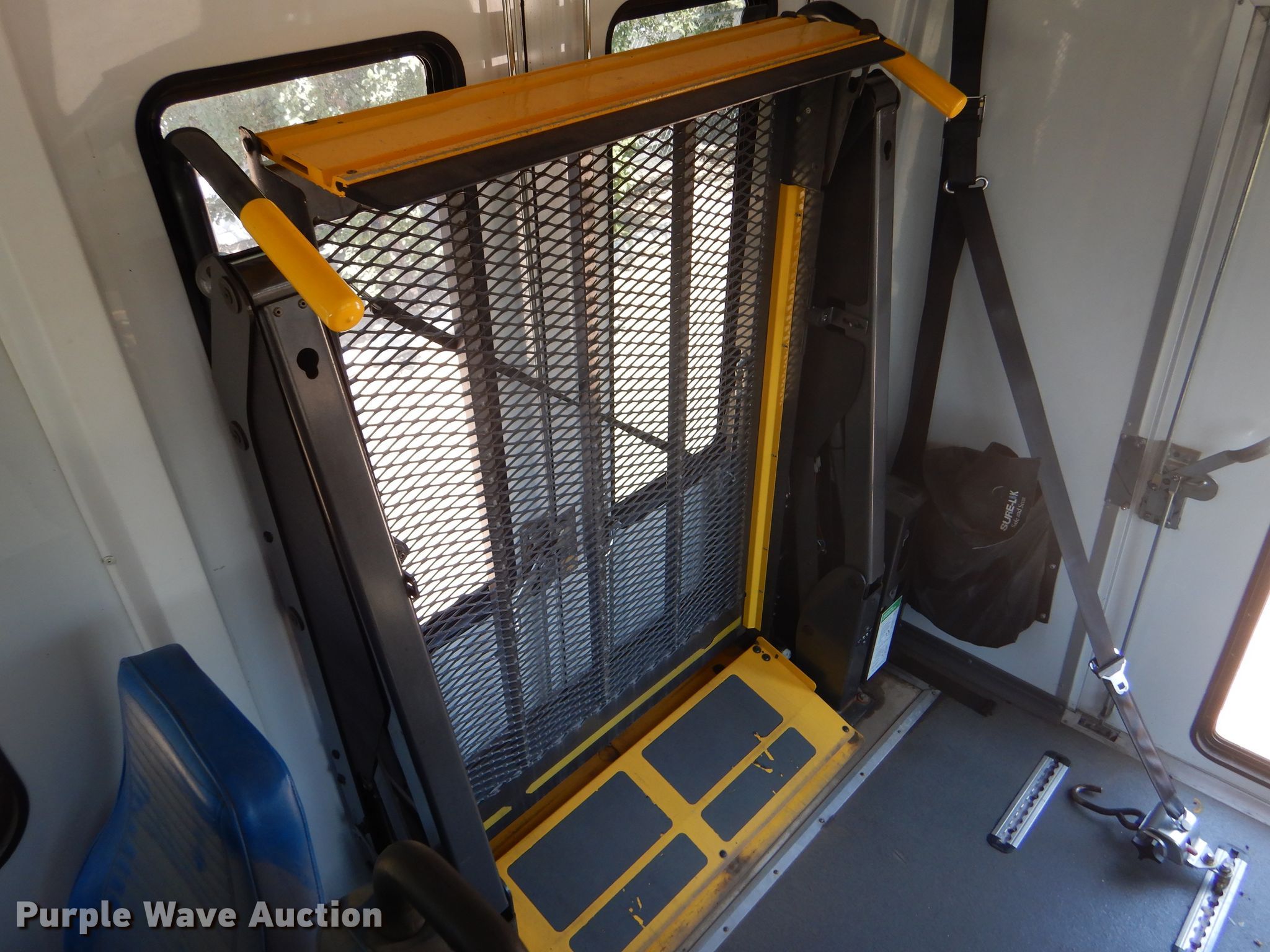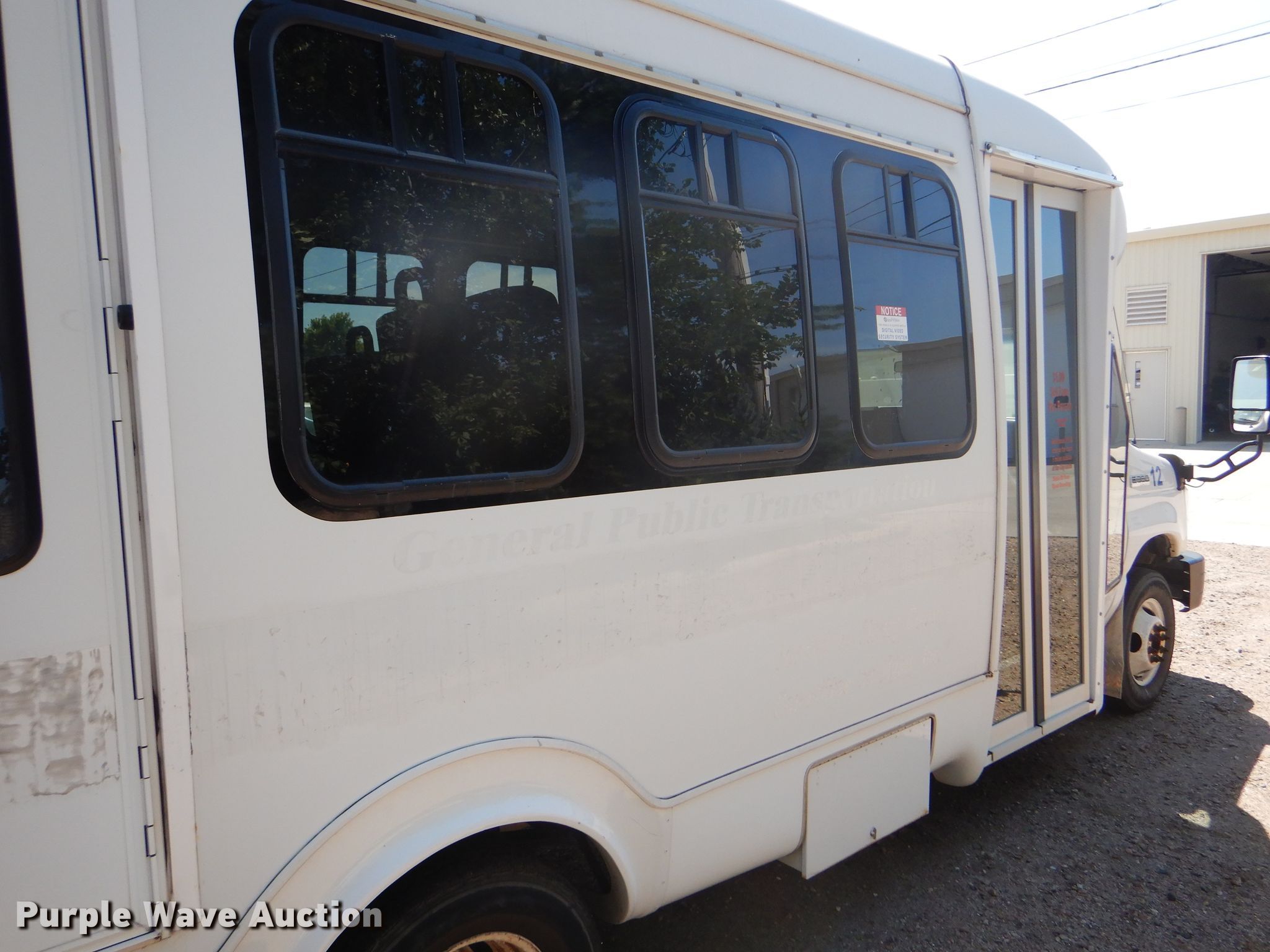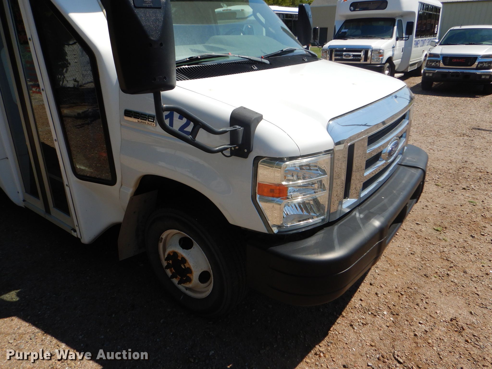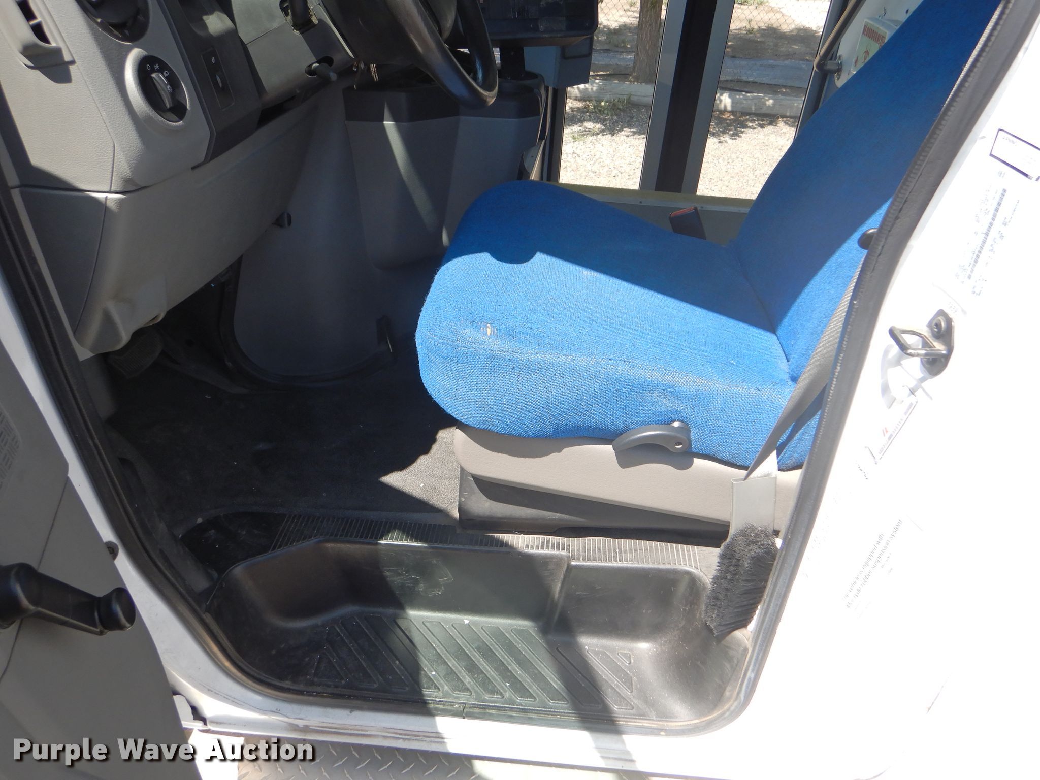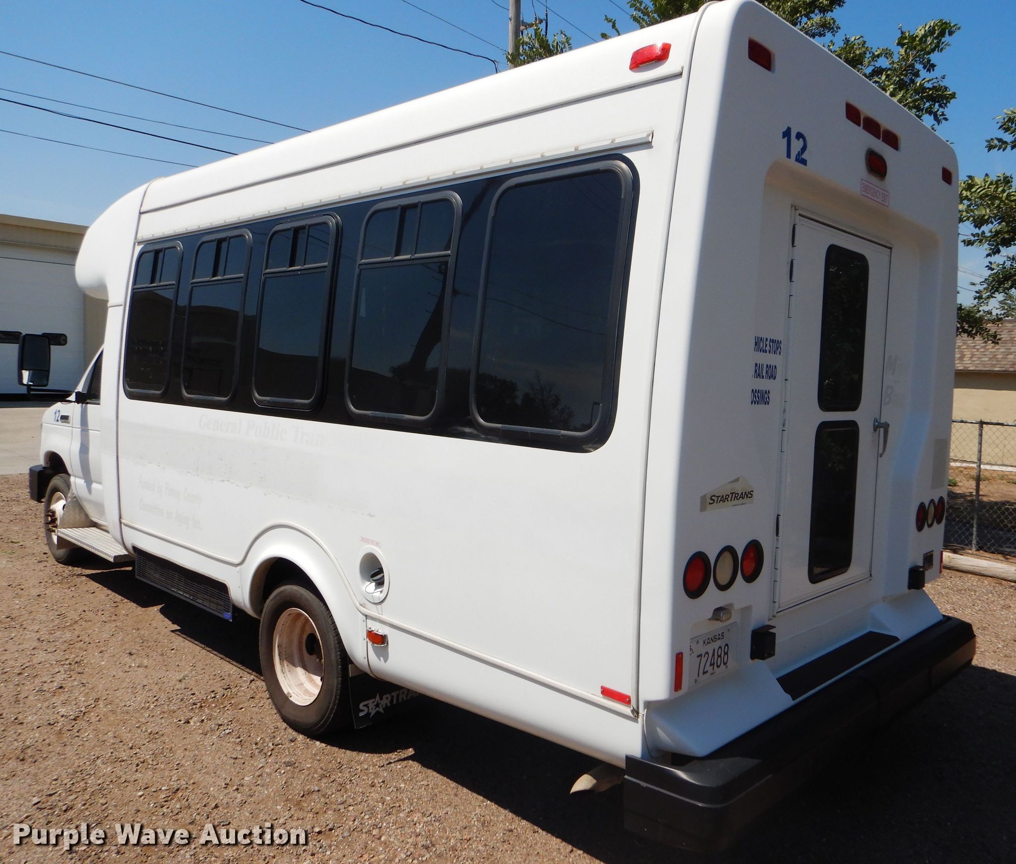 Purple Wave is selling a used Bus in Kansas. This item is a 2009 Ford E350 Super Duty shuttle bus with the following: 100,630 miles on odometer, 6.8L V10 SOHC 20V gas engine, Automatic transmission, Single axle, AC and heat, Auxiliary controls, Electric passenger sliding door, 12 passenger capacity, Braun wheelchair lift, Spring suspension, Hydraulic brakes, 158" wheelbase, 225/75R16 tires, GVWR 12,500 lbs