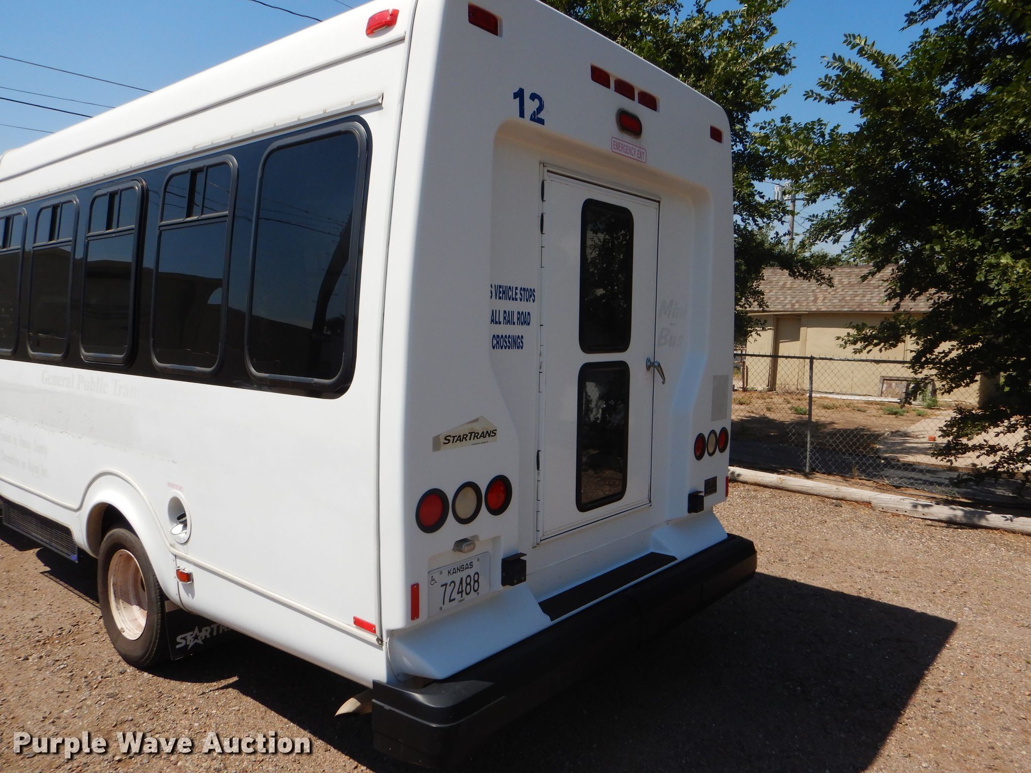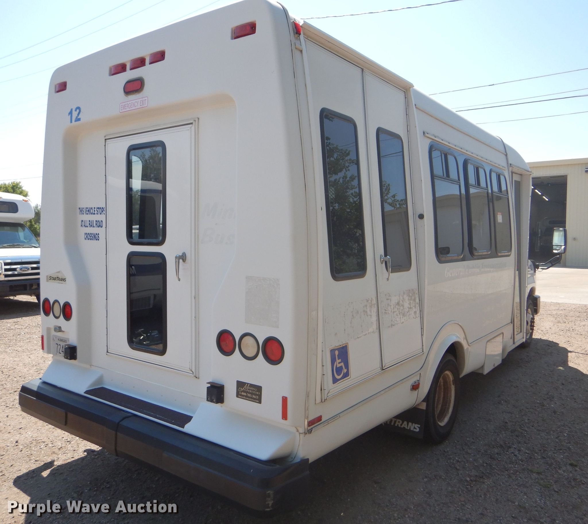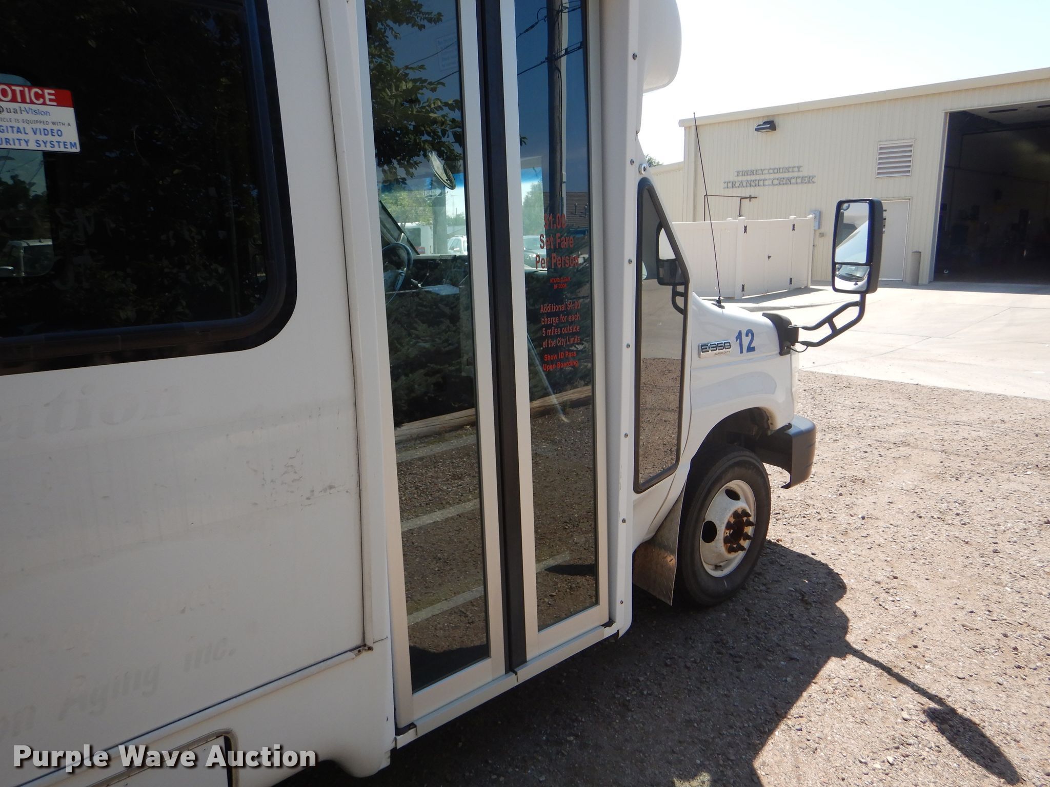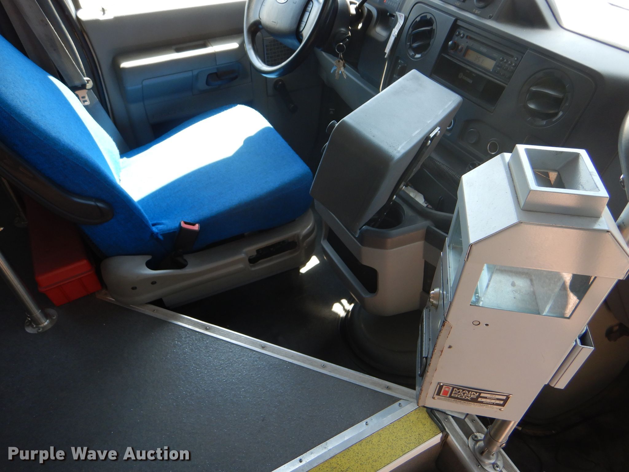Purple Wave is selling a used Bus in Kansas. This item is a 2009 Ford E350 Super Duty shuttle bus with the following: 100,630 miles on odometer, 6.8L V10 SOHC 20V gas engine, Automatic transmission, Single axle, AC and heat, Auxiliary controls, Electric passenger sliding door, 12 passenger capacity, Braun wheelchair lift, Spring suspension, Hydraulic brakes, 158" wheelbase, 225/75R16 tires, GVWR 12,500 lbs