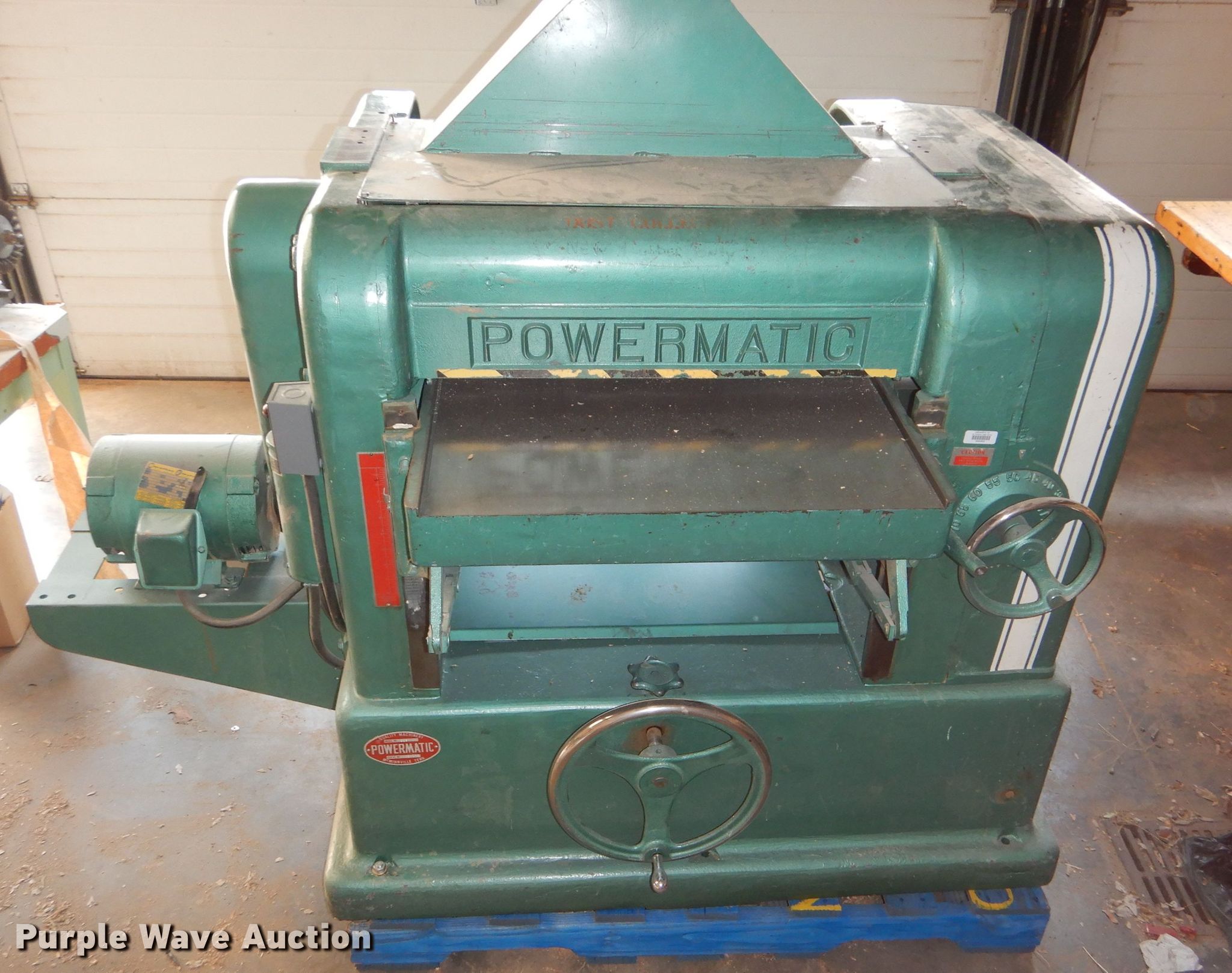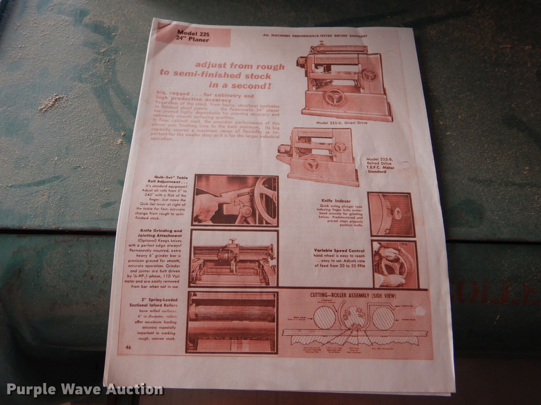 Purple Wave is selling a used Tools in Kansas. This item is a Powermatic 225 planer with the following: 24", 230/460V electric motor, Three phase, Byrd Tool Carbide tooth cutter head, Dust collector hookup