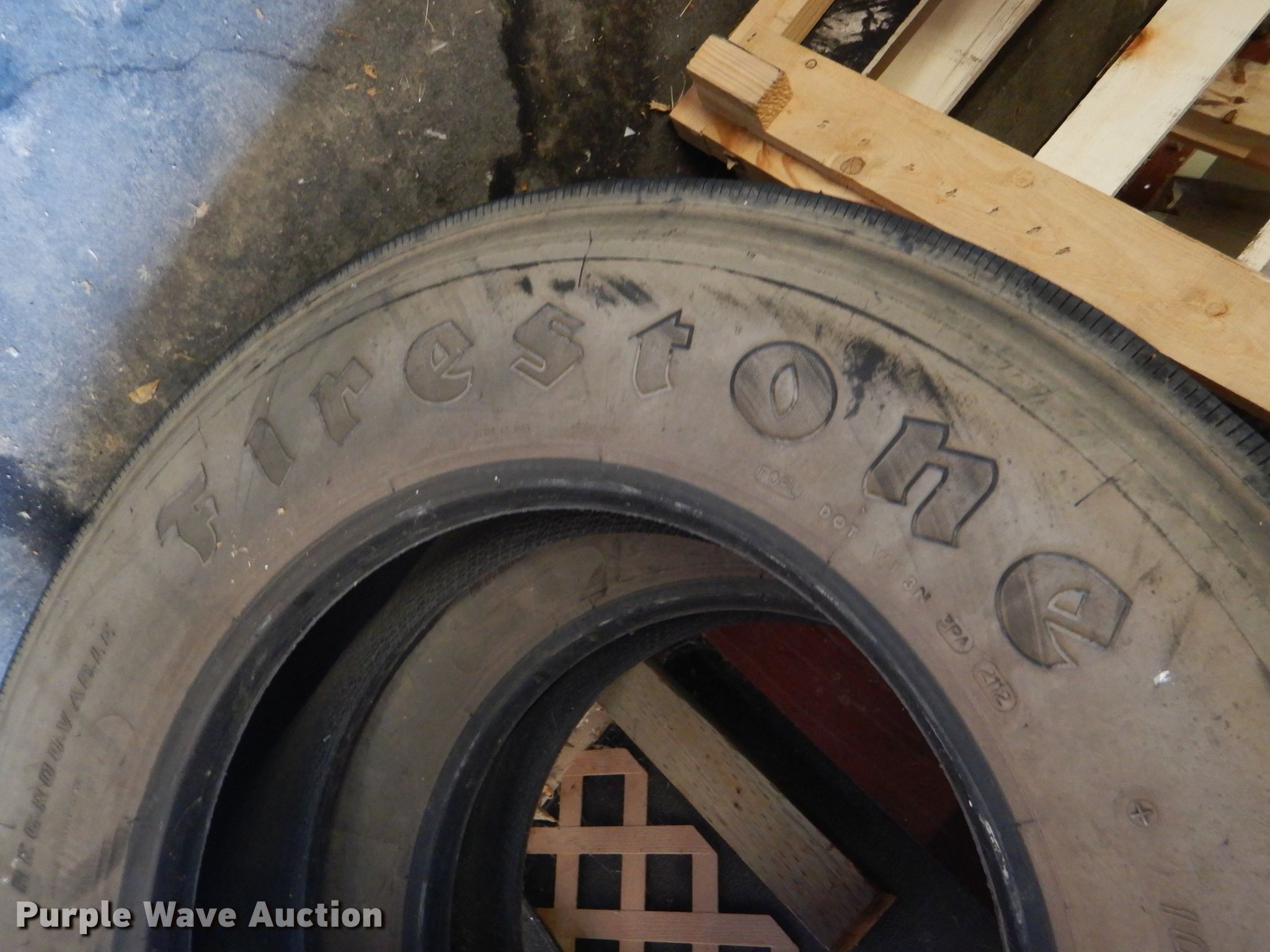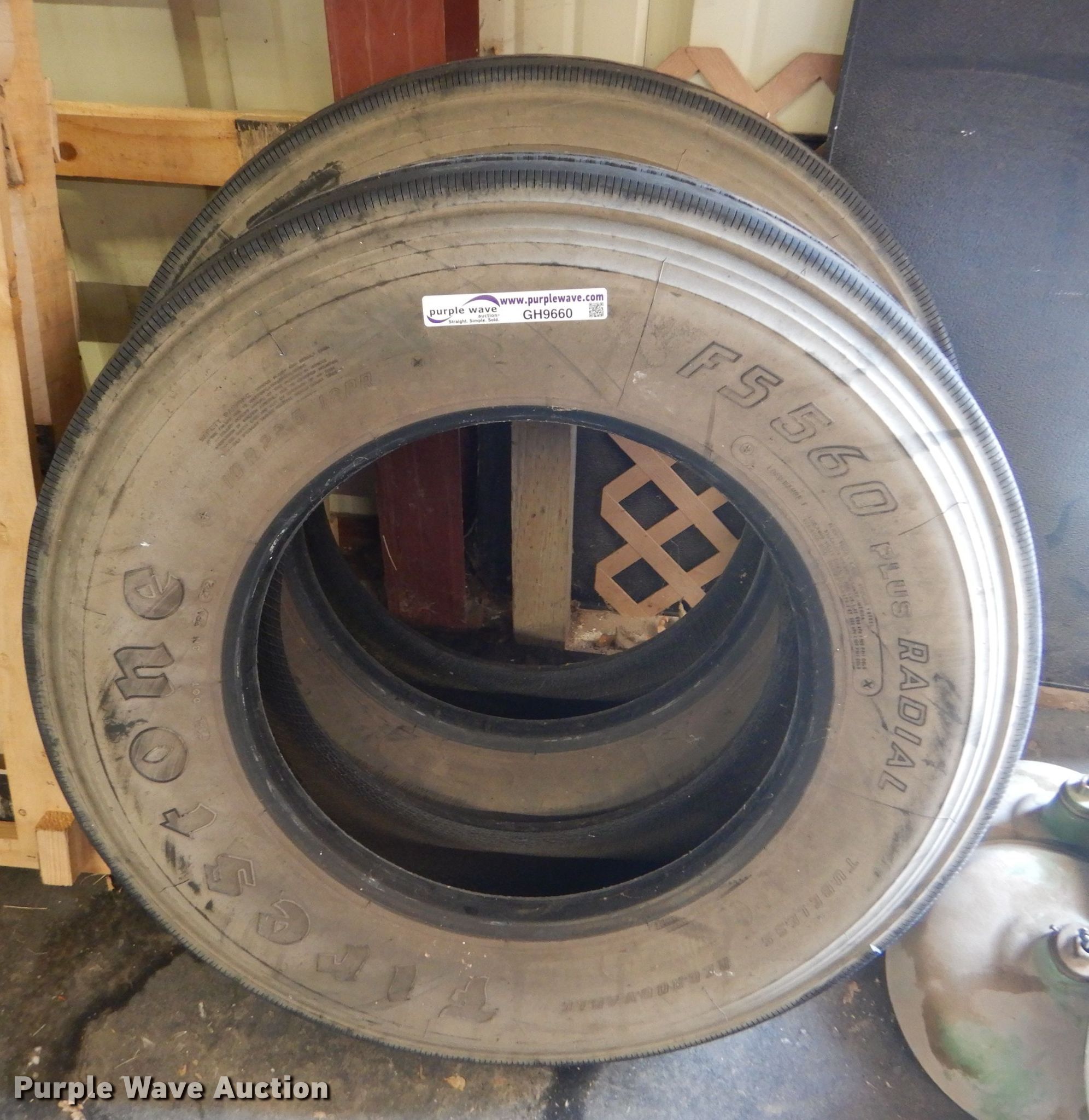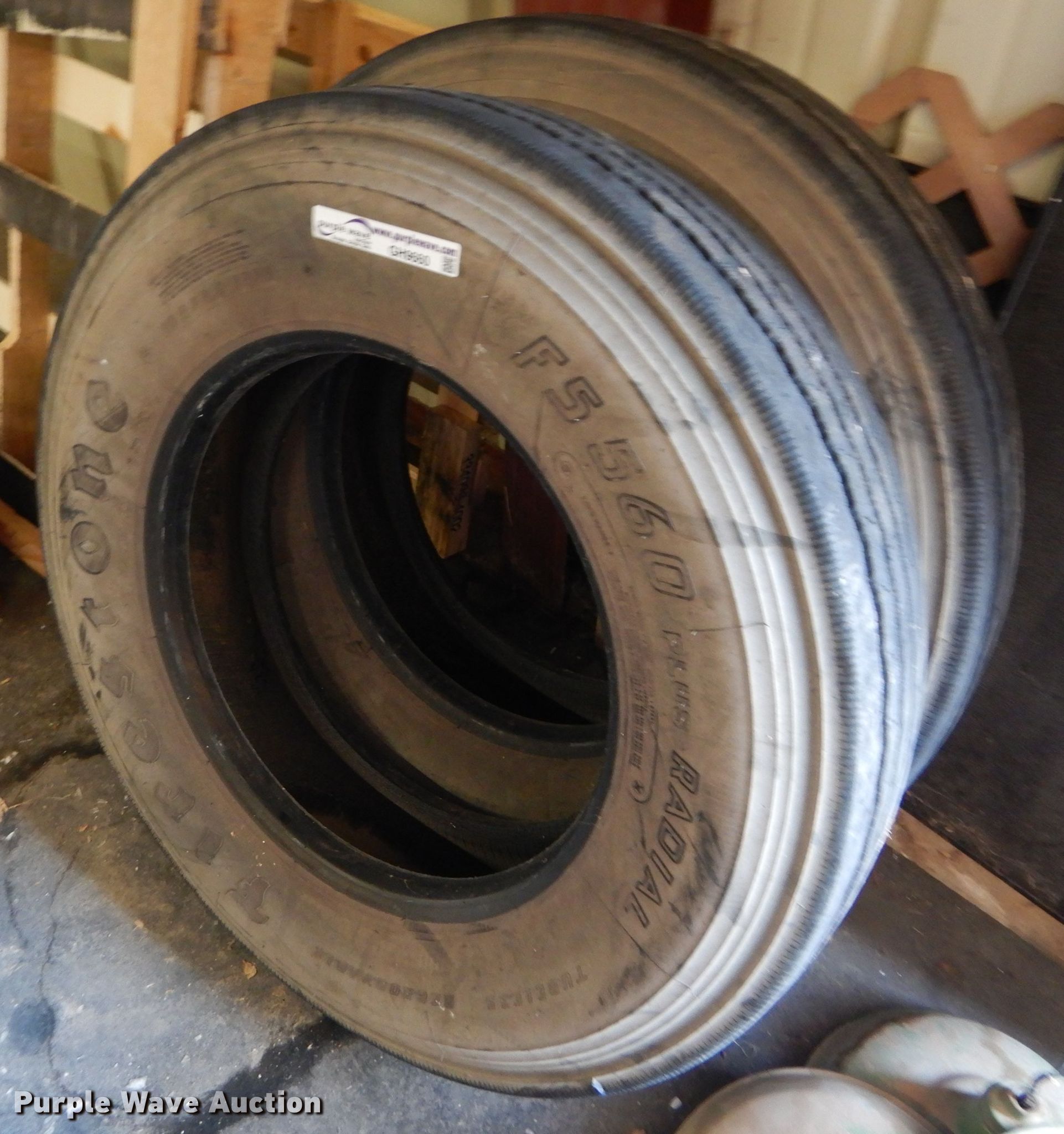 Purple Wave is selling a used Fleet Tires in Kansas. This item is a Firestone FS560 Radial 10R22.5 tires with the following: 12 ply