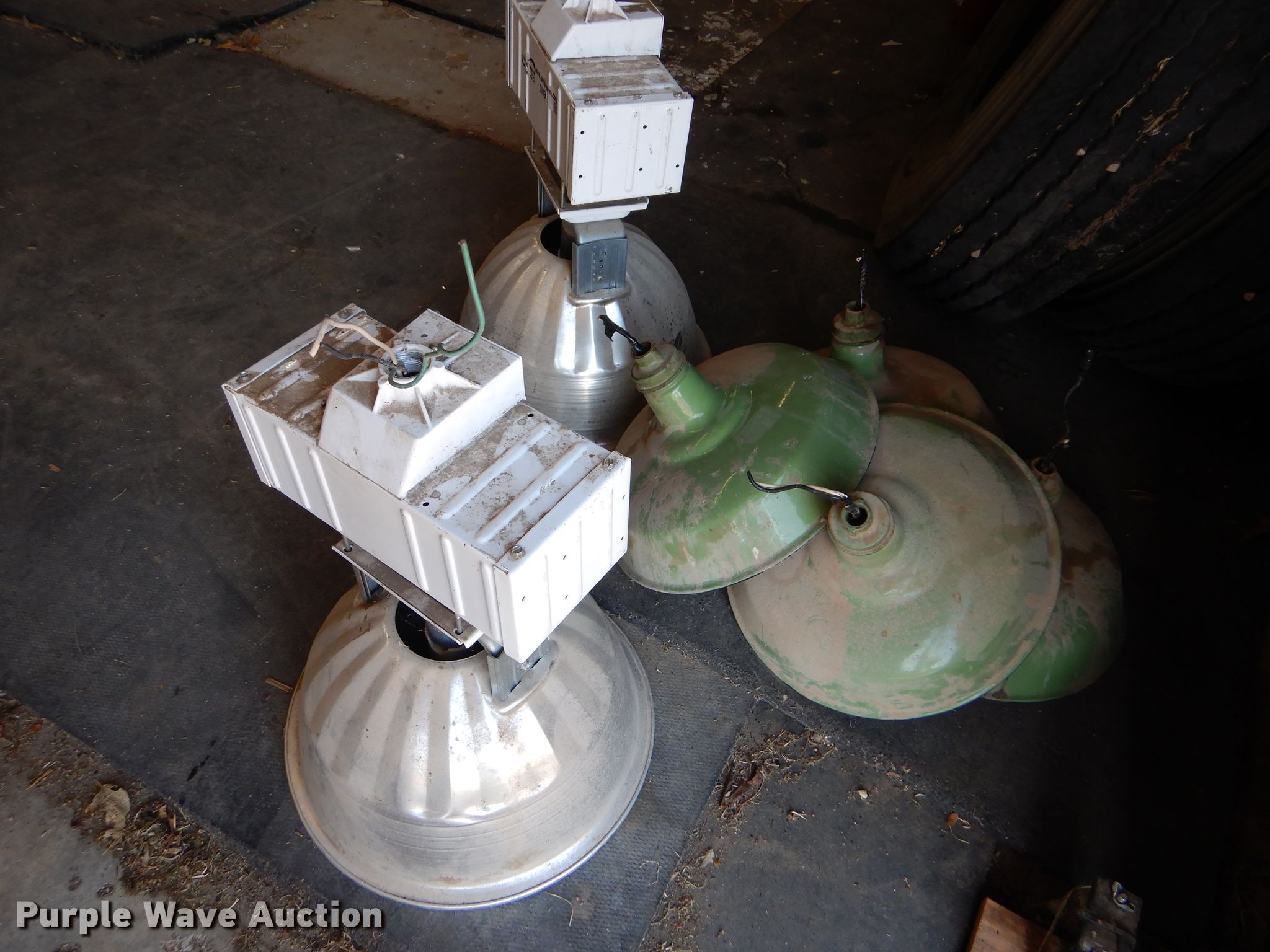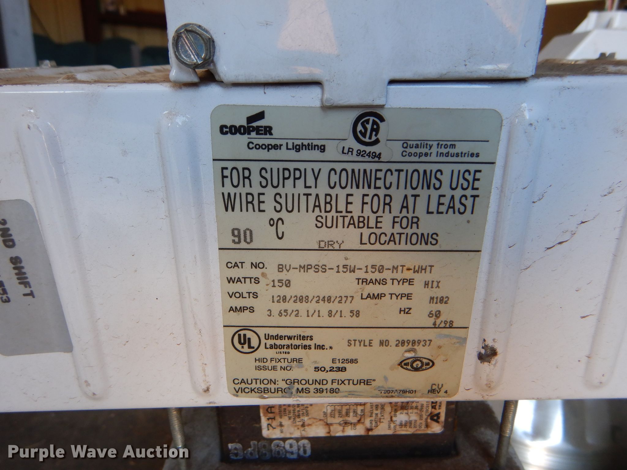 Purple Wave is selling a used Building Materials in Kansas. This item is a (4) light fixtures with the following: (2) Cooper gymnasium lights, 120/208/240/277V, M102 lamp type, (4) metal light fixtures, 110V
