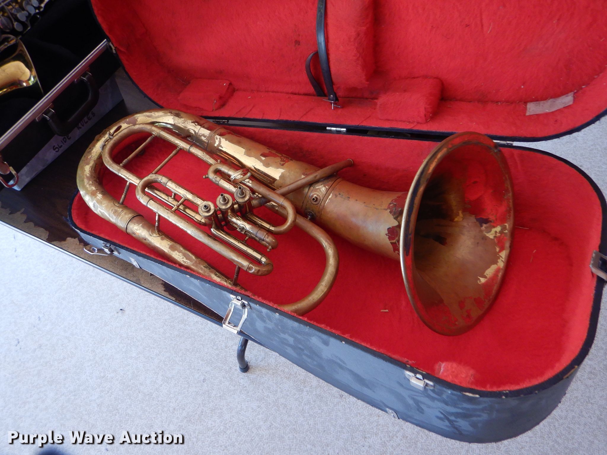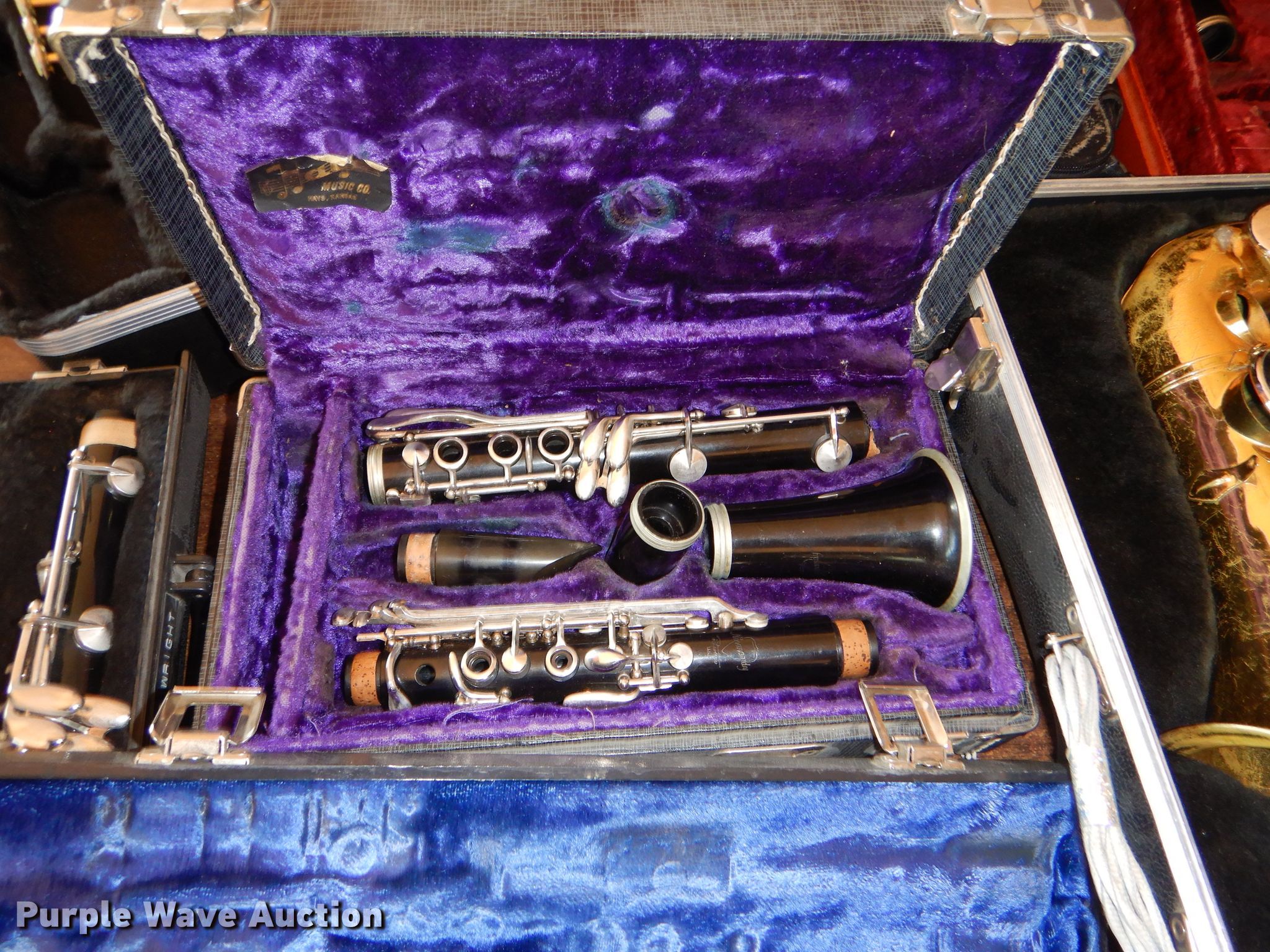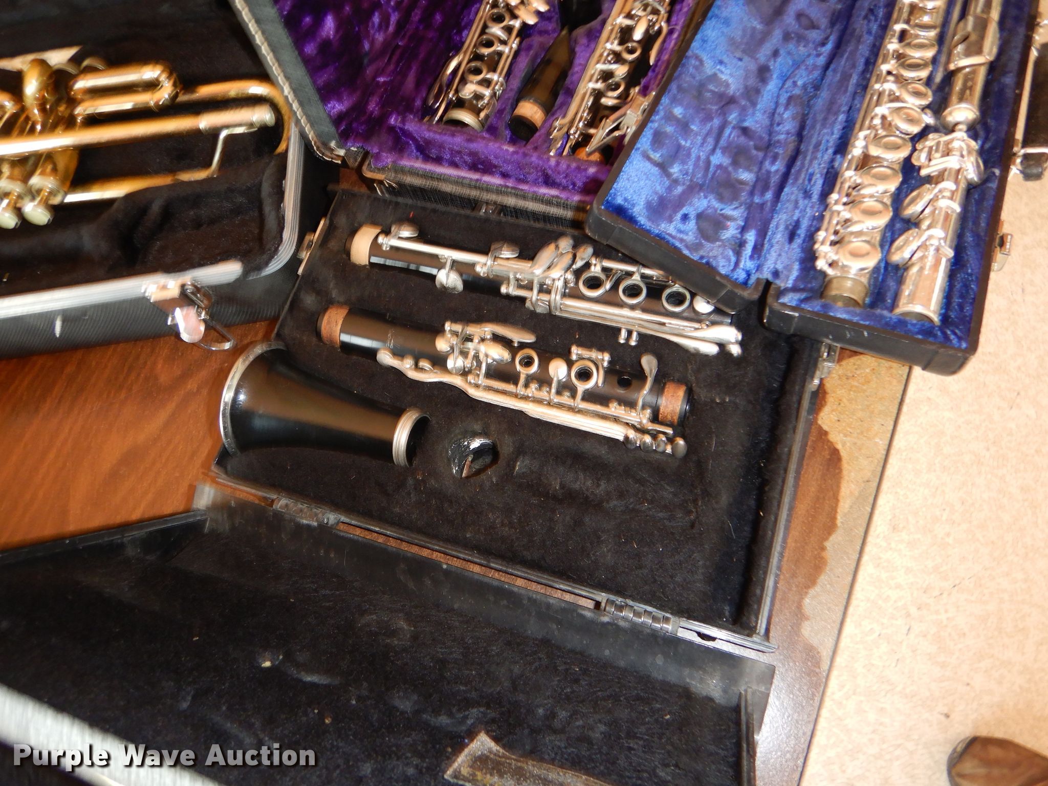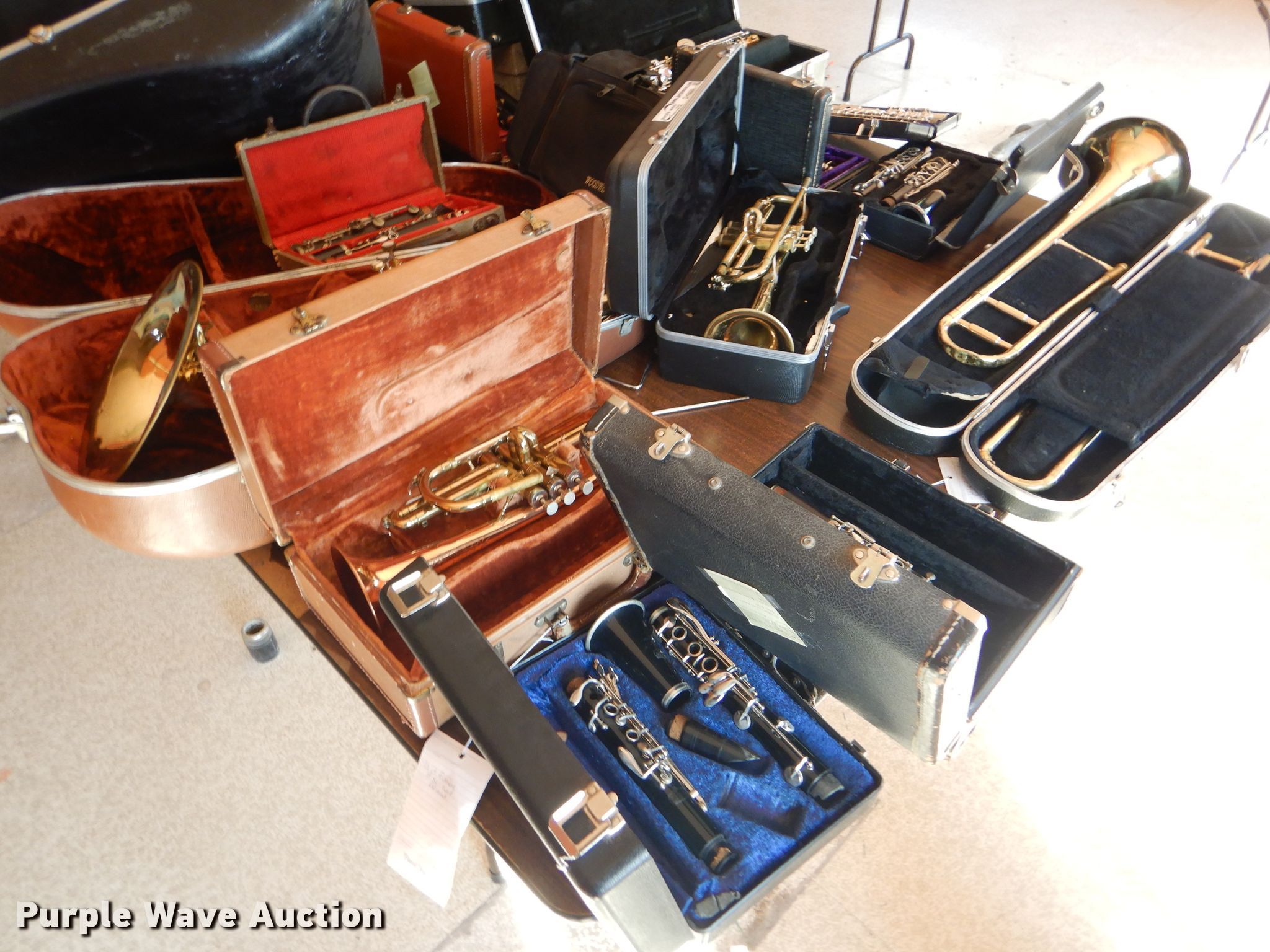 Purple Wave is selling a used Music Equip. in Kansas. This item is a Music instrument parts with the following: Trombone, Cornet, Alto saxophone, Clarinets, Flute, Baritones, Trumpet, Cases, Most damaged or missing parts
