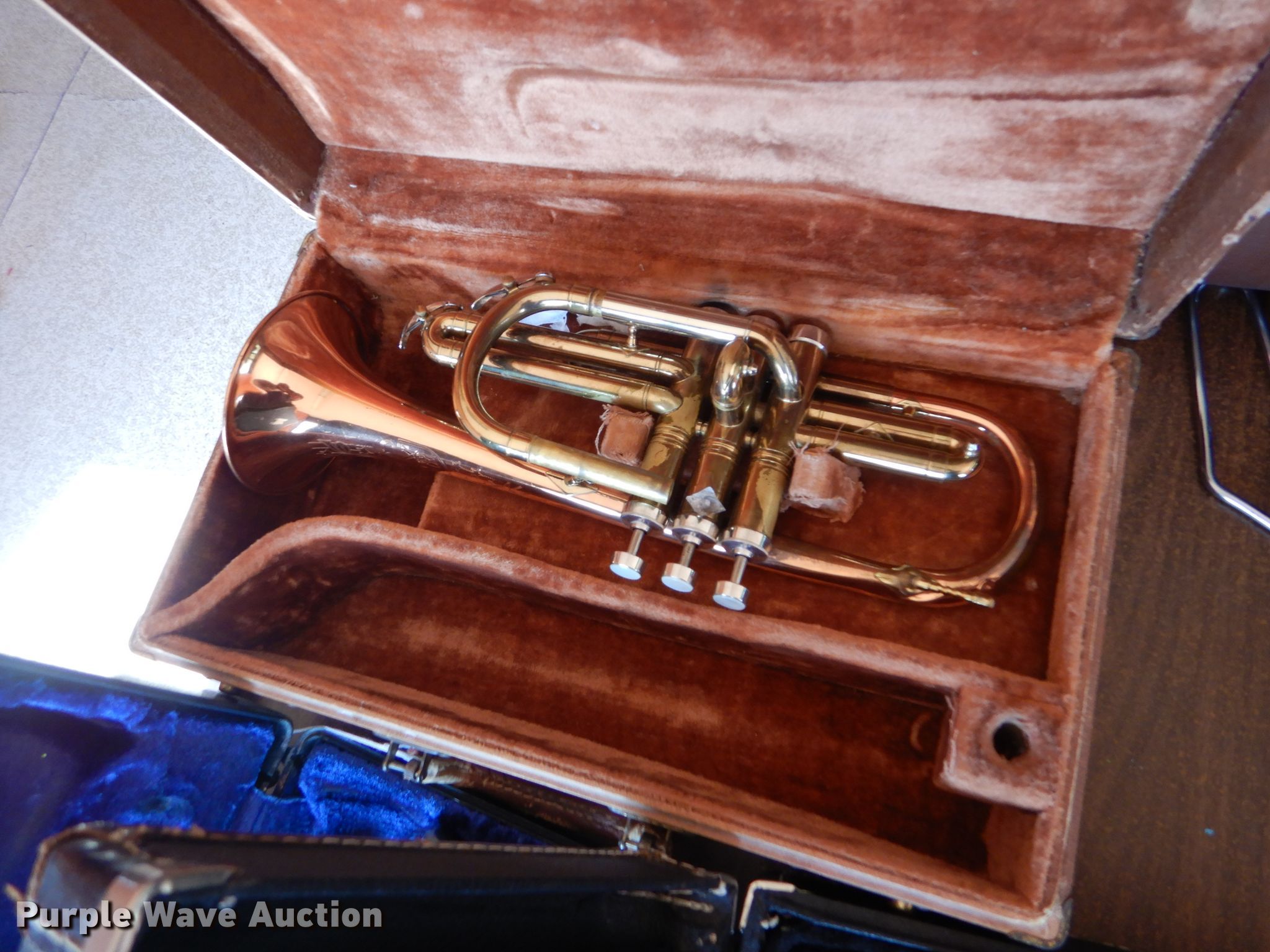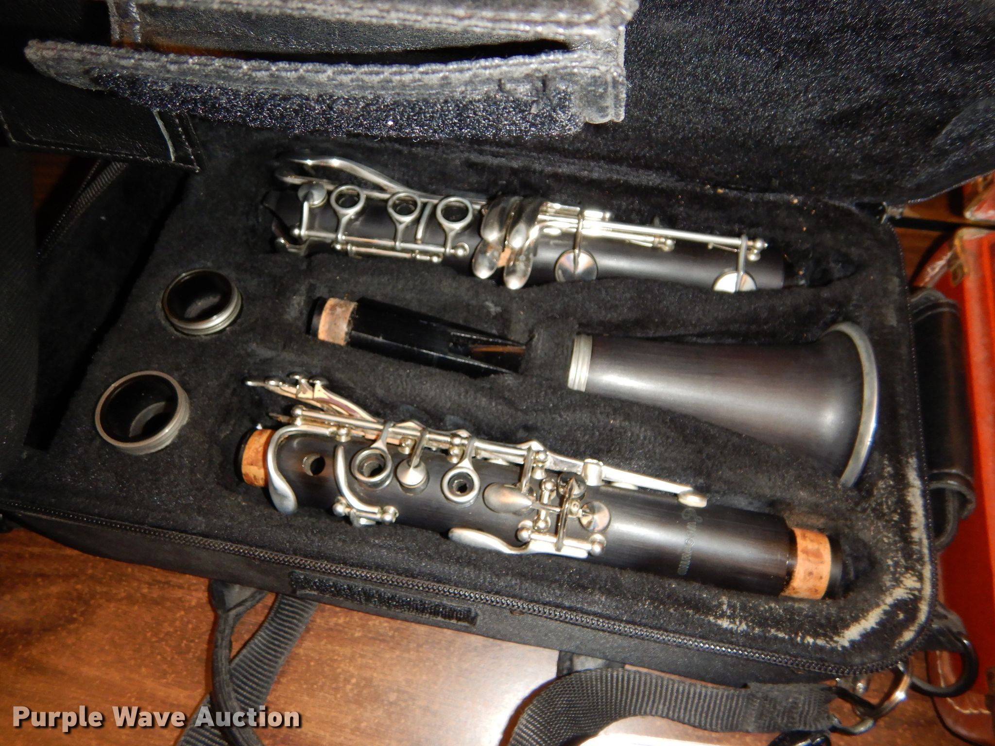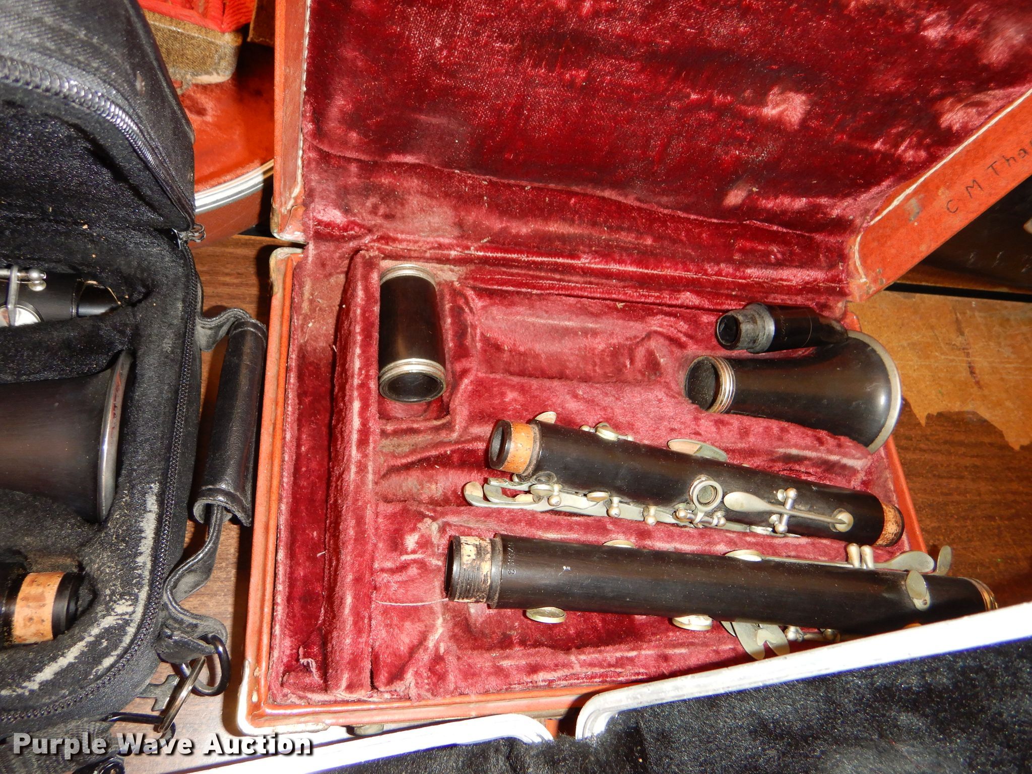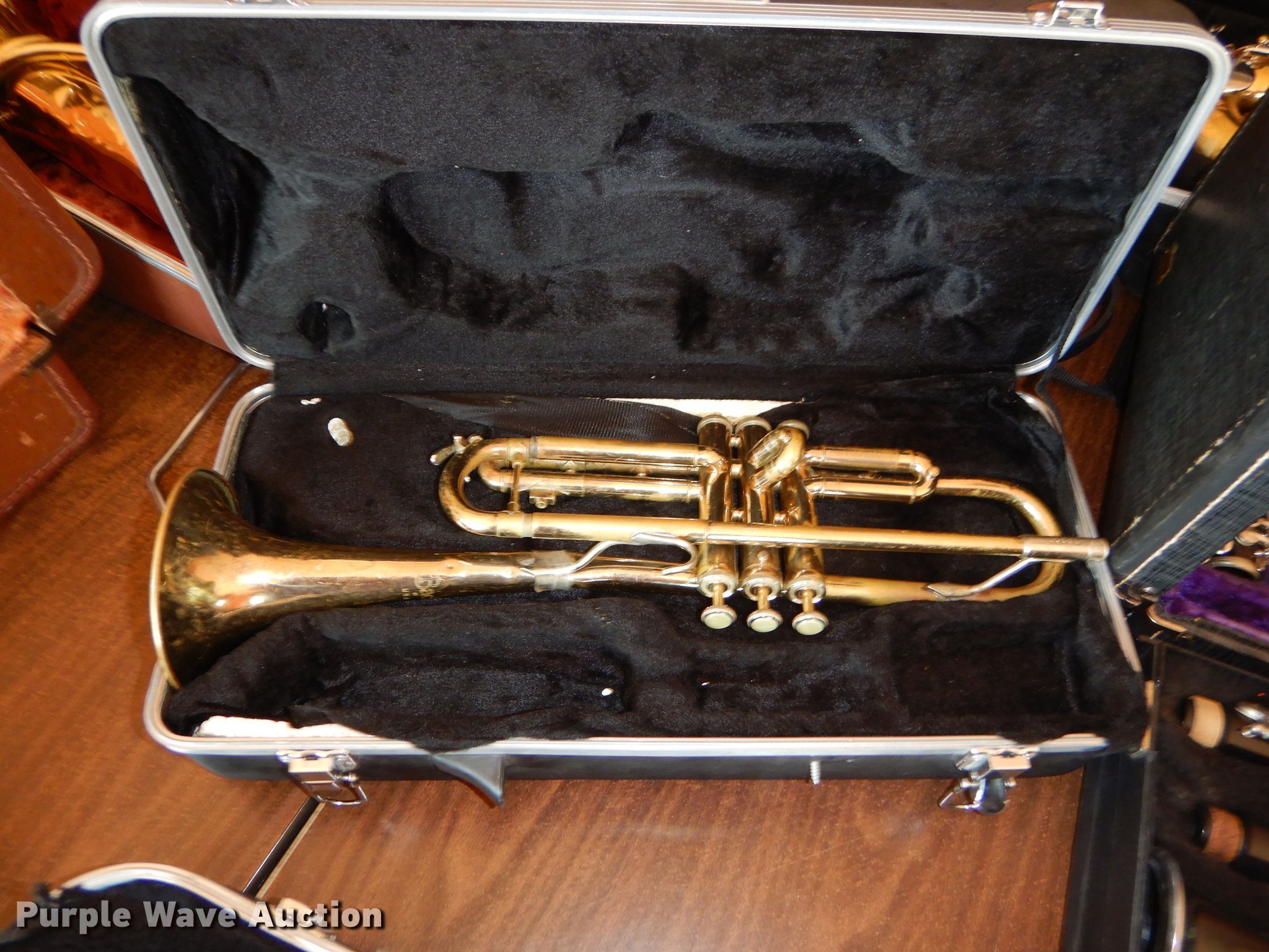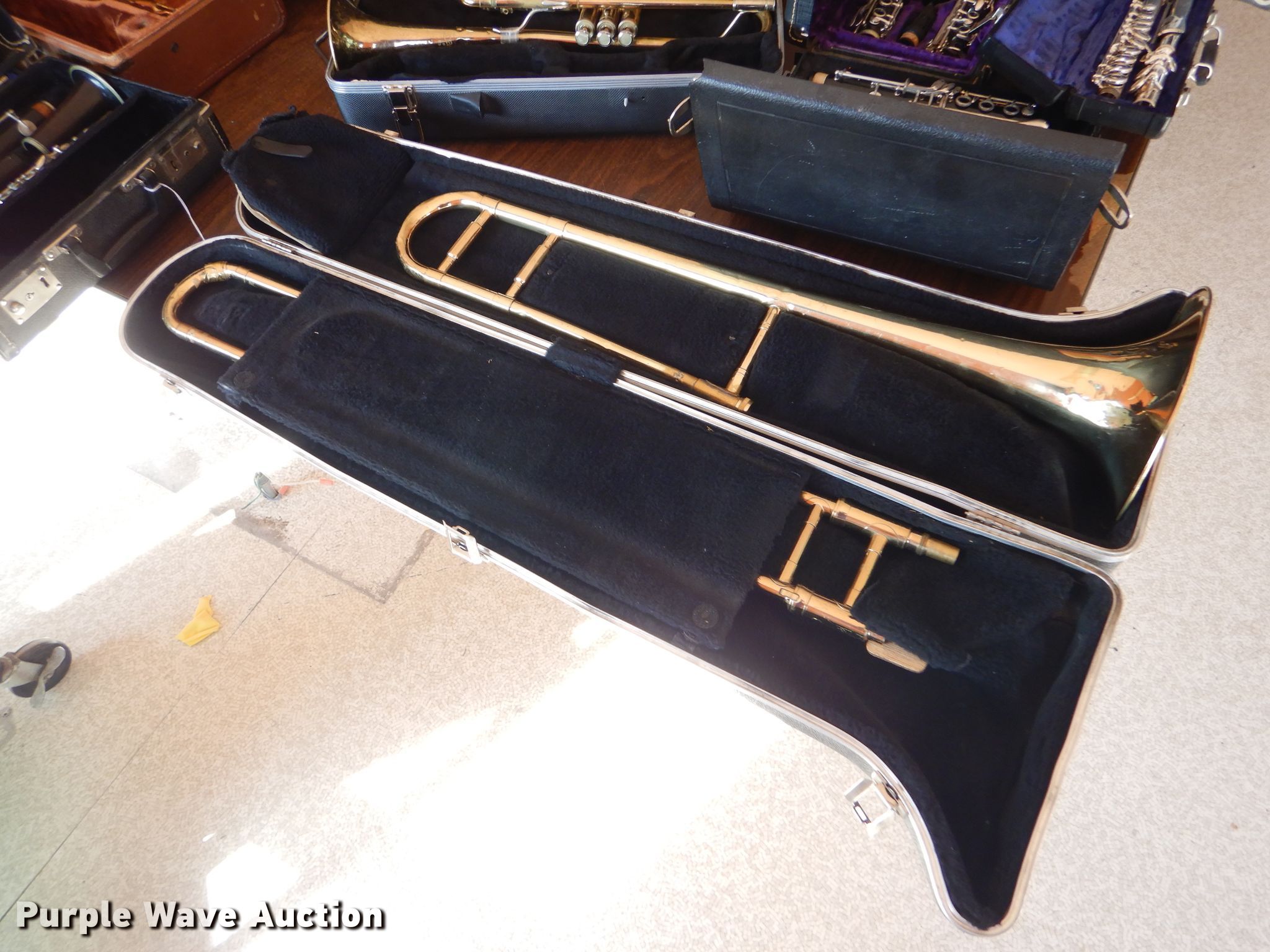 Purple Wave is selling a used Music Equip. in Kansas. This item is a Music instrument parts with the following: Trombone, Cornet, Alto saxophone, Clarinets, Flute, Baritones, Trumpet, Cases, Most damaged or missing parts
