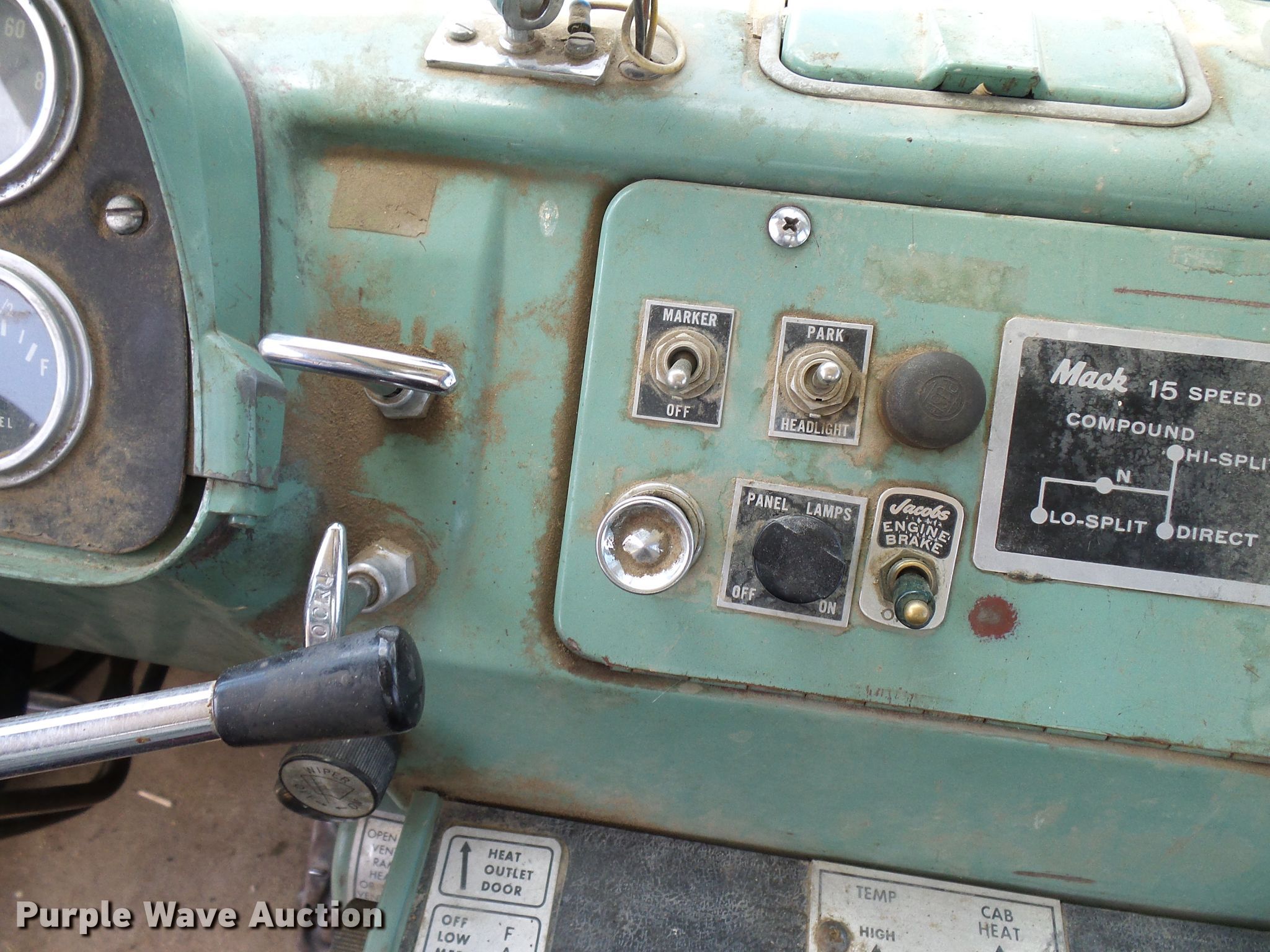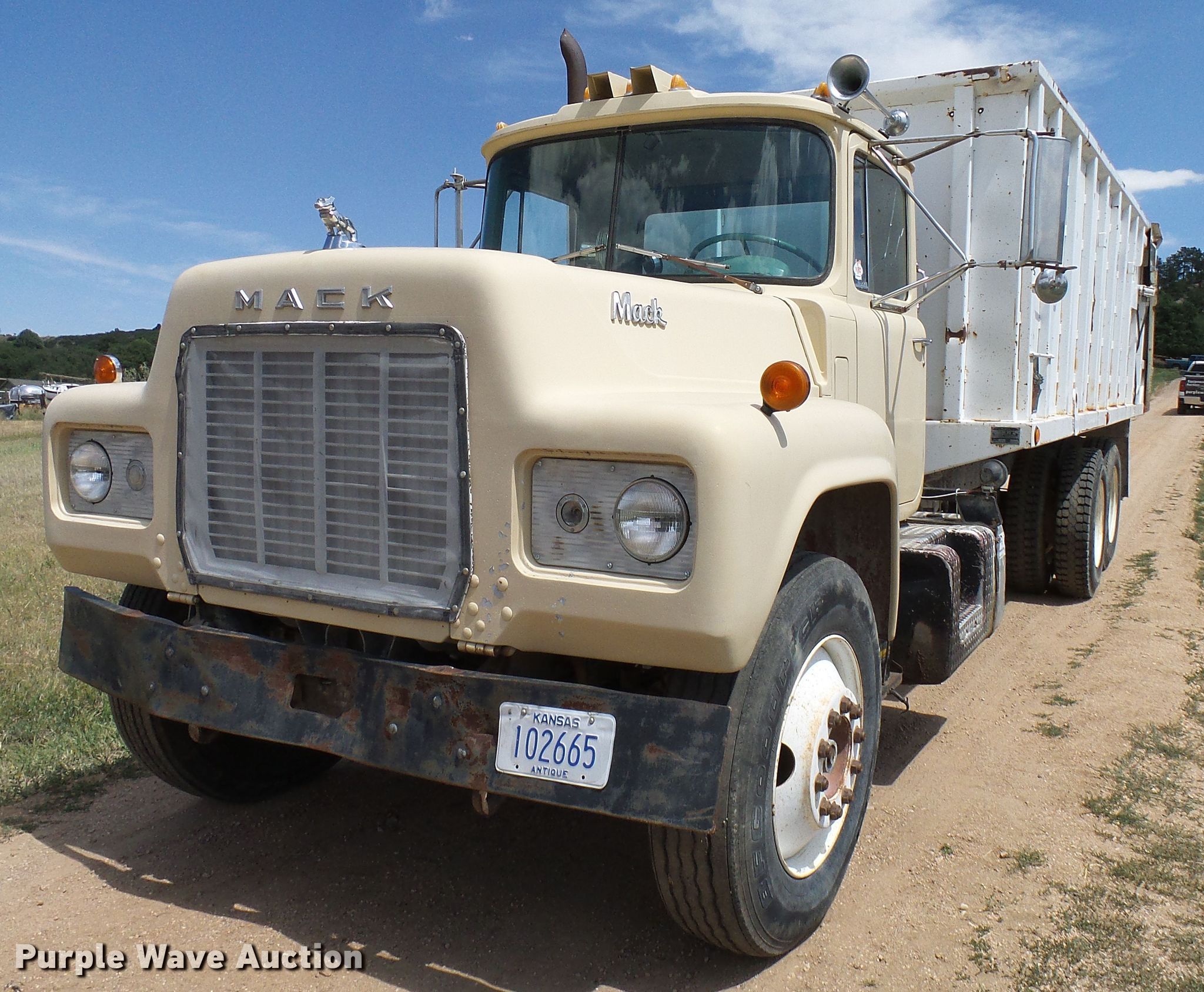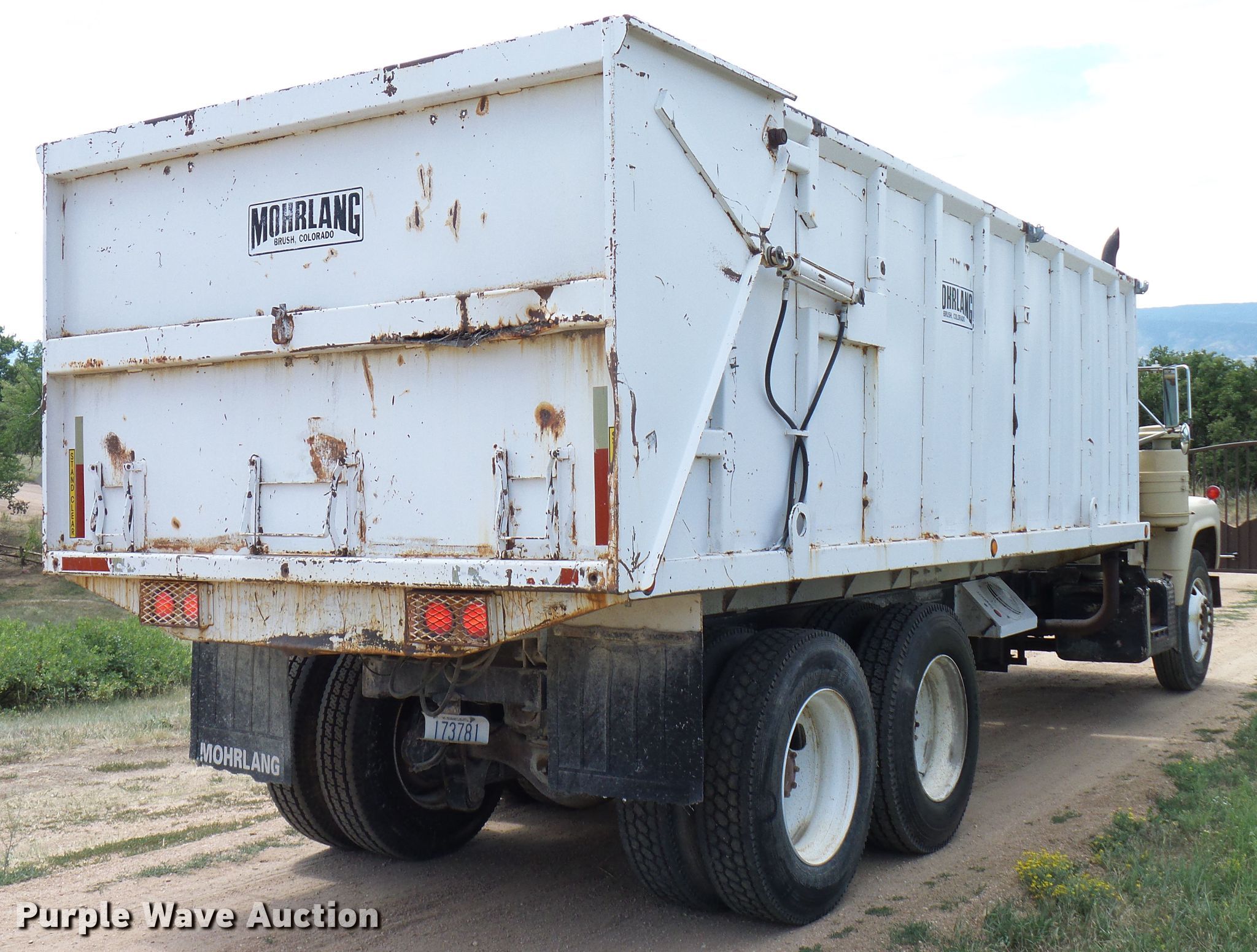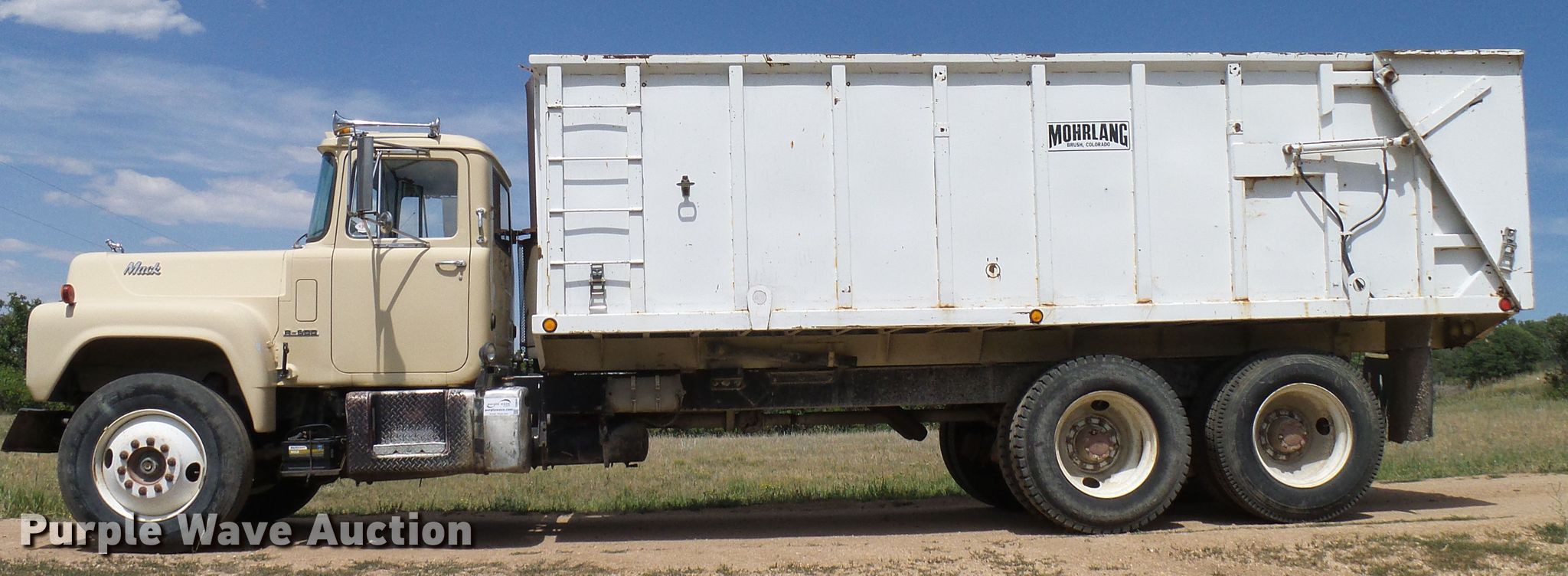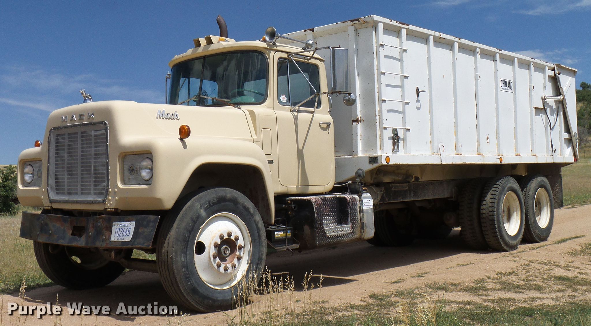 Purple Wave is selling a used Grain Truck in Colorado. This item is a 1966 Mack R611 grain truck with the following: 310,821 miles on odometer, 645 hours on meter, Mack six cylinder diesel engine, Mack Triplex 15 speed manual transmission, Single axle, AC and heat, Mohrlang 20SLIP steel grain bed, 20'L, 64" side height, 16" side board height, Dual ram hoist, Hydraulic end gate, Spring suspension, Air brakes, Engine brake, 245" wheelbase, 11R24.5 tires, Drivers door glass cracked, Unknown operating condition of AC