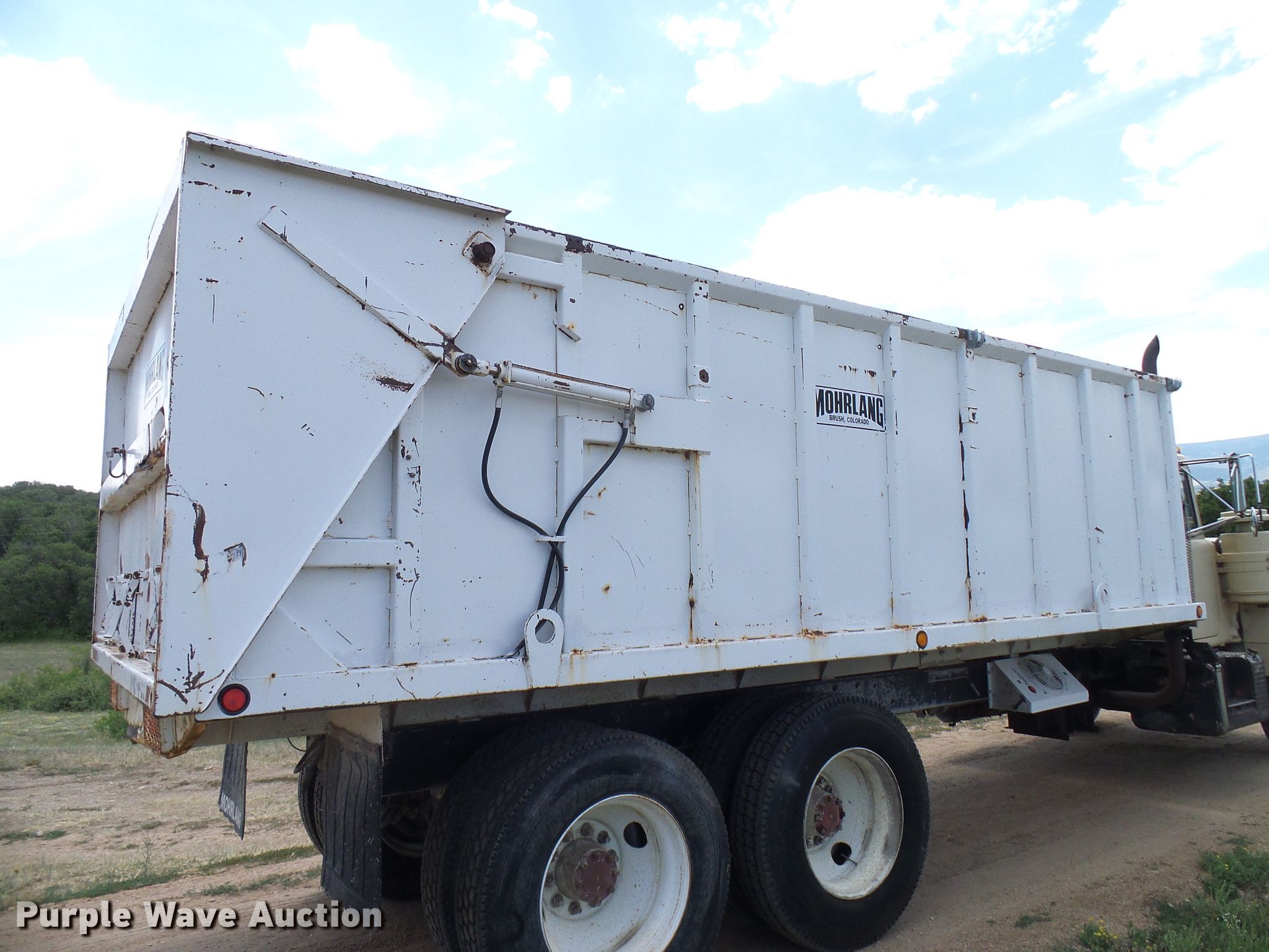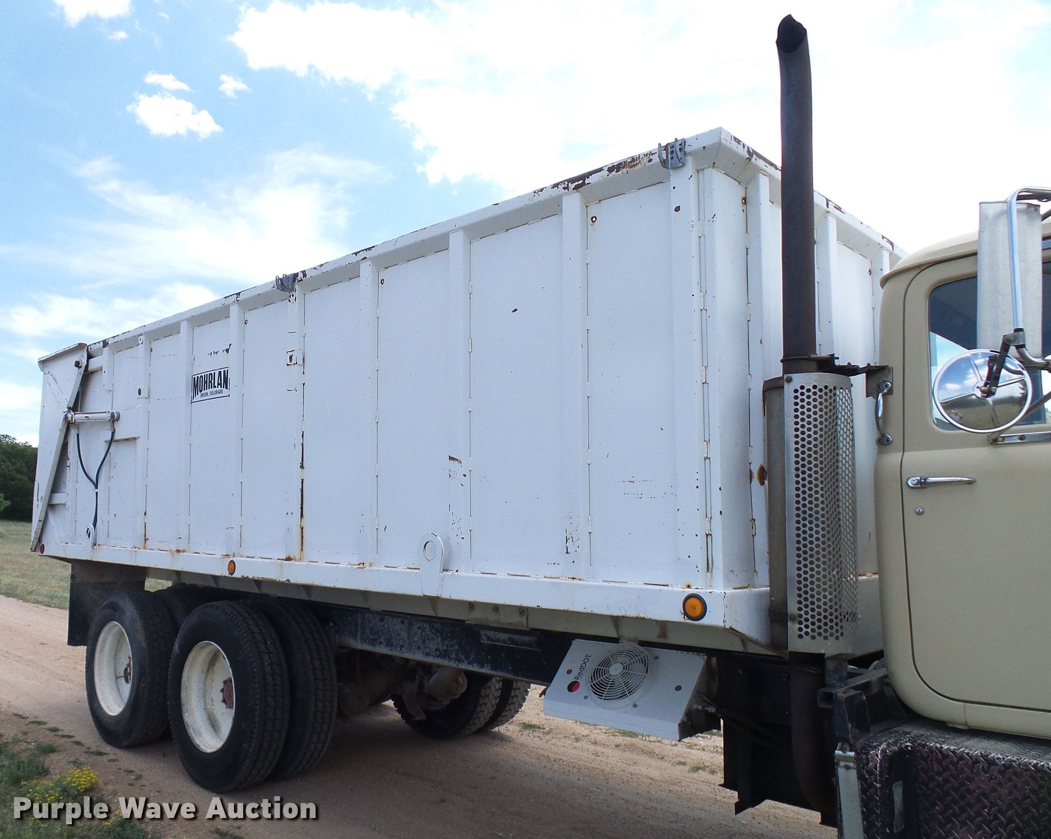 1966 Mack R611 grain truck. 310,821 miles on odometer, 645 hours on meter, Mack six cylinder diesel engine, Mack Triplex 15 speed manual transmission, Single axle, AC and heat, Mohrlang 20SLIP steel grain bed 20'L, 64" side height, 16" side board height, Dual ram hoist, Hydraulic end gate, Spring suspension, Air brakes, Engine brake, 245" wheelbase, 11R24.5 tires, Drivers door glass cracked, Unknown operating condition of AC. Kansas title. Title distribution may be delayed up to 30 days from verification of funds. R611LST1446. Castle Rock, CO 80109