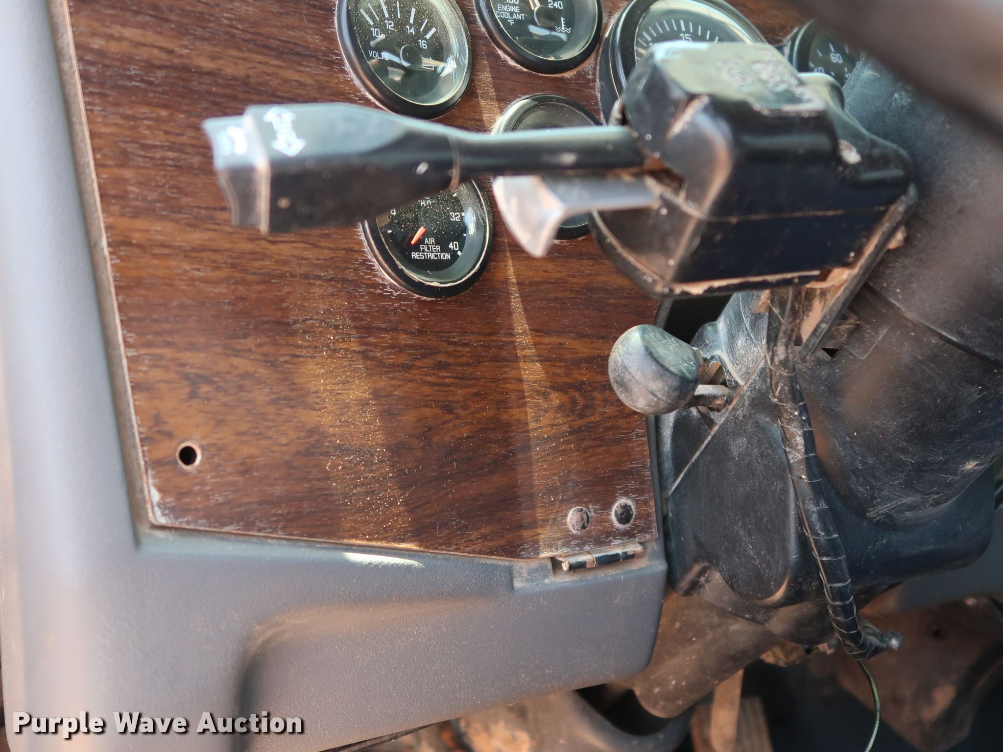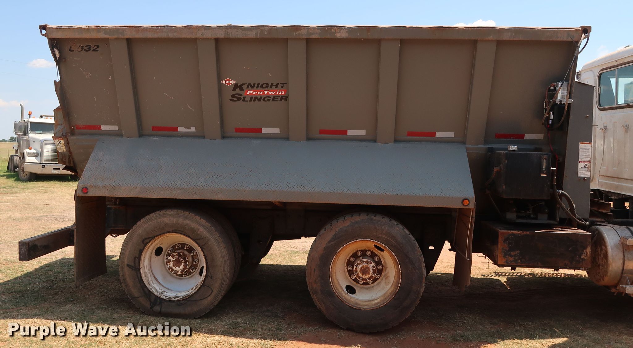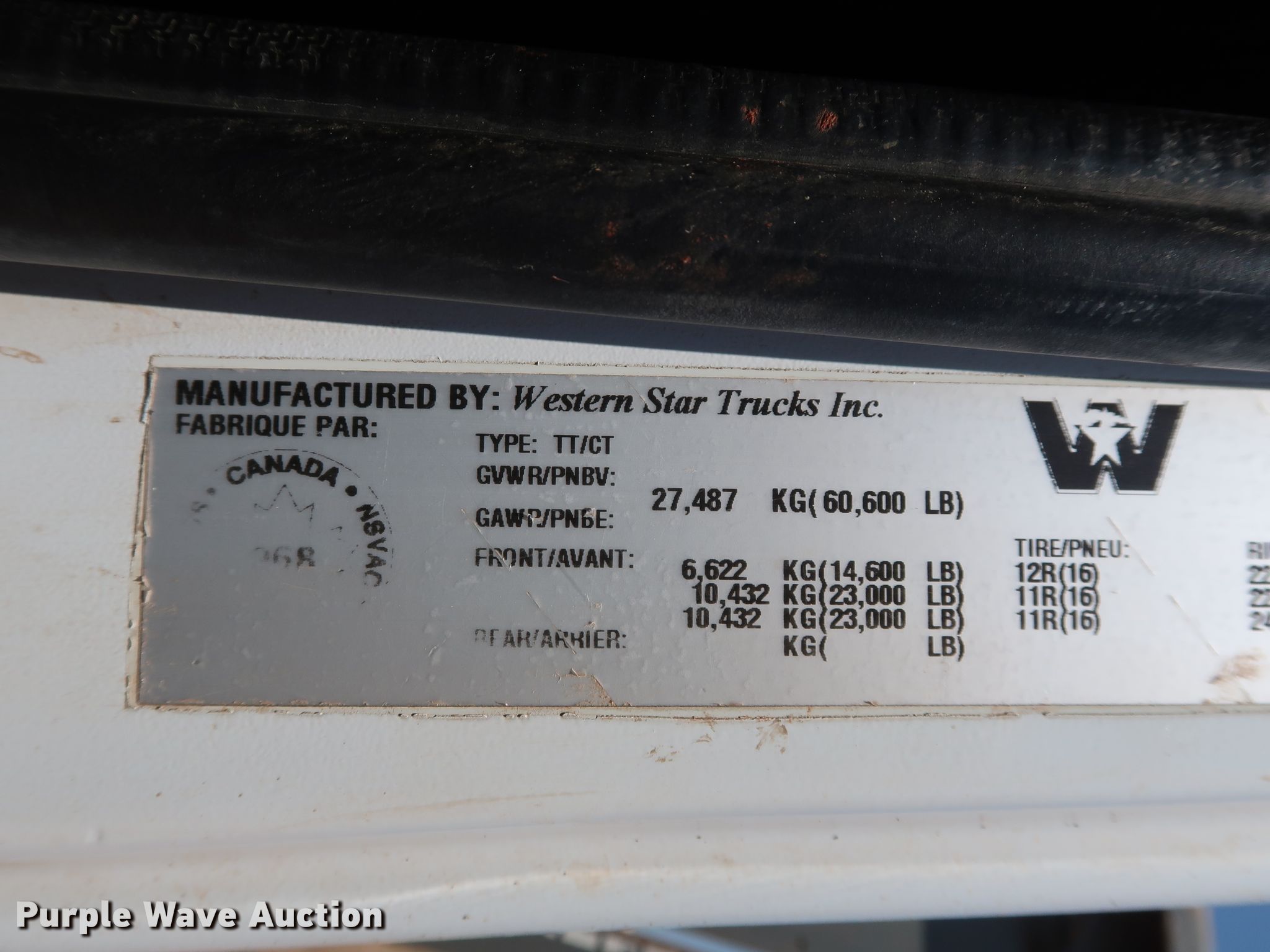 Purple Wave is selling a used Oilfield Truck in Oklahoma. This item is a 2001 Western Star 4964SX spreader truck with the following: 35,550 miles on odometer, Caterpillar C15 15.2L L6 diesel engine, 490 HP, Serial 6NZ14937, Eaton Fuller RTO16908LL 10 speed manual transmission, Spread tandem axle, Differential lock, AC and heat, Heated mirrors, Air ride cab, PTO, Wet kit, Khun Knight 8032 ProTwin Slinger spreader bed, 16'L, 40"W adjustable side discharge, In-cab controls, Dual fuel tanks, Air suspension, Air brakes, Engine brake, 11R22.5 front tires, 11R24.5 rear tires, GVWR 60,600 lbs
