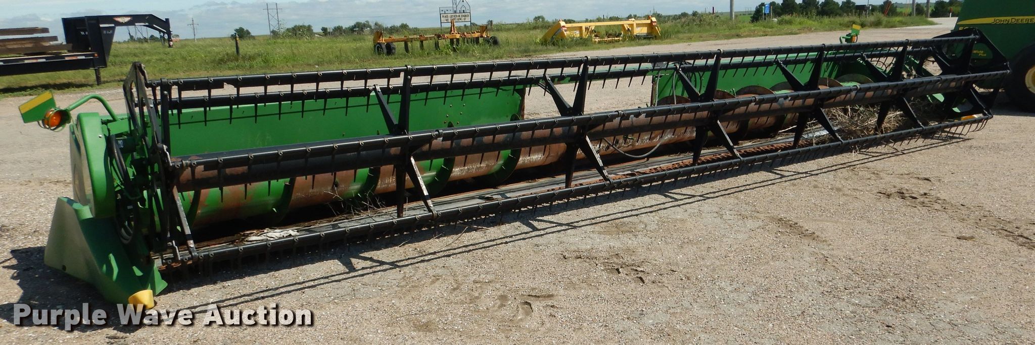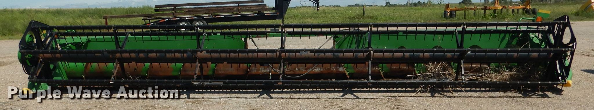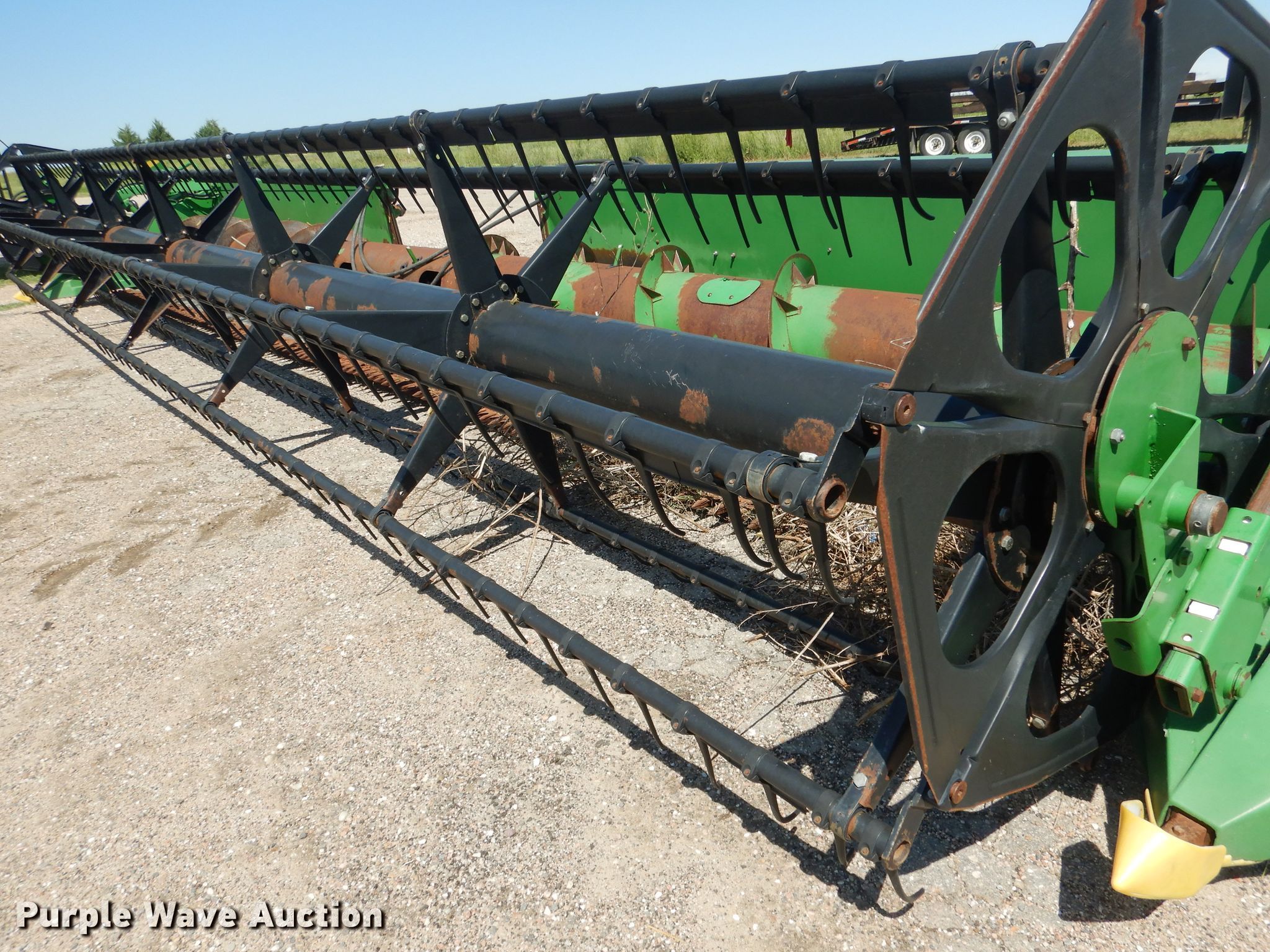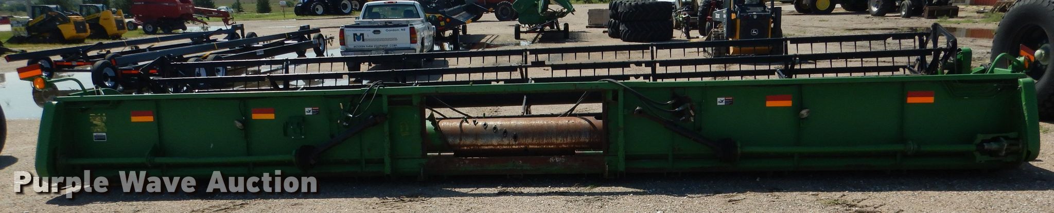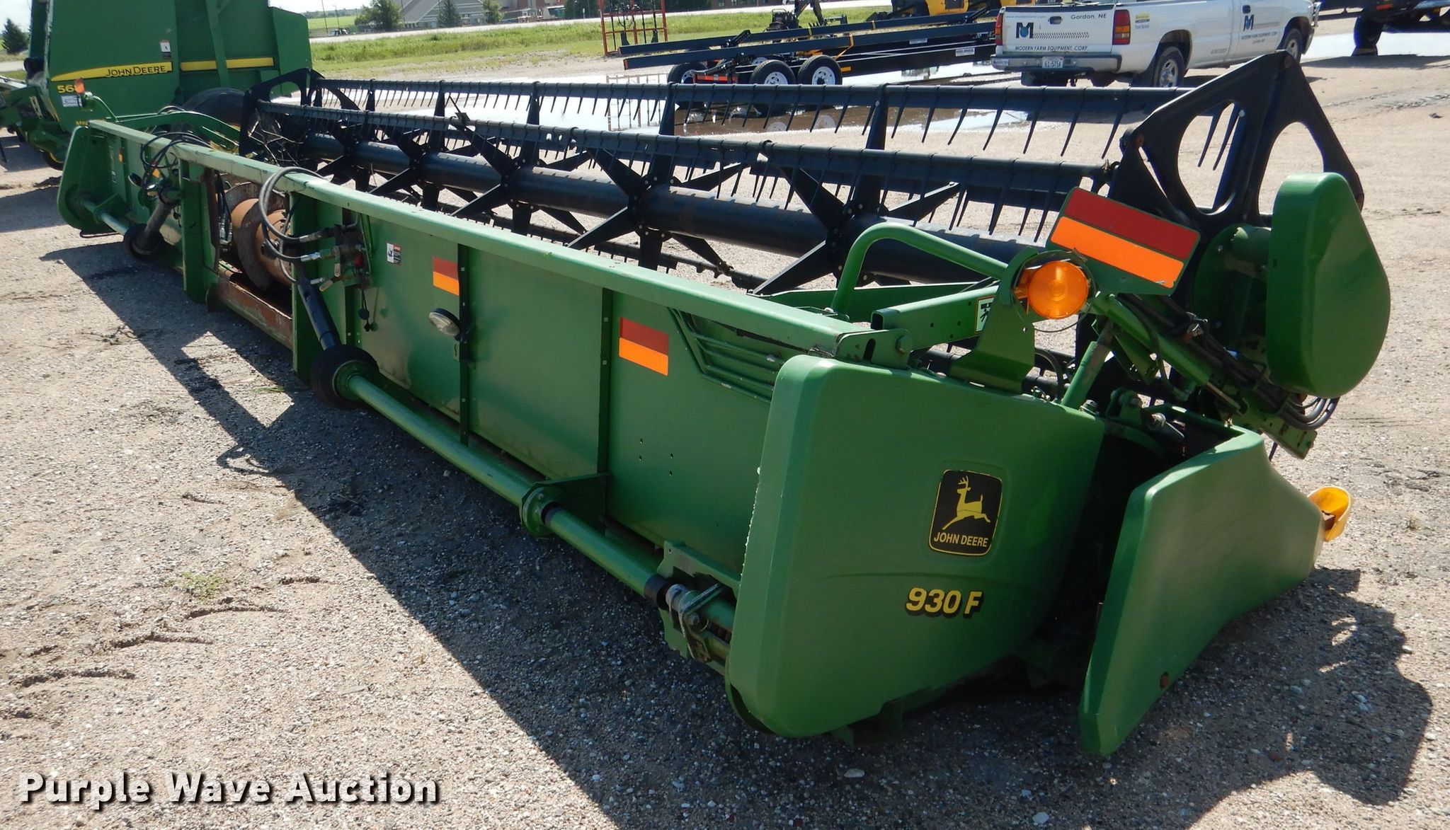 Purple Wave is selling a used Platform or Stripper Head in Nebraska. This item is a 2001 John Deere 930F flex head with the following: 30'W, Finger reel, Full finger auger, Hydraulic fore/aft, Hydraulic reel height control, Poly skid plates, Single point coupler, Dual drivelines, Unknown operating condition, Serial H00930F693100