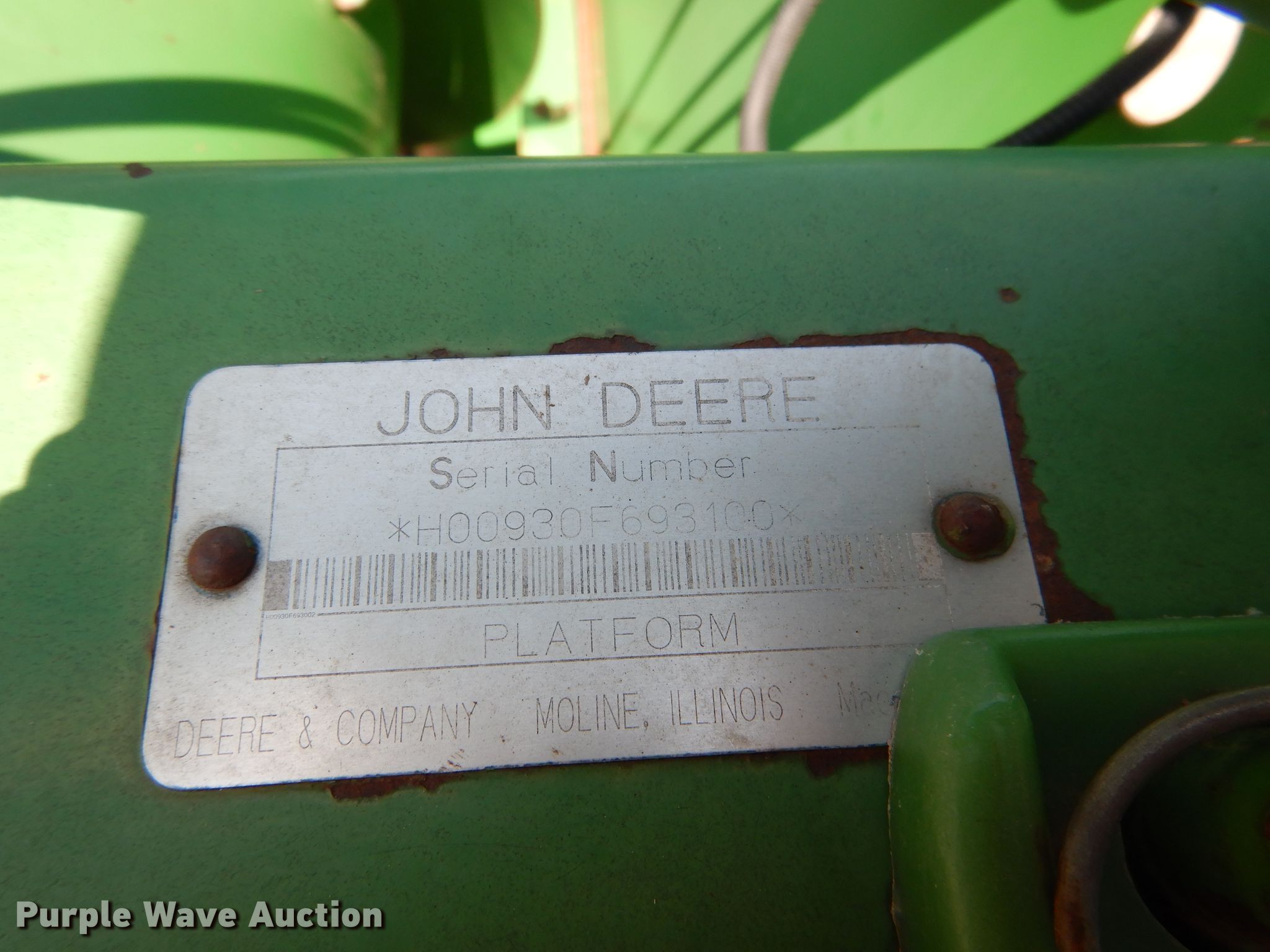 2001 John Deere 930F flex head. 30'W, Finger reel, Full finger auger, Hydraulic fore/aft, Hydraulic reel height control, Poly skid plates, Single point coupler, Dual drivelines, Unknown operating condition , Serial H00930F693100. Furnas County, NE. 71747 Meadowlark Trail. McCook, NE 69001