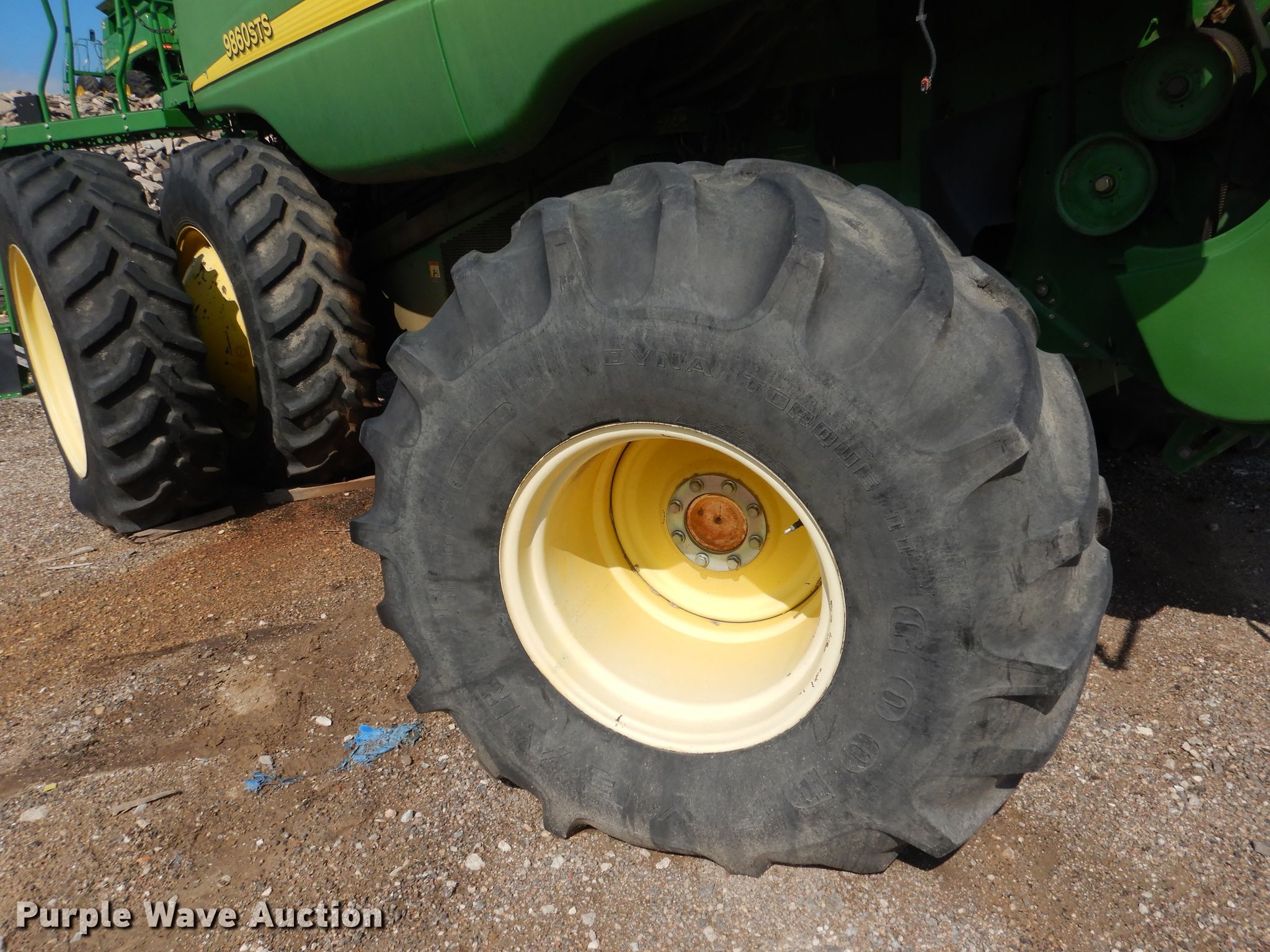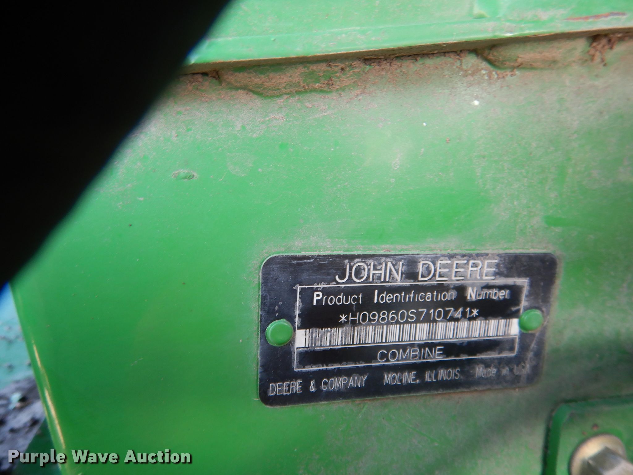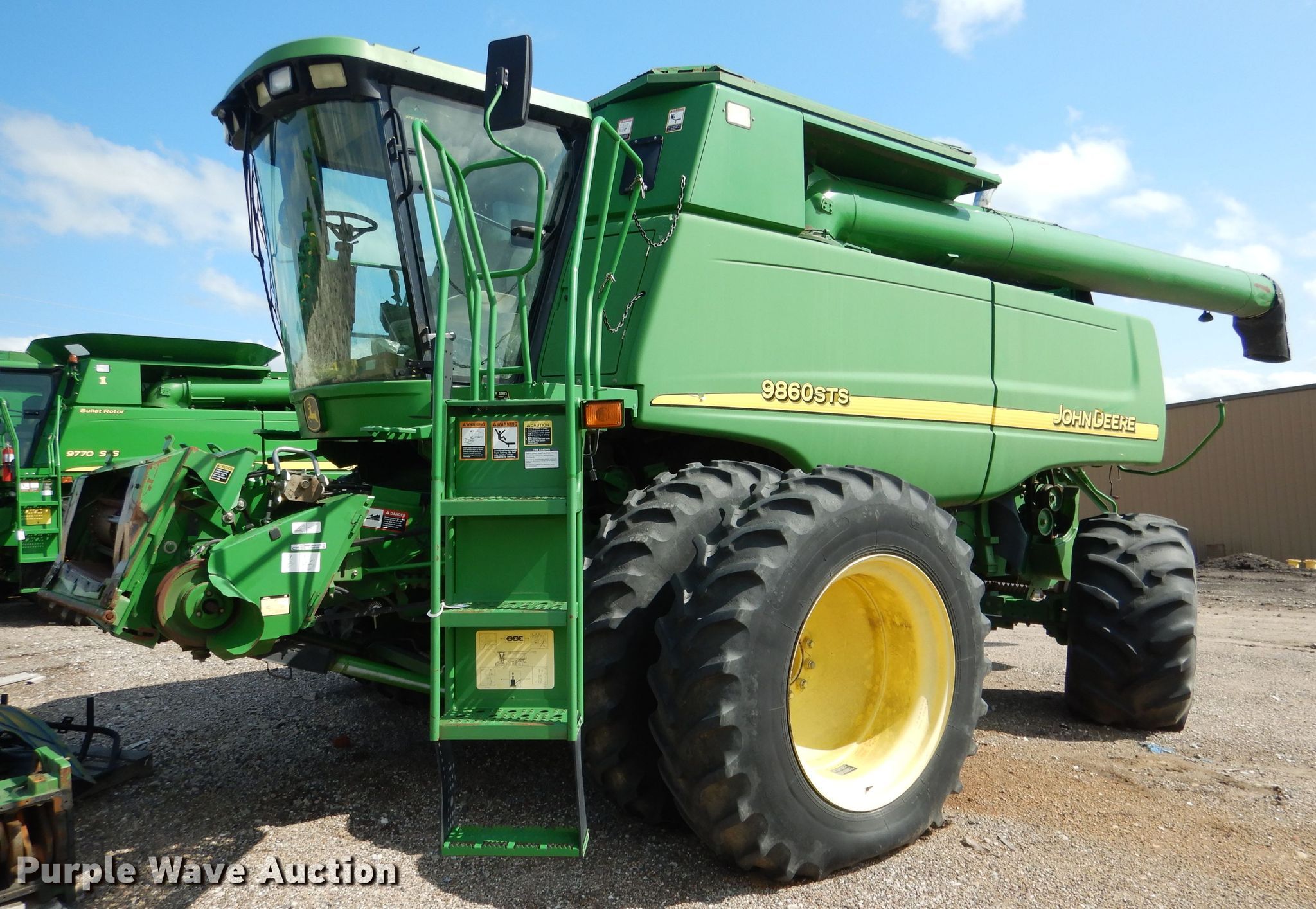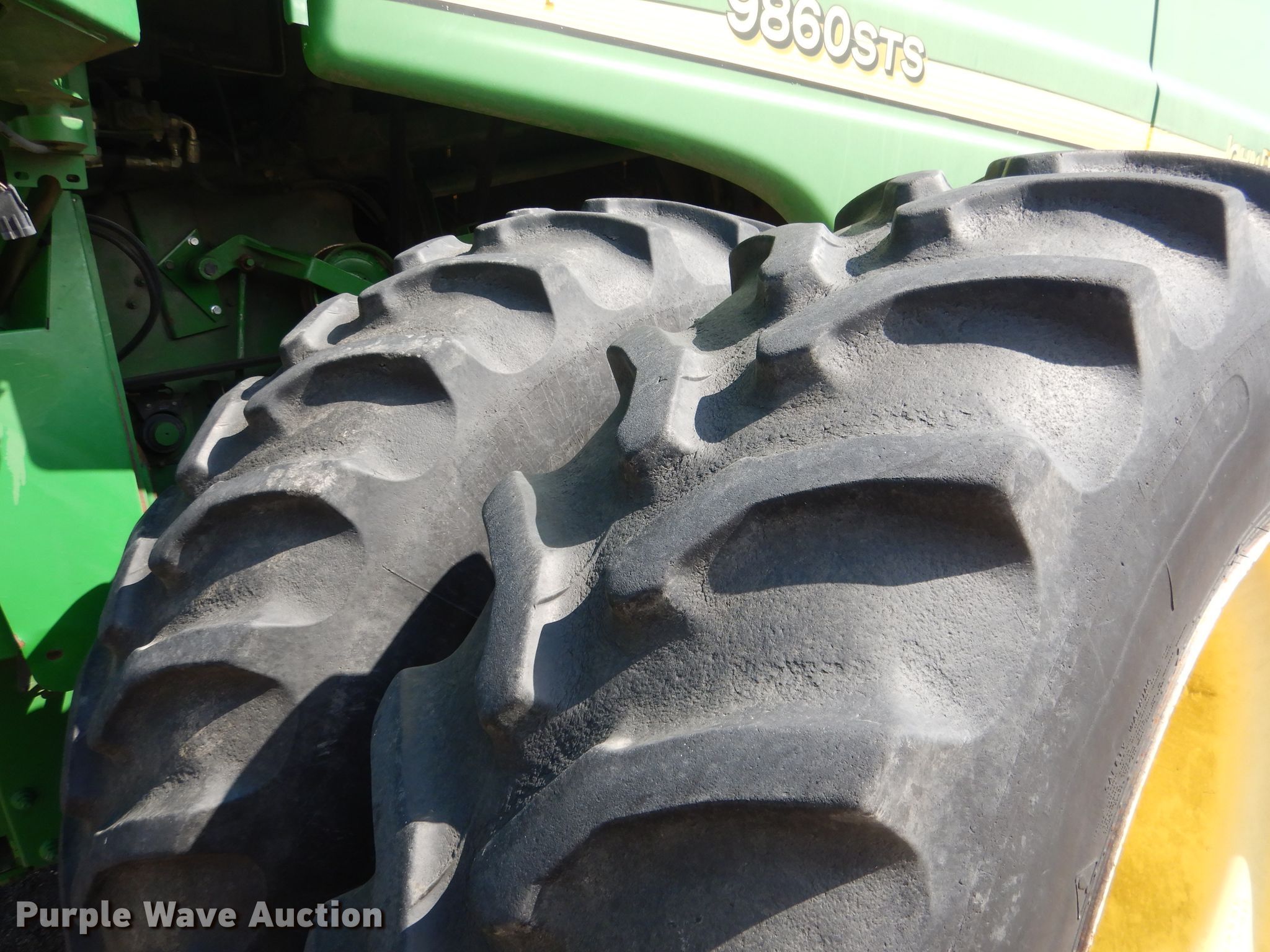 Purple Wave is selling a used Combine in Nebraska. This item is a 2005 John Deere 9860 STS combine with the following: 2,614 engine hours on meter, 1,768 separator hours on meter, 12.5L six cylinder diesel engine, Hydrostatic transmission, 3F-1R gears, Feederhouse, Lateral tilt, Variable speed, Multi-speed, Reverser, Single point header coupler, AC and heat, Small wire concaves, Chaff spreader, Straw chopper, Bin extensions, 22.5'L unloading auger, Goodyear 20.8R42 dual front tires, Goodyear 28L-26 rear tires, Operator manual, Tools not included, Service records available upon request, Serial H09860S7107