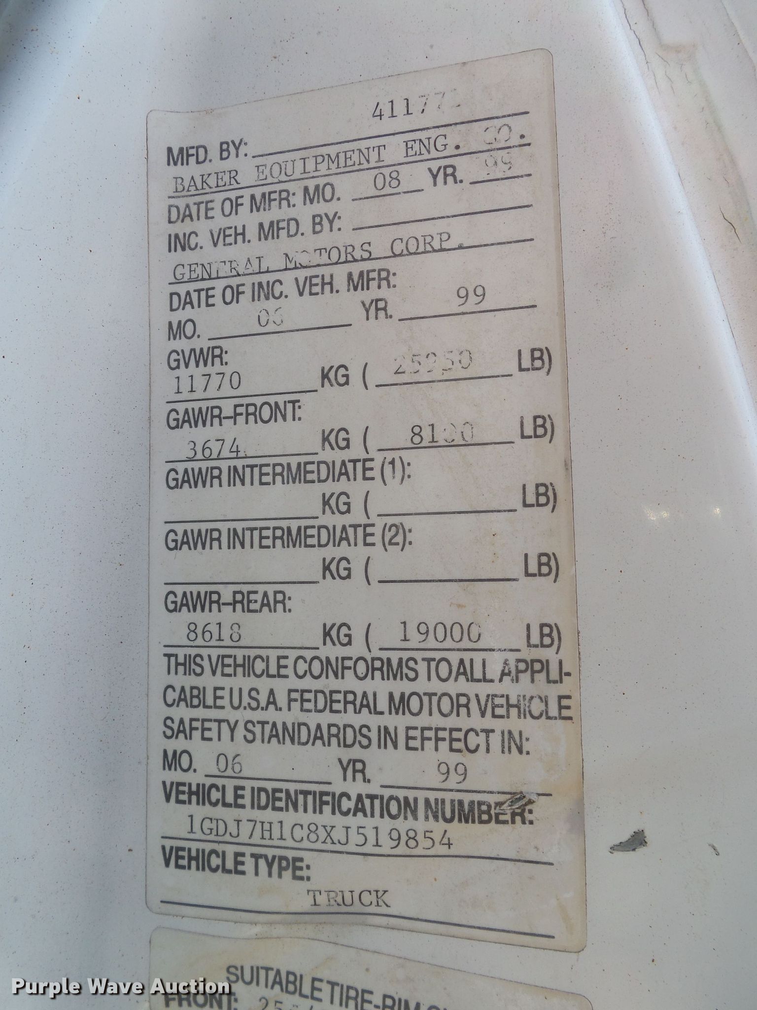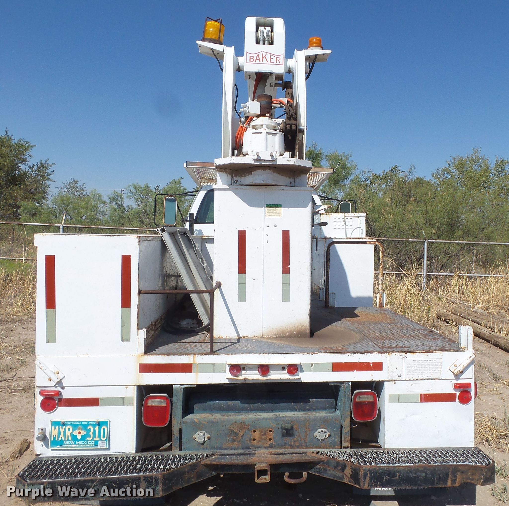 Purple Wave is selling a used Bucket Truck in New Mexico. This item is a 1999 GMC C6500 bucket truck with the following: 205,664 miles on odometer, Caterpillar 3126 7.2L L6 diesel engine, 142 HP, Serial 7AS80143, Automatic transmission, Single axle, Baker 1131-411771 utility bed, 1999 Baker 800-40 boom, 35' boom length, 500 lbs max lift capacity, 35' max lift height, Telescopic boom, Man basket, Platform controls, Serial 99-07-223-816, Spring suspension, Hydraulic brakes, 255/70R22.5 tires, GVWR 25,950 lbs, Engine issues, Non-operational unit