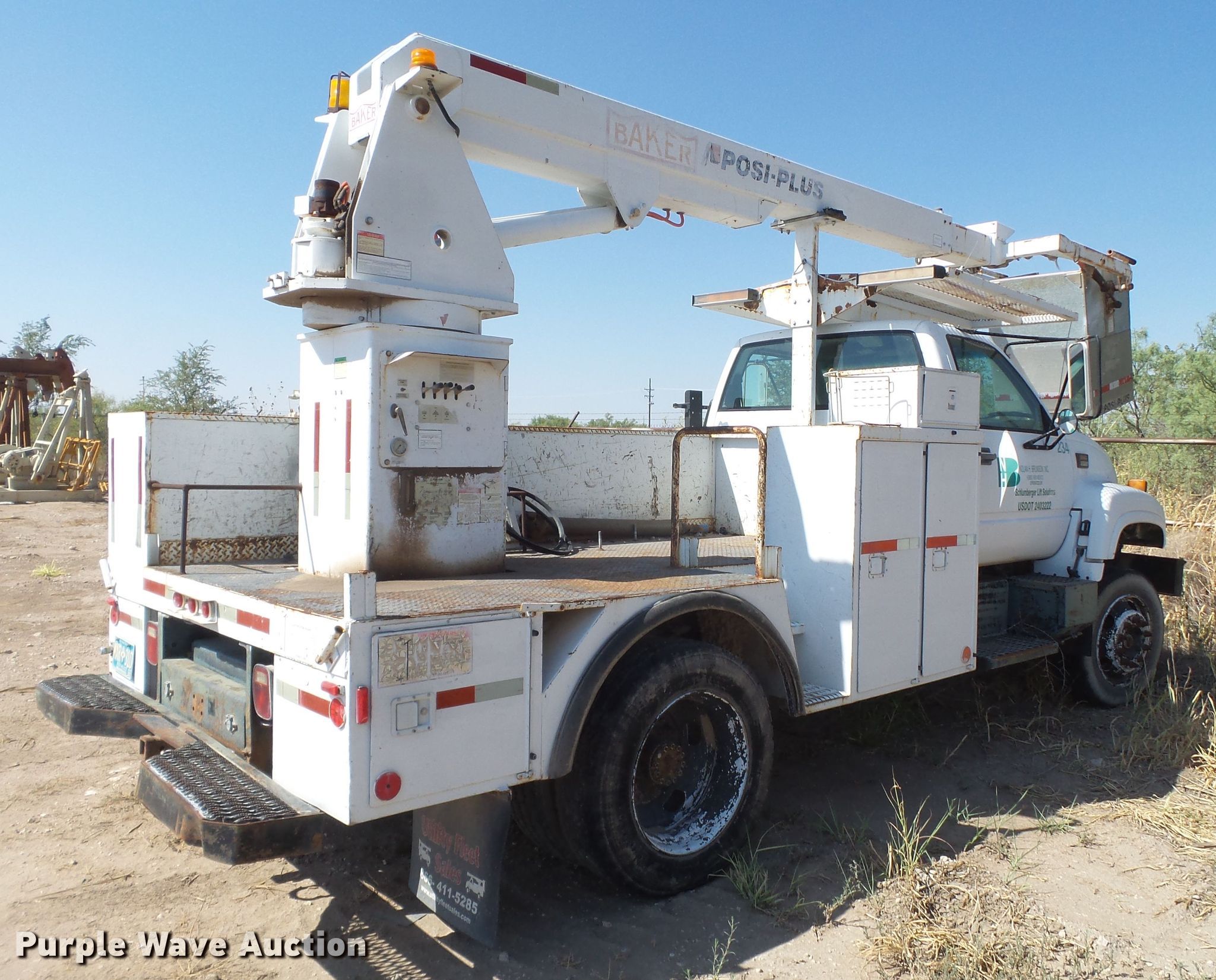 1999 GMC C6500 bucket truck. 205,664 miles on odometer, Caterpillar 3126 7.2L L6 diesel engine 142 HP, Serial 7AS80143, Automatic transmission, Single axle, Baker 1131-411771 utility bed, 1999 Baker 800-40 boom 35' boom length, 500 lbs max lift capacity, 35' max lift height, Telescopic boom, Man basket, Platform controls, Serial 99-07-223-816, Spring suspension, Hydraulic brakes, 255/70R22.5 tires, GVWR 25,950 lbs, Engine issues, Non-operational unit. New Mexico title. 1GDJ7H1C8XJ519854. Schlumberger. 1105 W Bender Blvd. Hobbs, NM 88240