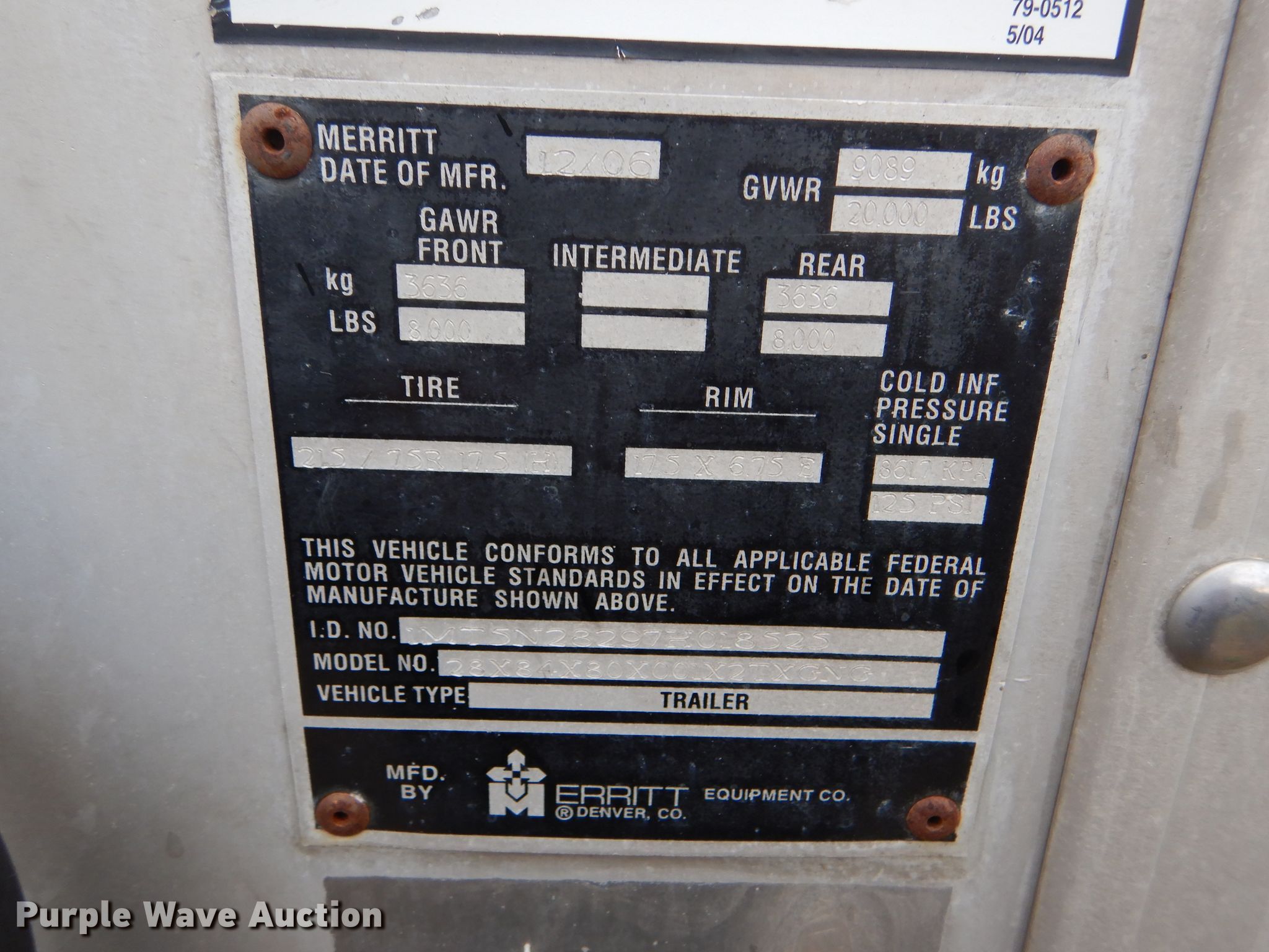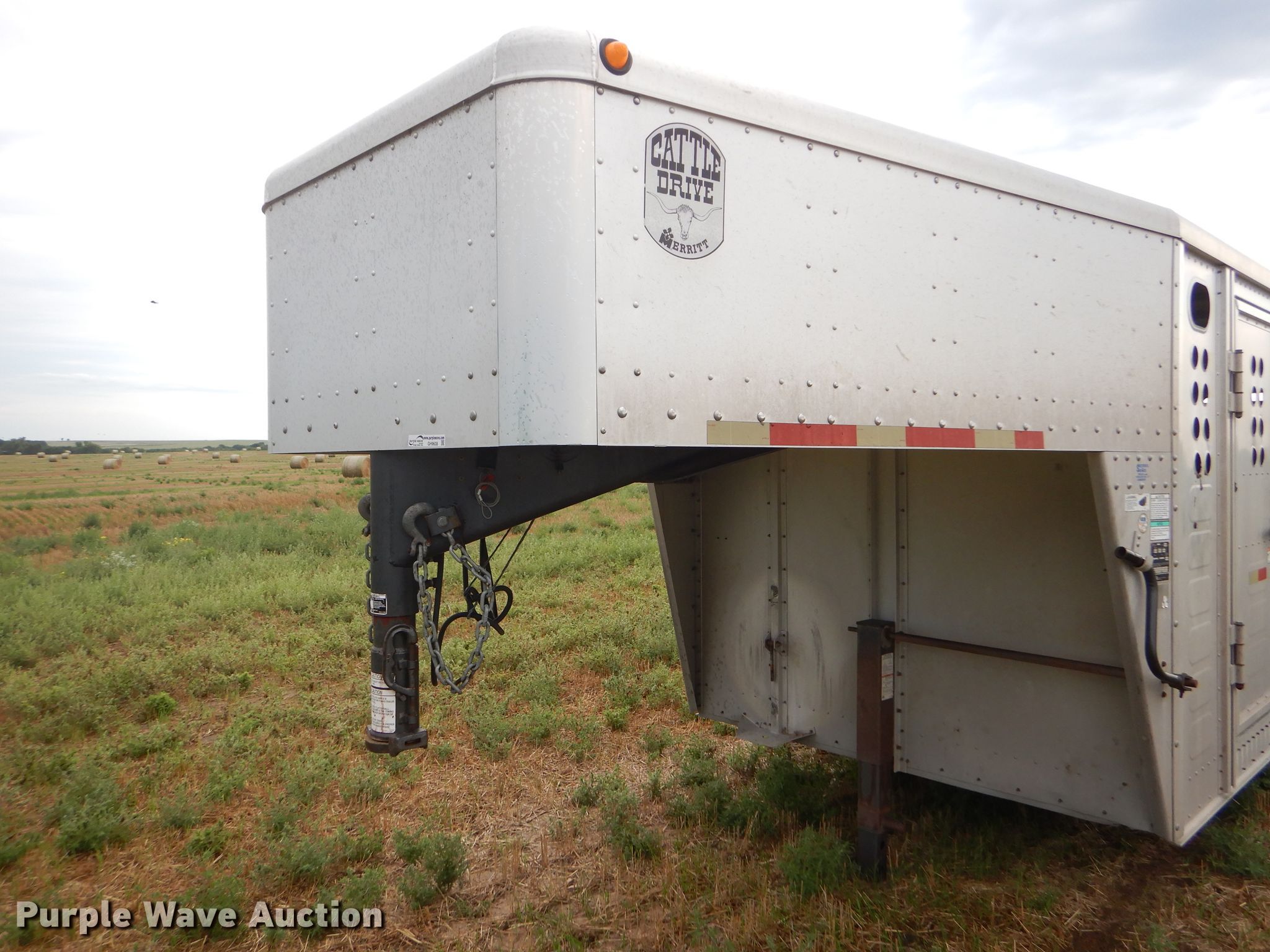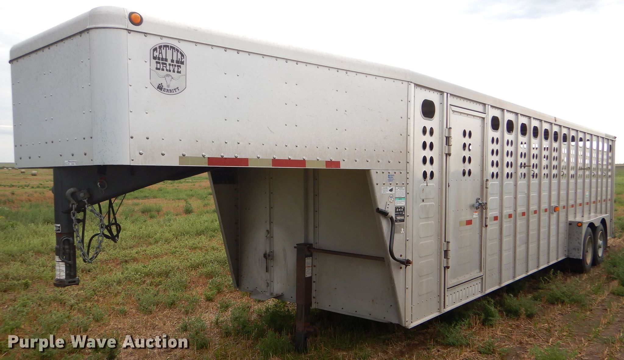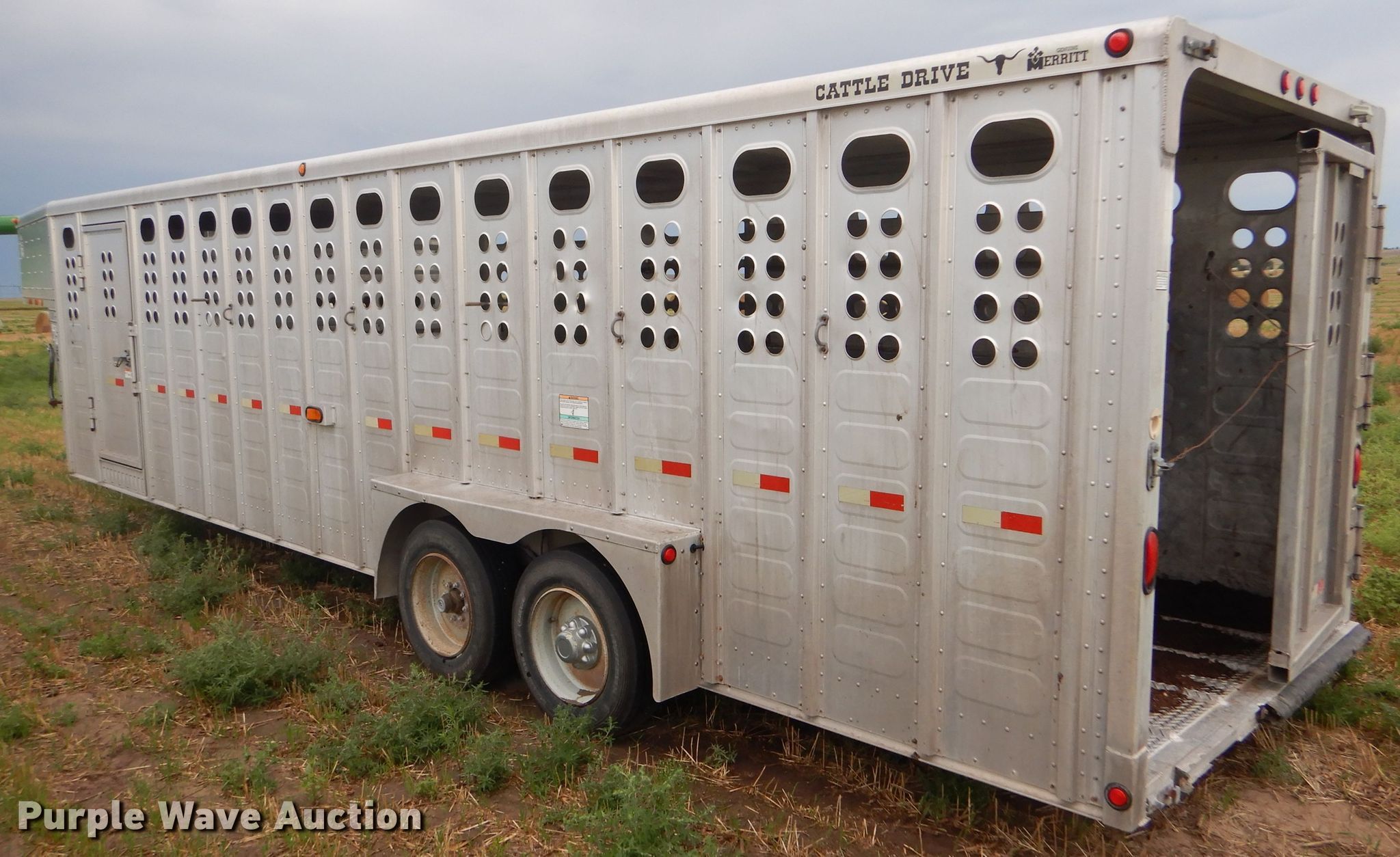Purple Wave is selling a used Livestock Trailer in Kansas. This item is a 2007 Merritt Cattle Drive livestock trailer with the following: 36'L overall, 28'L x 84"W body, (2) center gates, Ground load, Aluminum construction, Single leg landing gear, Spring suspension, Electric brakes, Tandem axle, Aluminum wheels, 215/75R17.5 tires, GVWR 20,000 lbs