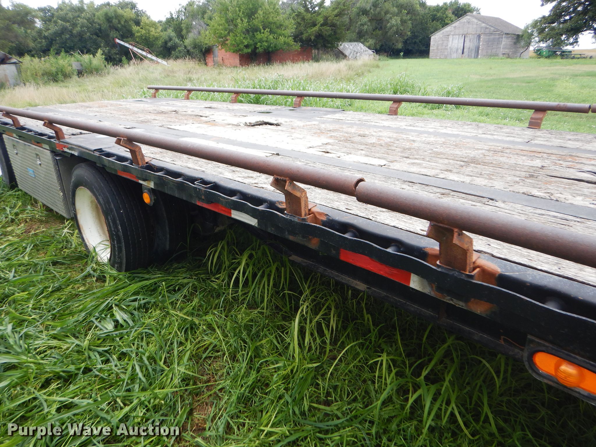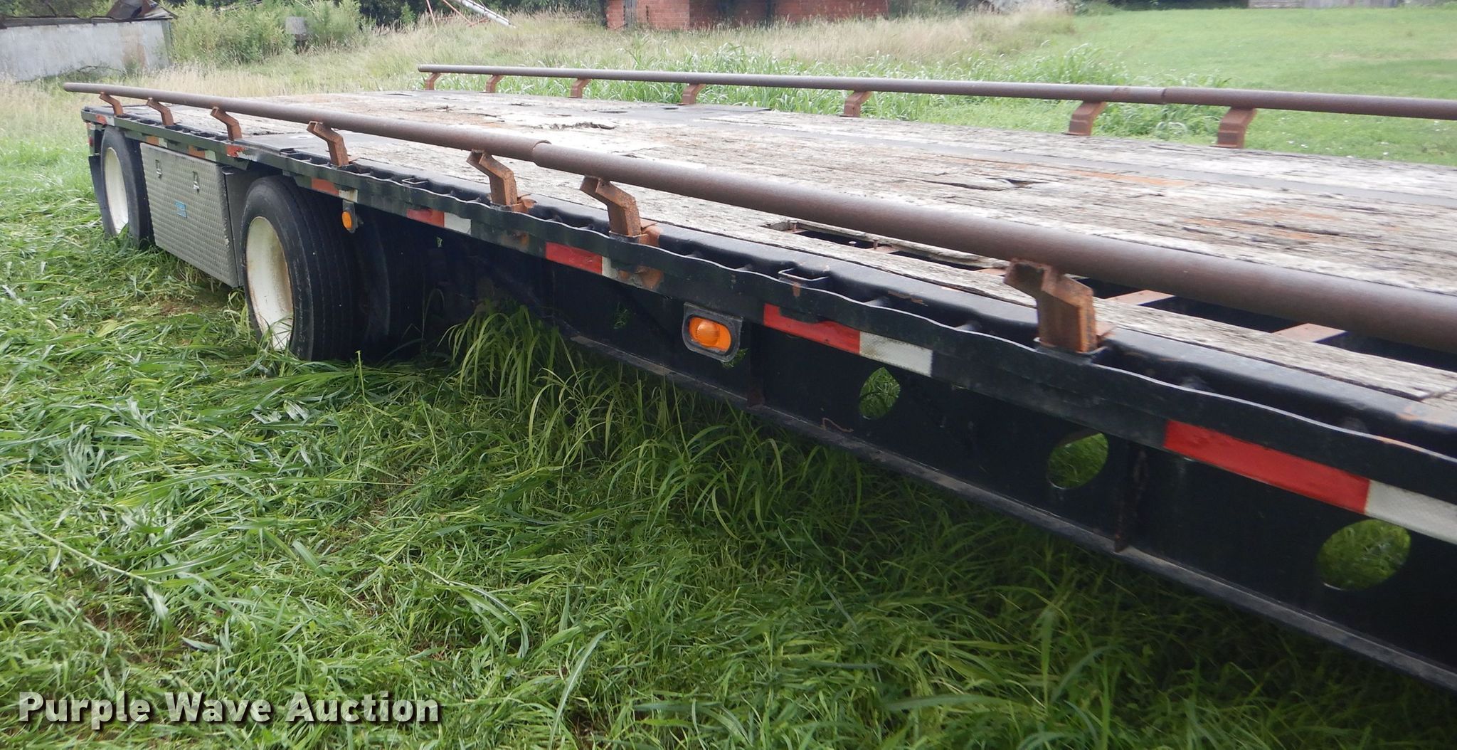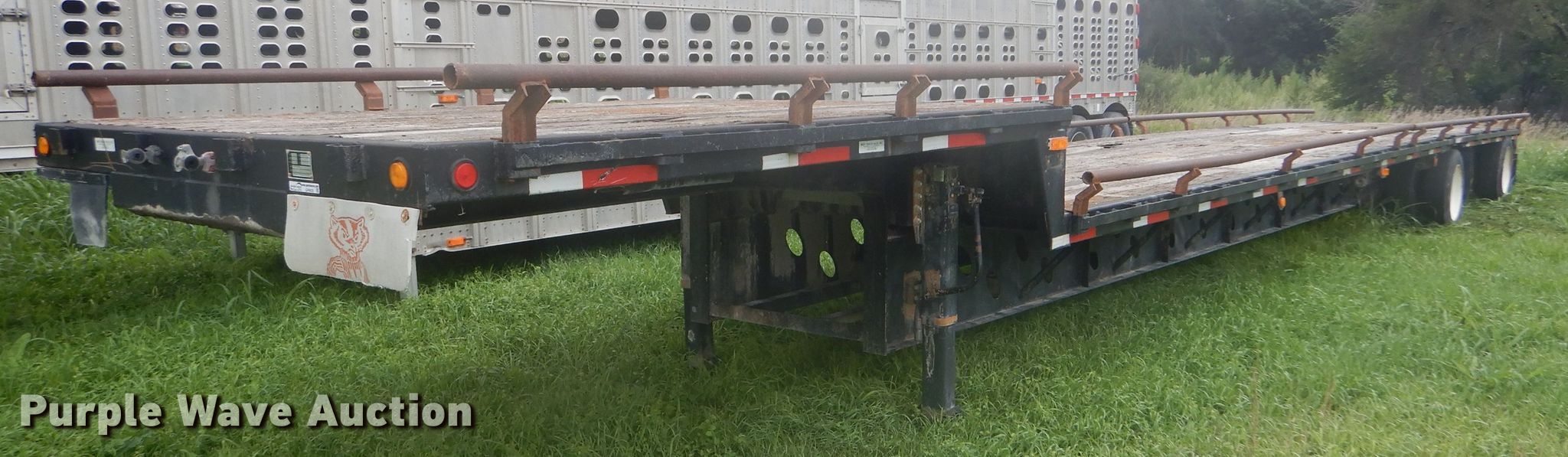 Purple Wave is selling a used Flat or Drop Deck Trailer in Kansas. This item is a 1997 Talbot drop deck trailer with the following: 53'L x 102"W overall, 11'L x 98"W top deck, 42'L x 98"W main deck, Wood deck, Bale extensions, Dual leg landing gear, Air suspension, Air brakes, Steel wheels, 225/70R22.5 tires