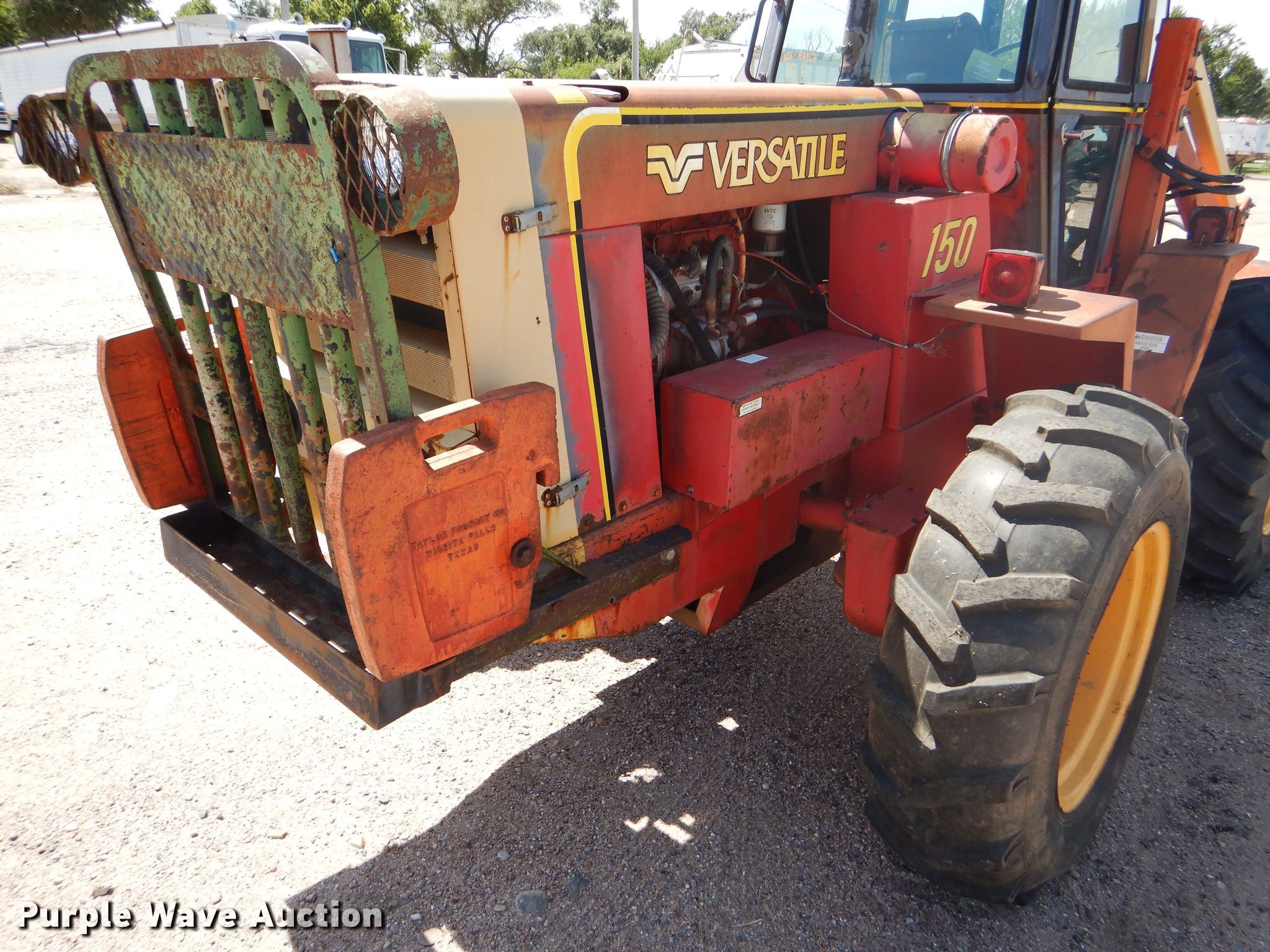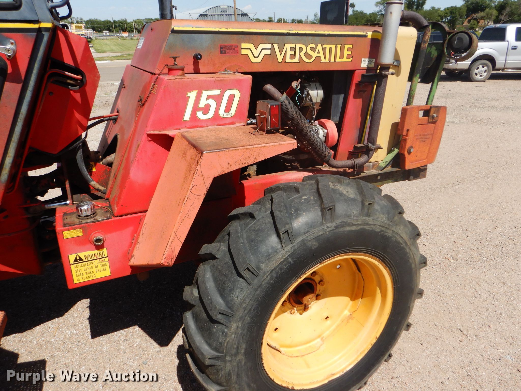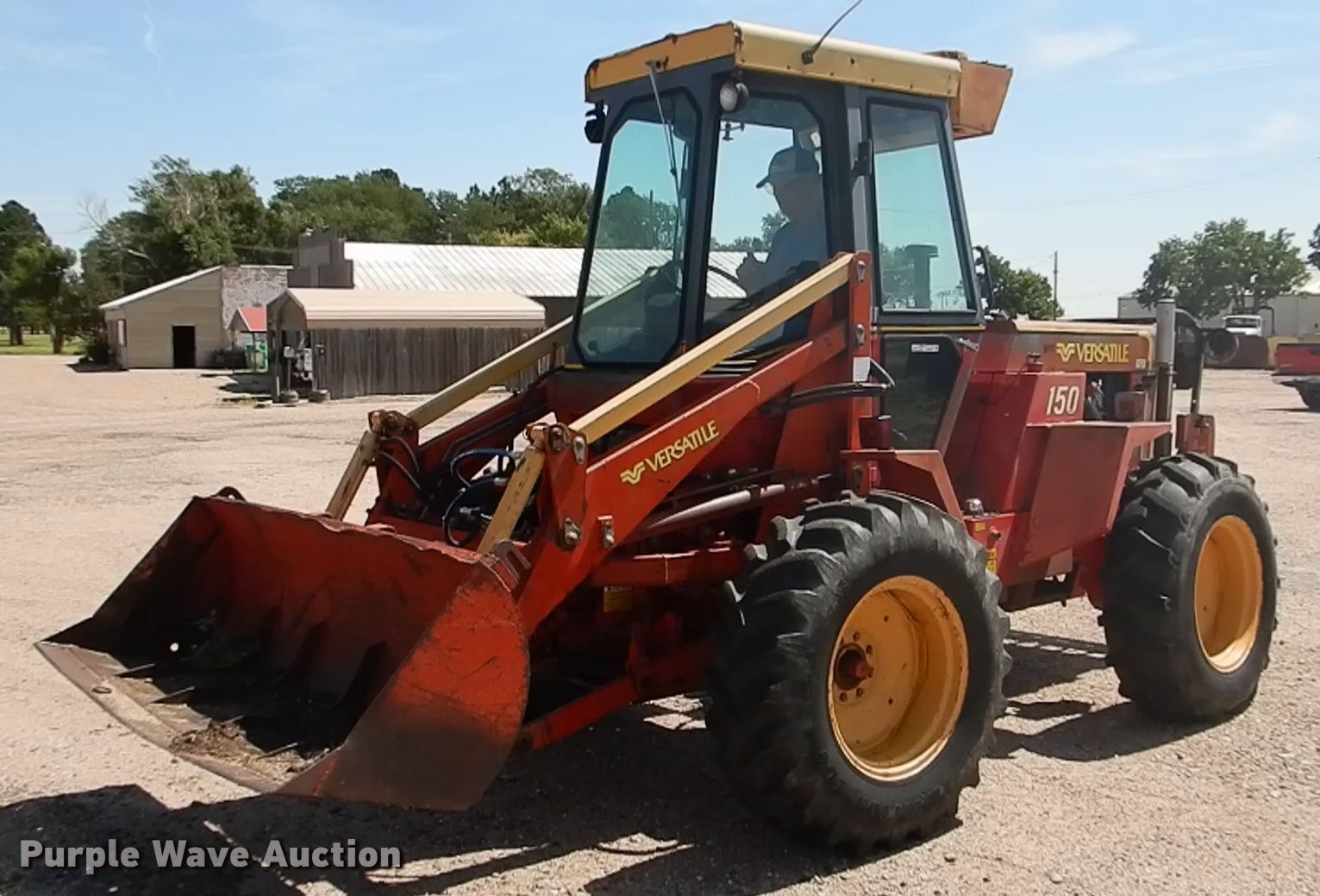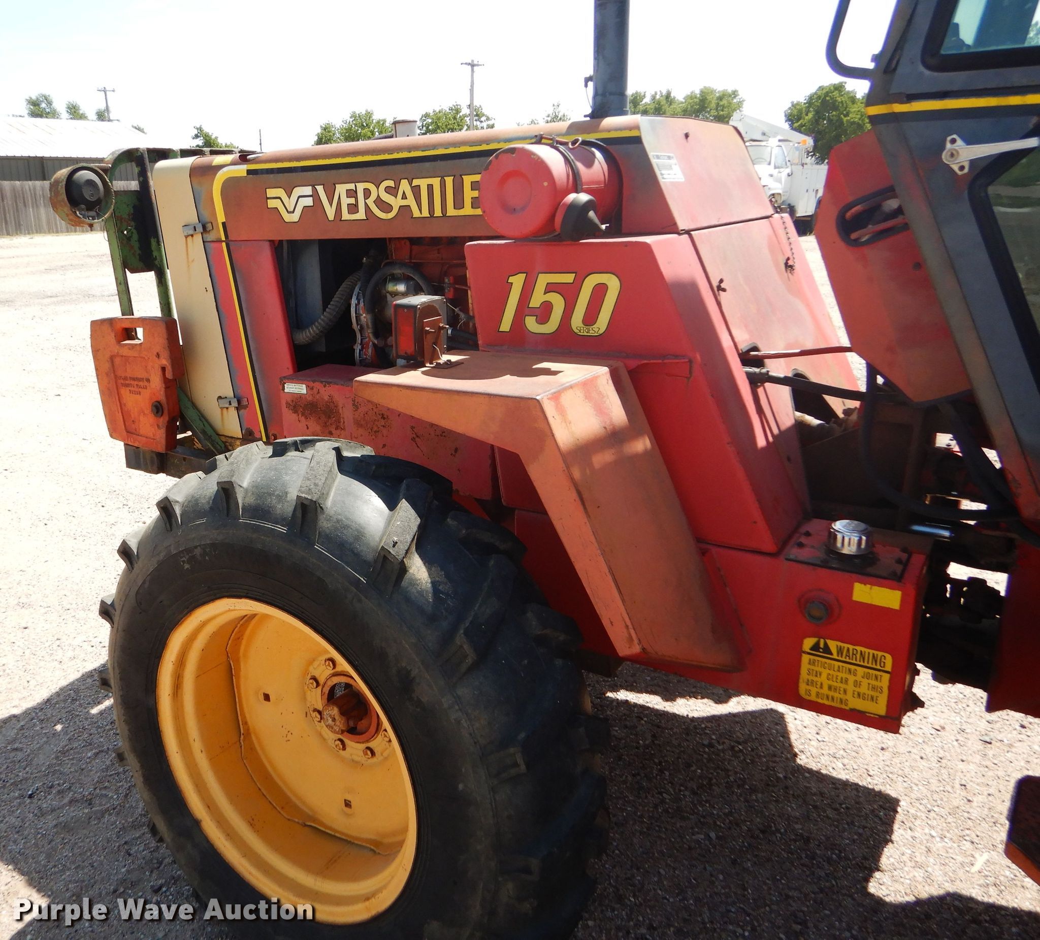 Purple Wave is selling a used Tractor in Kansas. This item is a 1980 Versatile 150 Series II 4WD bi-directional tractor with the following: 3,395 hours on meter, Perkins 3.9L four cylinder diesel engine, Hydrostatic transmission, 3F-3R gears, AC and heat, Versatile 1450 loader, 84"W bucket, Two-lever controls, Three point, 540 PTO, (3) rear hydraulic remote sets, Rear weights, 13.6-24 tires, Unknown operating condition of AC, PTO cable needs to be replaced, Serial 000995