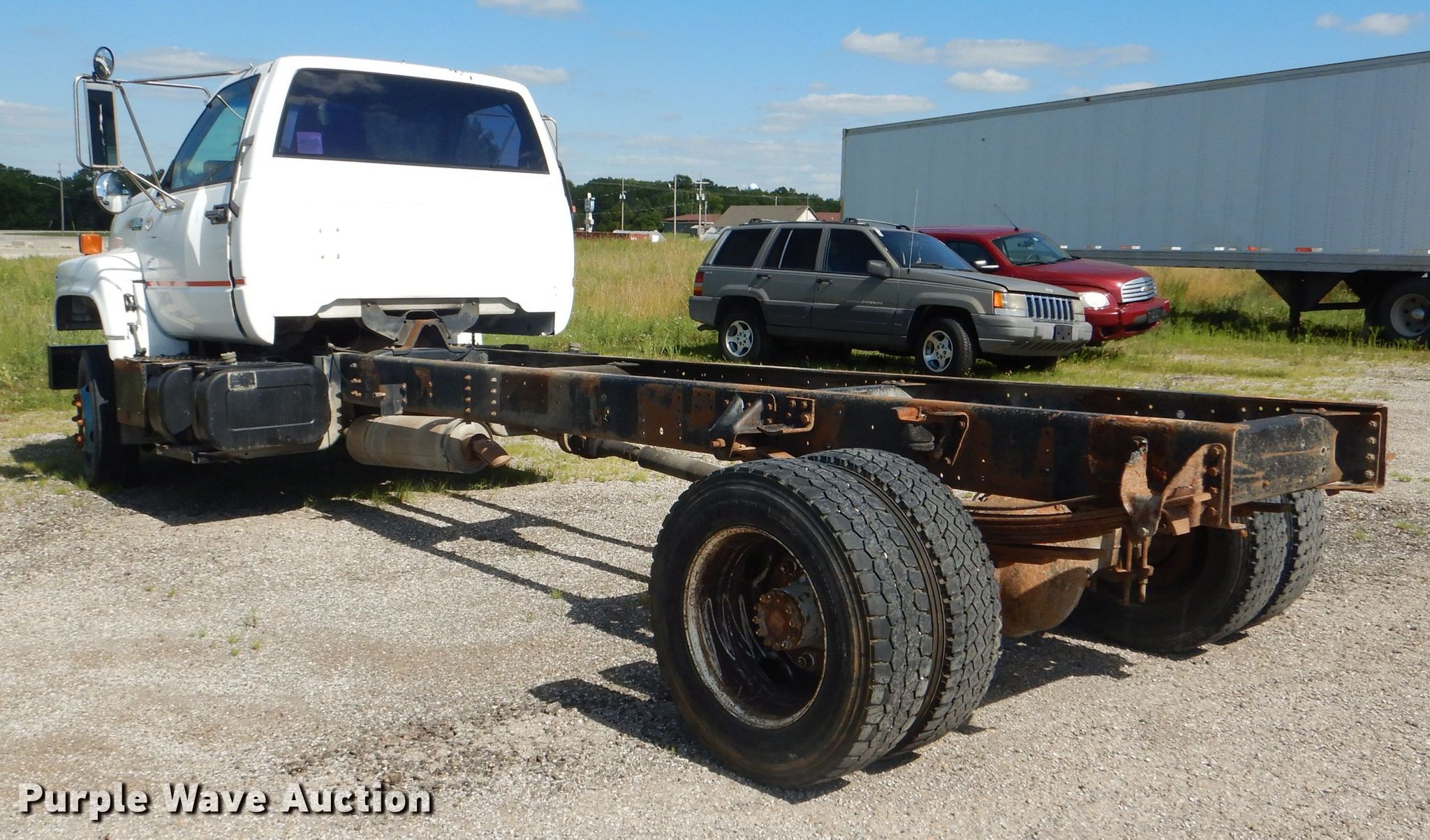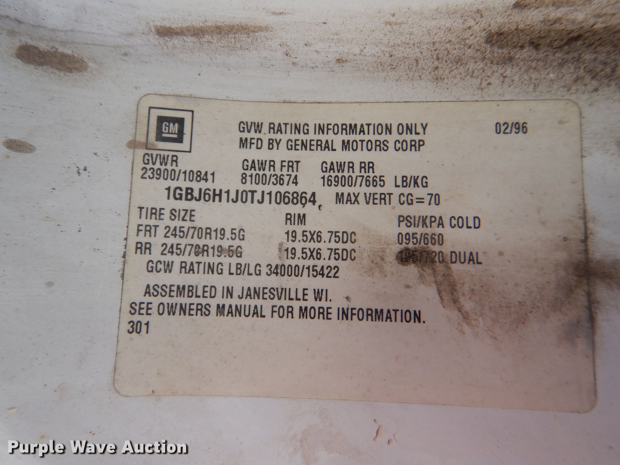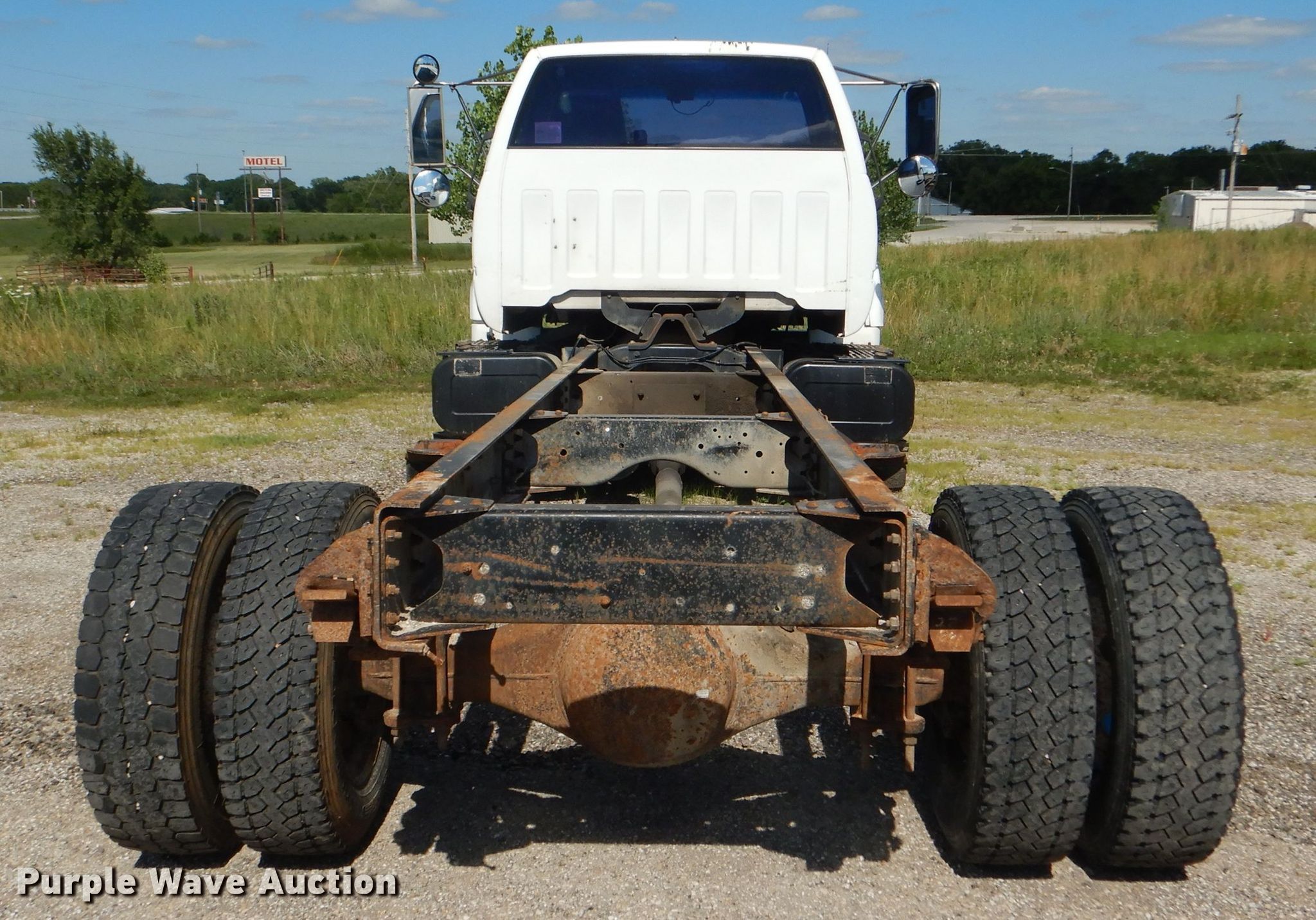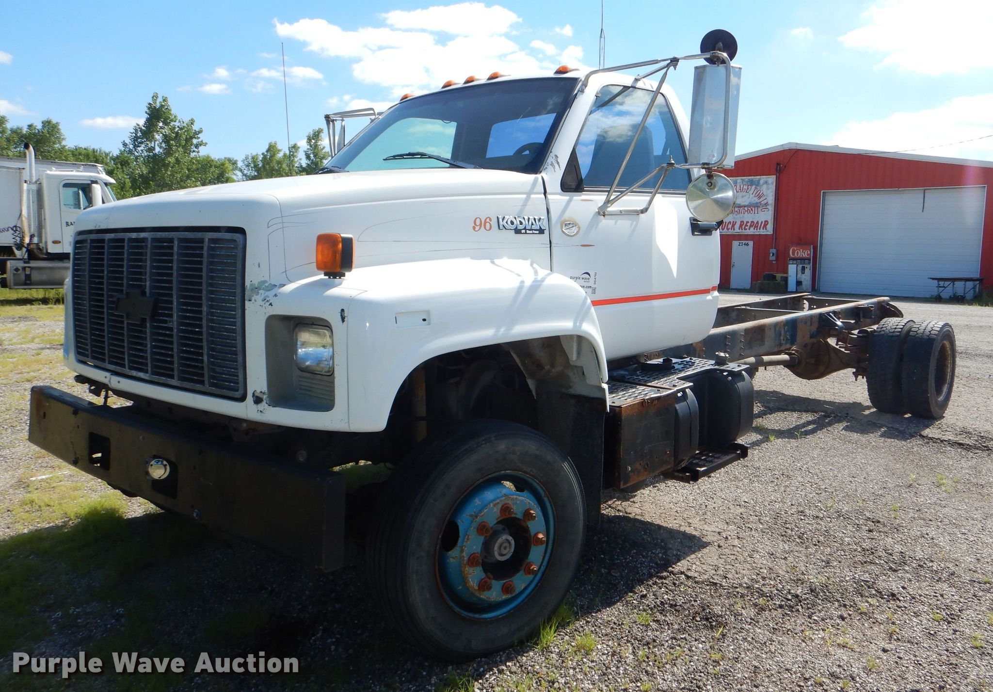 Purple Wave is selling a used Truck Chassis in Kansas. This item is a 1996 Chevrolet Kodiak C6500 truck cab and chassis with the following: 206,710 miles on odometer, Caterpillar 3116 DITA 6.6L six cylinder diesel engine, 280 HP, Serial 7HJ08370, Six speed manual transmission, Single axle, AC and heat, Power windows and locks, Air compressor lines for pneumatic tools, Spring suspension, Hydraulic brakes, 18' wheelbase, 245/70R19.5 tires, GVWR 23,900 lbs, Cracked windshield, No taillights, Some interior panels have been removed, but included