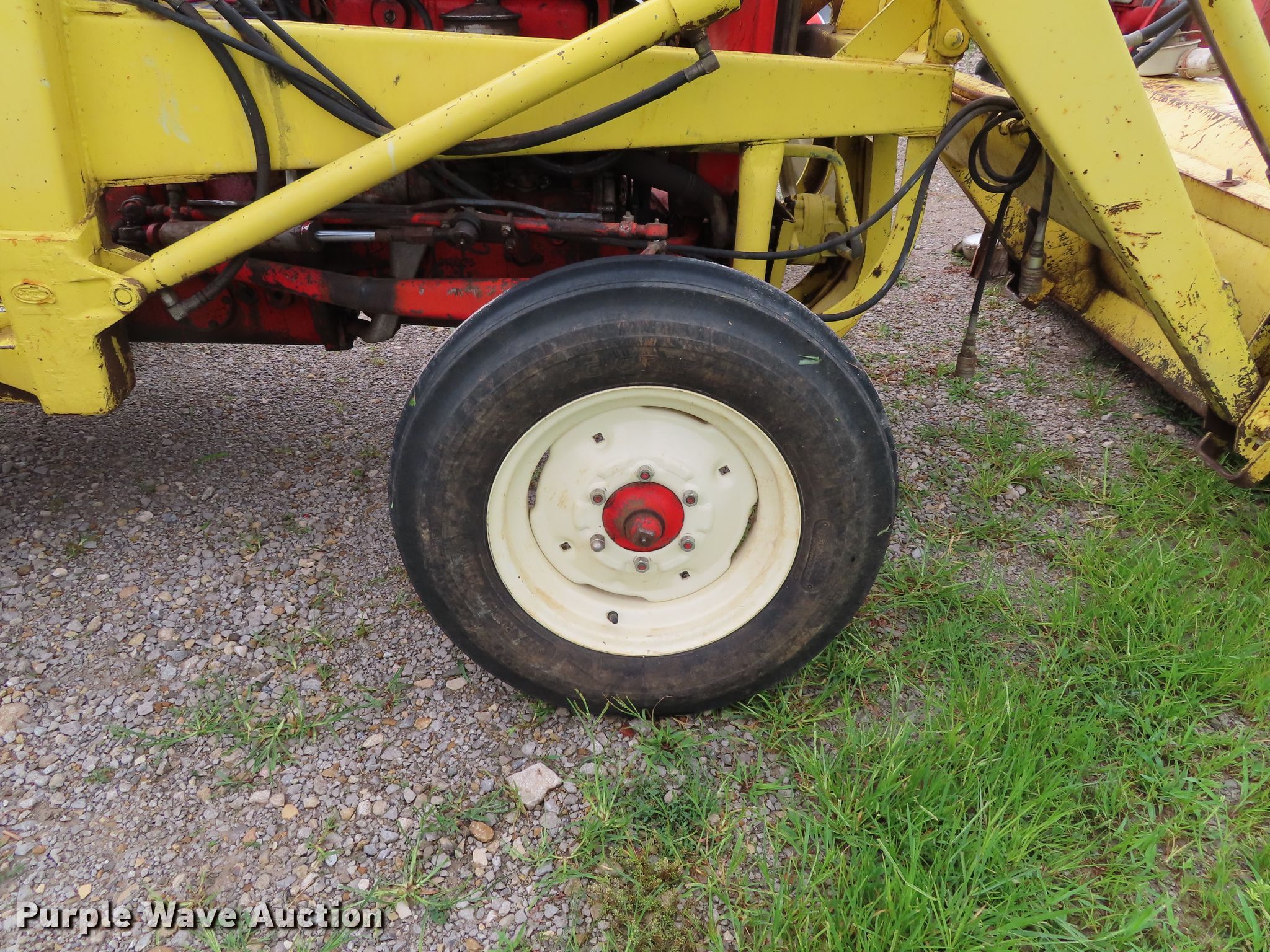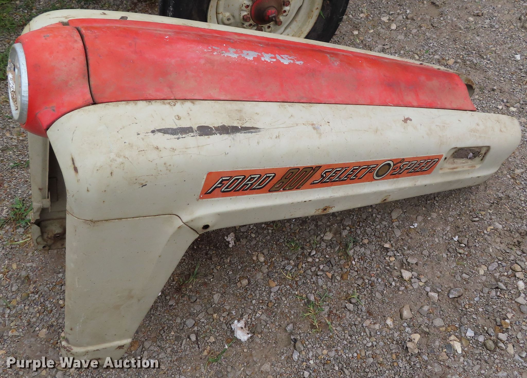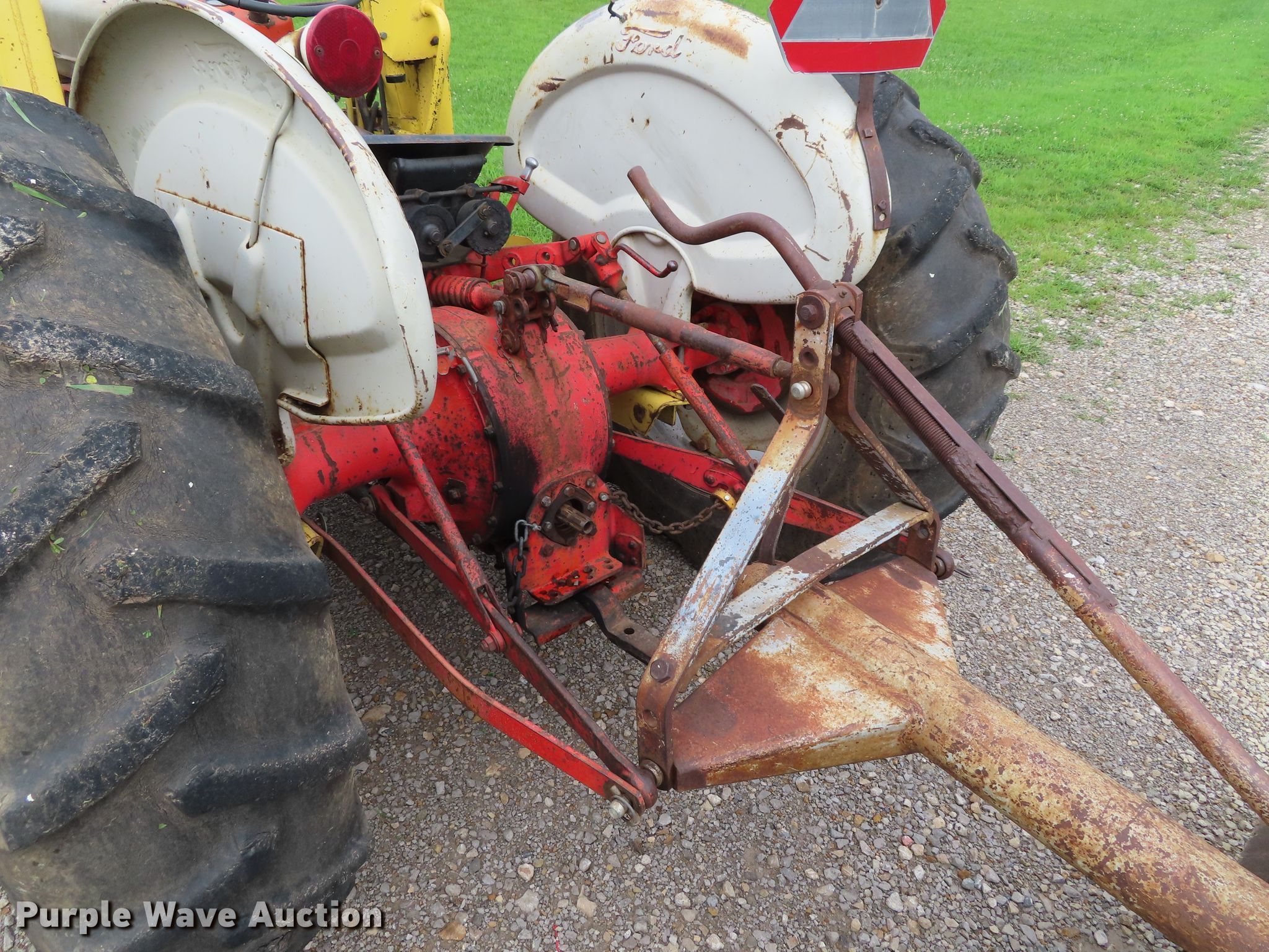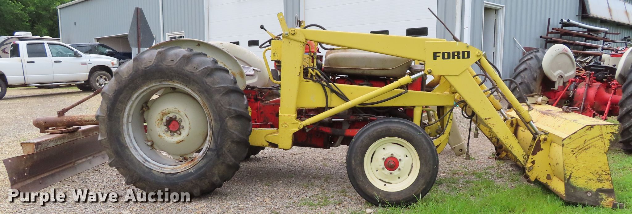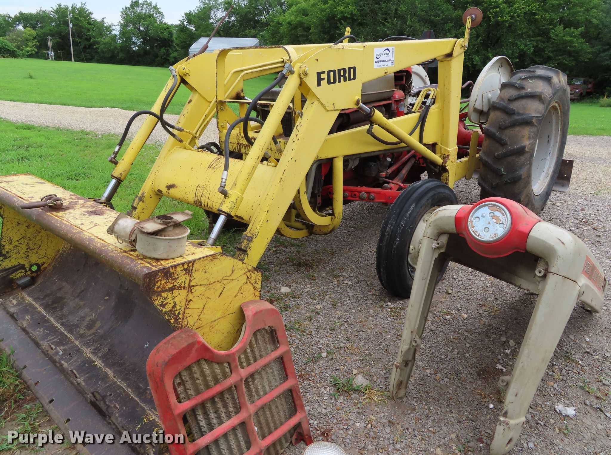 Purple Wave is selling a used Tractor in Kansas. This item is a Ford 801 tractor with the following: 1,600 hours on meter, Four cylinder gas engine, 10F-2R gears, Ford loader, 66"W bucket, Two-lever controls, Three point, Top link, 72" rear blade, 74" wheelbase, 6.00-16 front tires, 14.9-28 rear tires