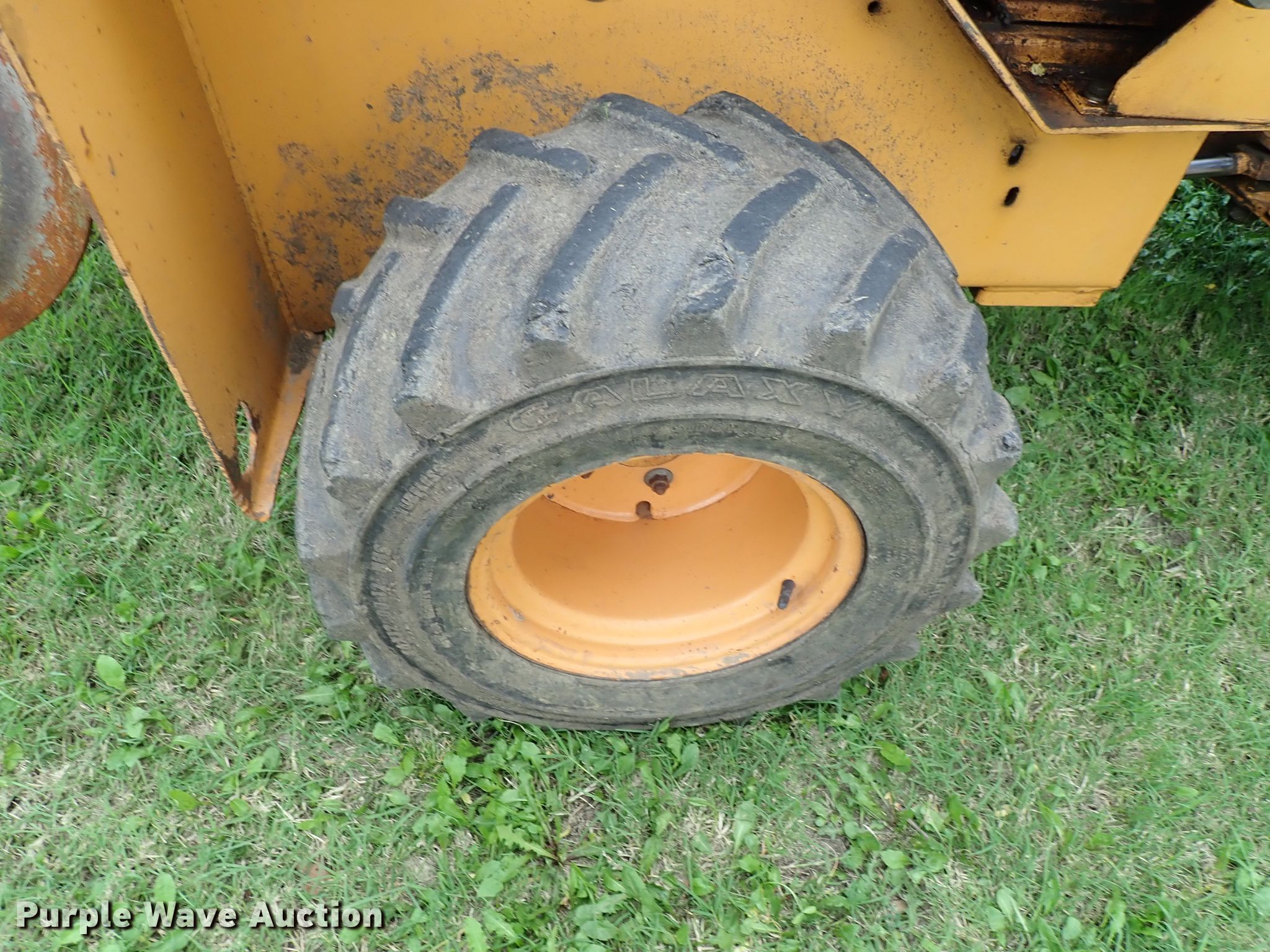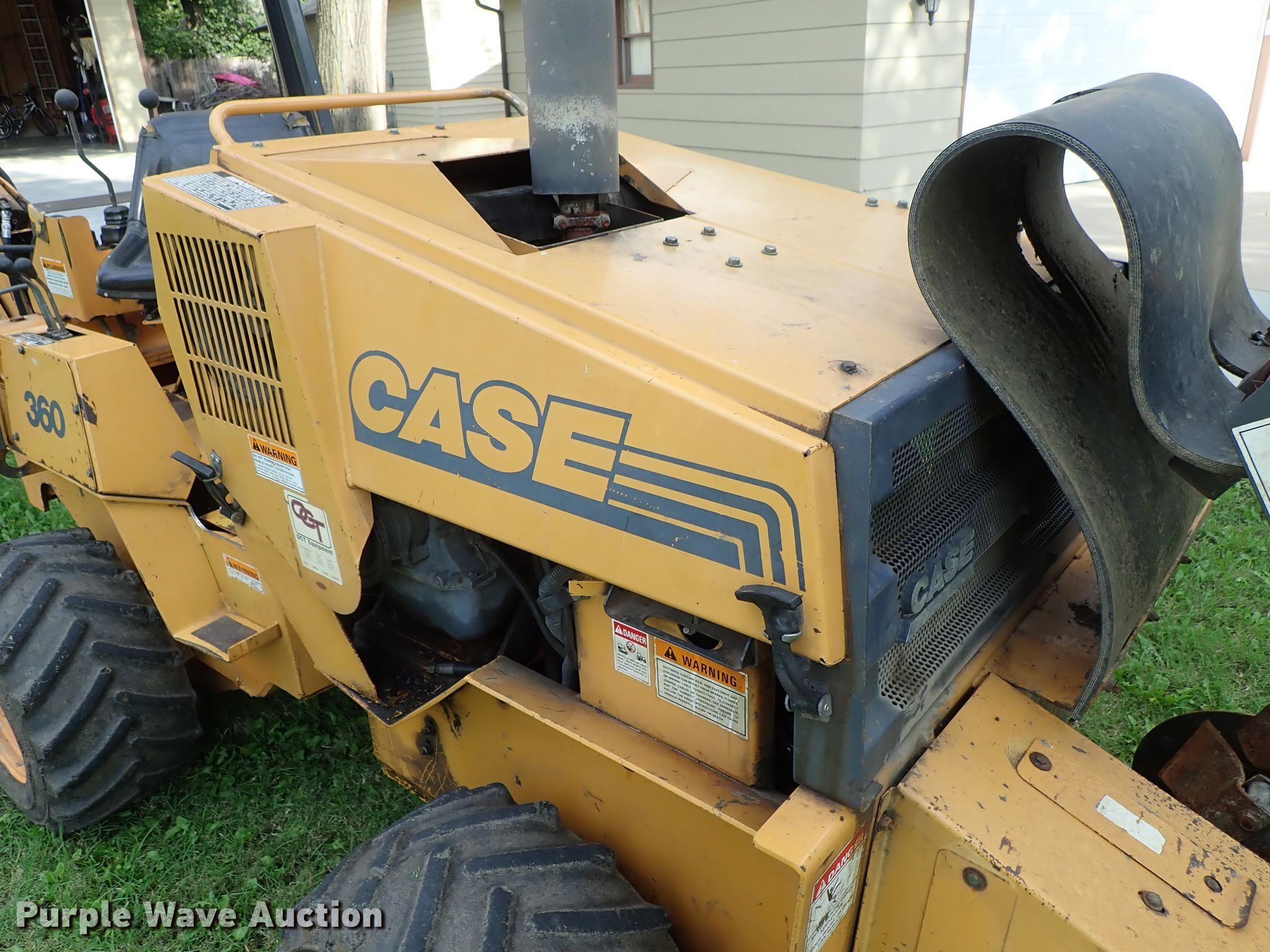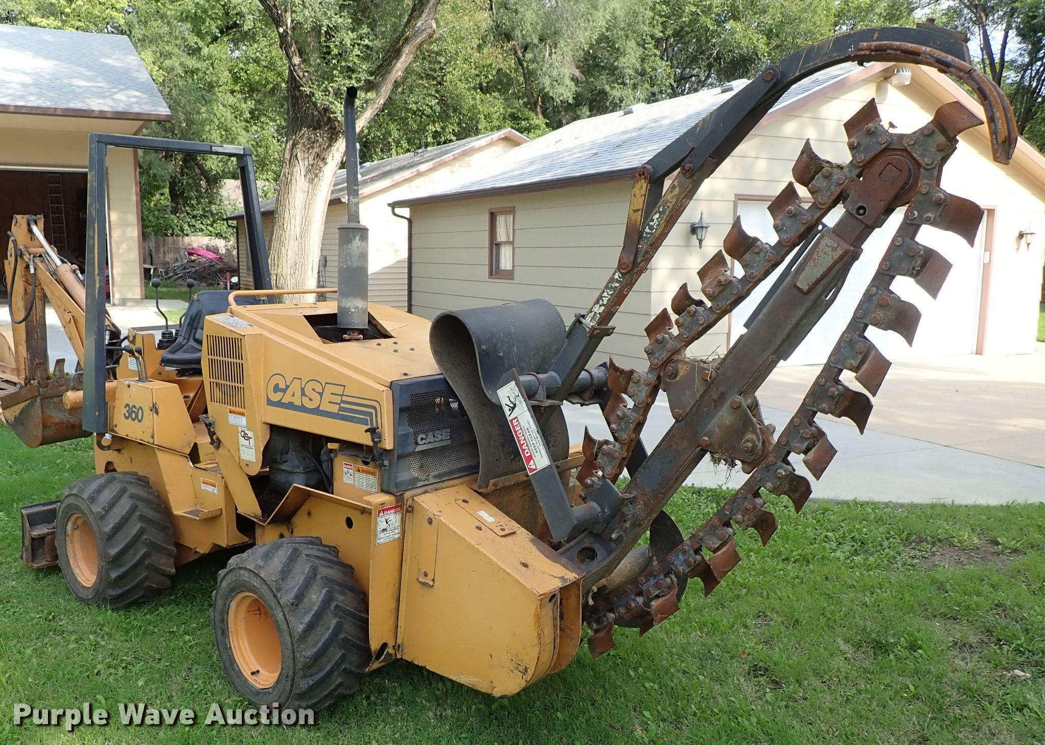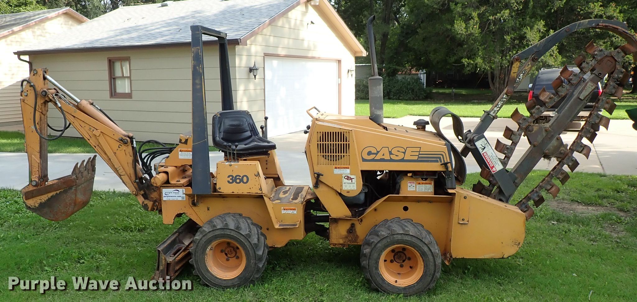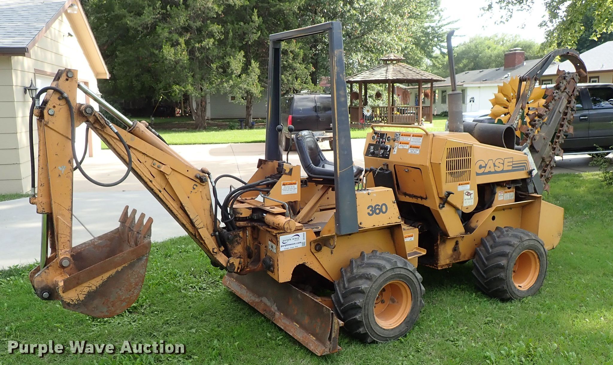 Purple Wave is selling a used Trencher or Rock Saw in Kansas. This item is a 1999 Case 360 trencher with the following: 2,362 hours on meter, Deutz two cylinder diesel engine, Hydrostatic transmission, Four wheel drive, Four-way backfill blade, 64"L trencher boom, 6" cutting width, Dirt teeth, Manual crumber, Backhoe model D100, 18"W bucket, Serial DFG0009192, 26 x 12.00-12NHS tires, Steering issue, Unit will only steer one direction, Fuel line must be closed for unit to stop, Serial JAF0279586