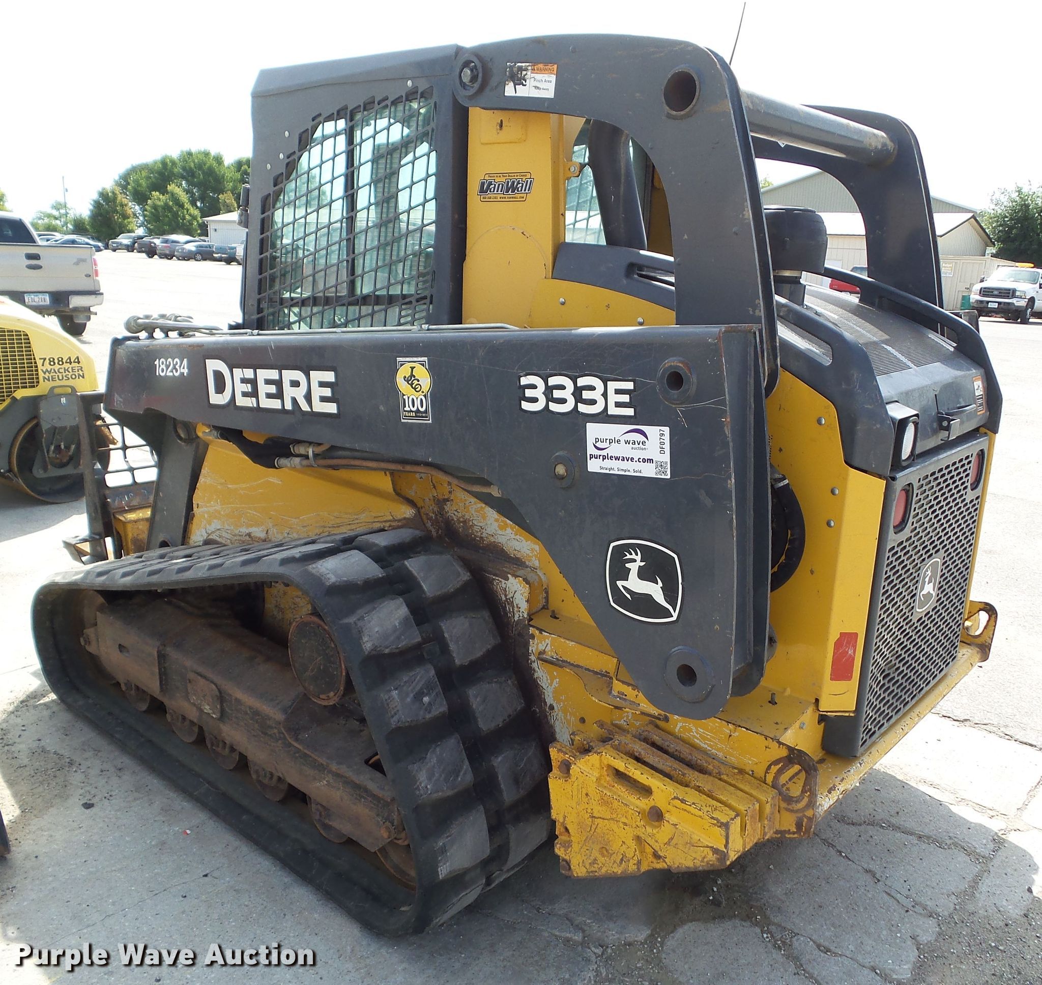 Purple Wave is selling a used Tracked Skid Steer Loader in Iowa. This item is a 2015 John Deere 333E skid steer with the following: 2,319 hours on meter, Yanmar 4TNV94CHT four cylinder diesel engine, 97 HP, Two speed hydrostatic transmission, Enclosed cab, AC and heat, AM/FM, Hand bucket controls, Backup alarm, 84"W general purpose bucket, Auxiliary hydraulics, Auxiliary electrical outlet, Hydraulic quick coupler, Counter weight, Bridgestone 18"W tracks, Pallet forks not included, Serial 1T0333EKHFE276911, Unit# 18234