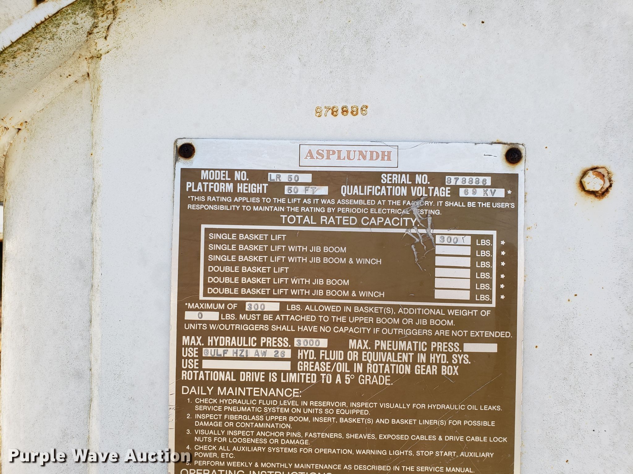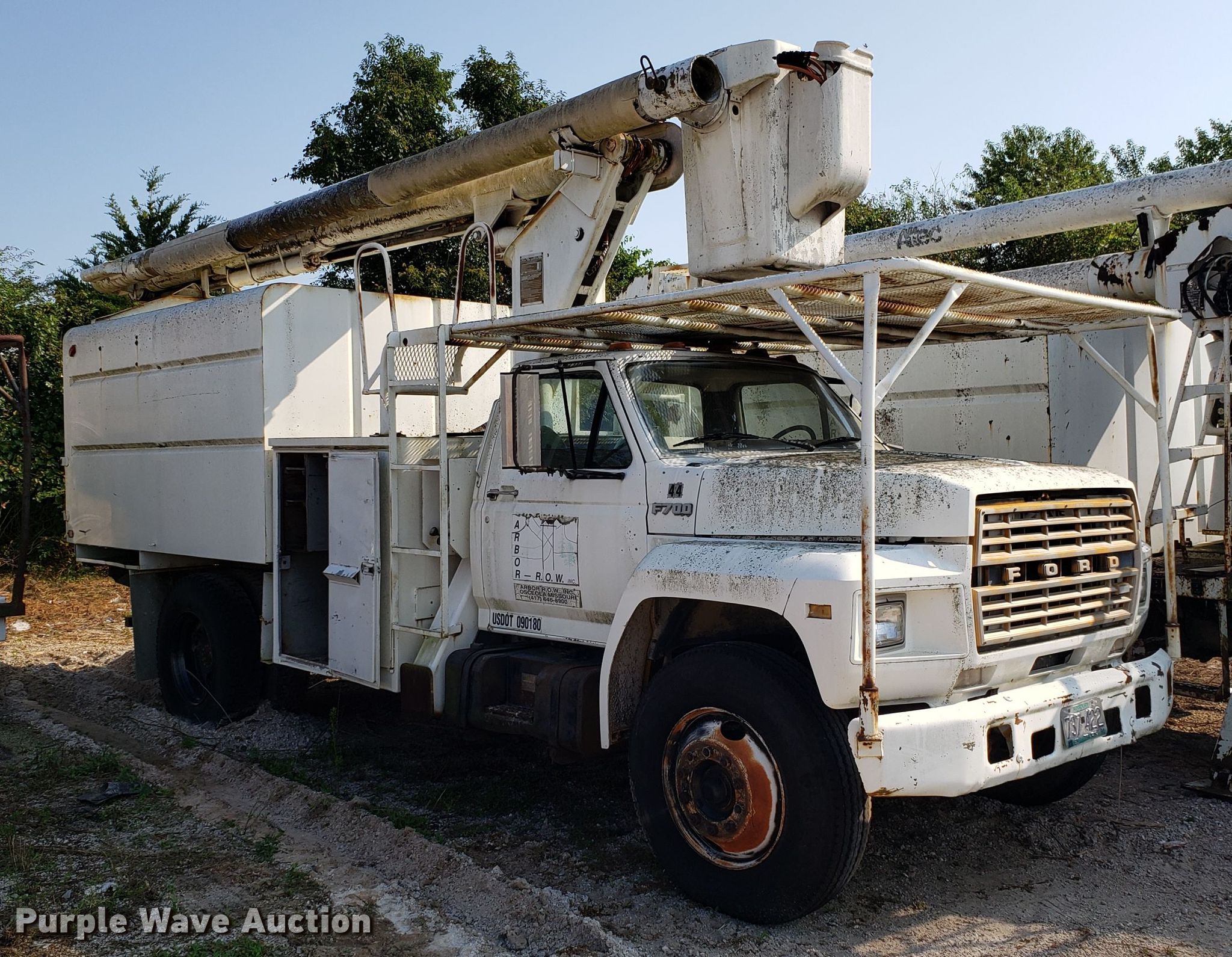 Purple Wave is selling a used Bucket Truck in Missouri. This item is a 1987 Ford F700 bucket truck with the following: 54,115 miles on odometer, 6.1L V8 gas engine, Five speed manual transmission, PTO, 10'L x 96"W chipper bed, 60" side height, Asplundh LR50 boom, 300 lbs maximum lift capacity, 50' maximum lift height, Man basket, Serial 978886, Spring suspension, Hydraulic brakes, 11R22.5 tires, Bed contents included, Unknown operating condition