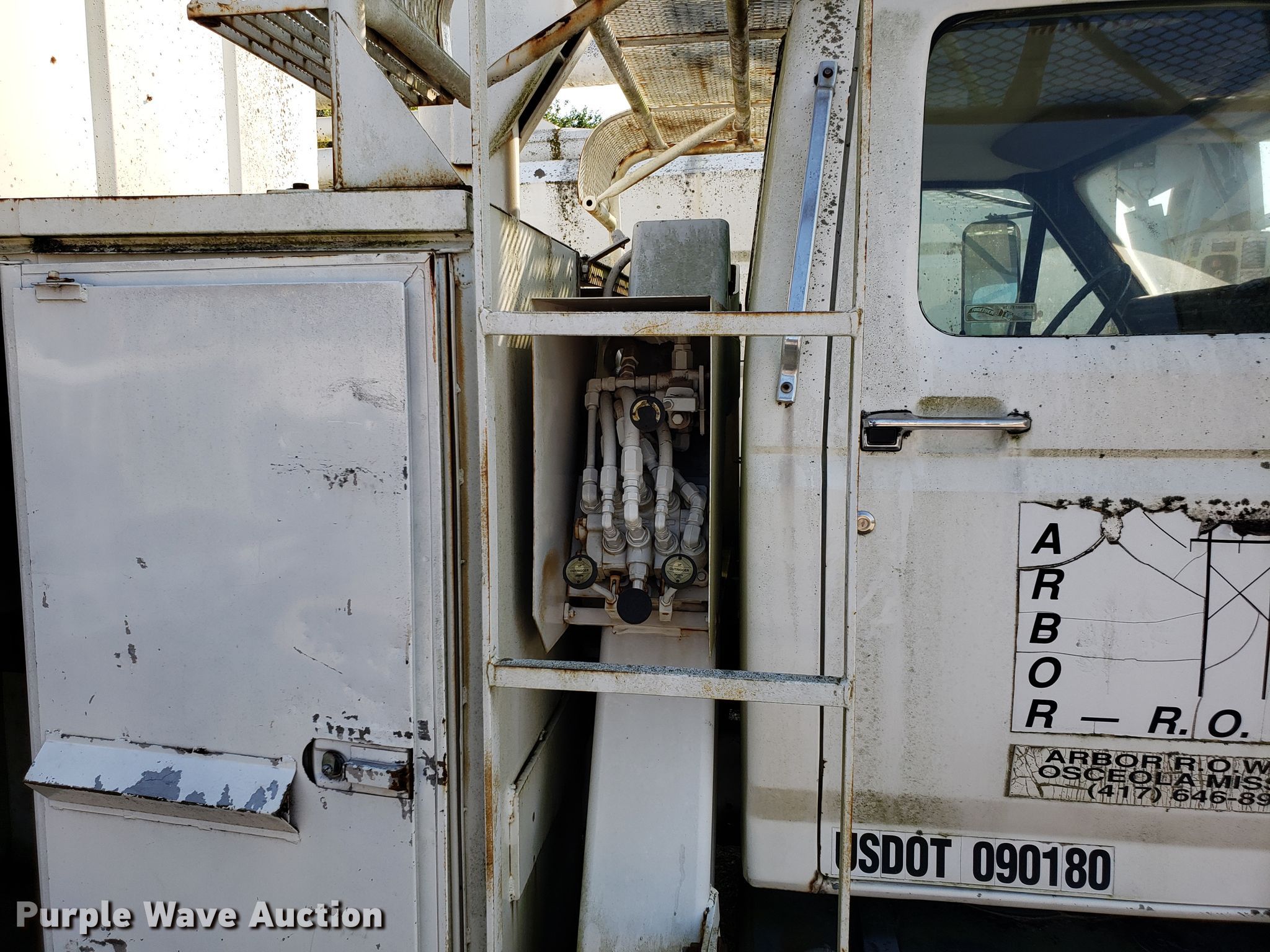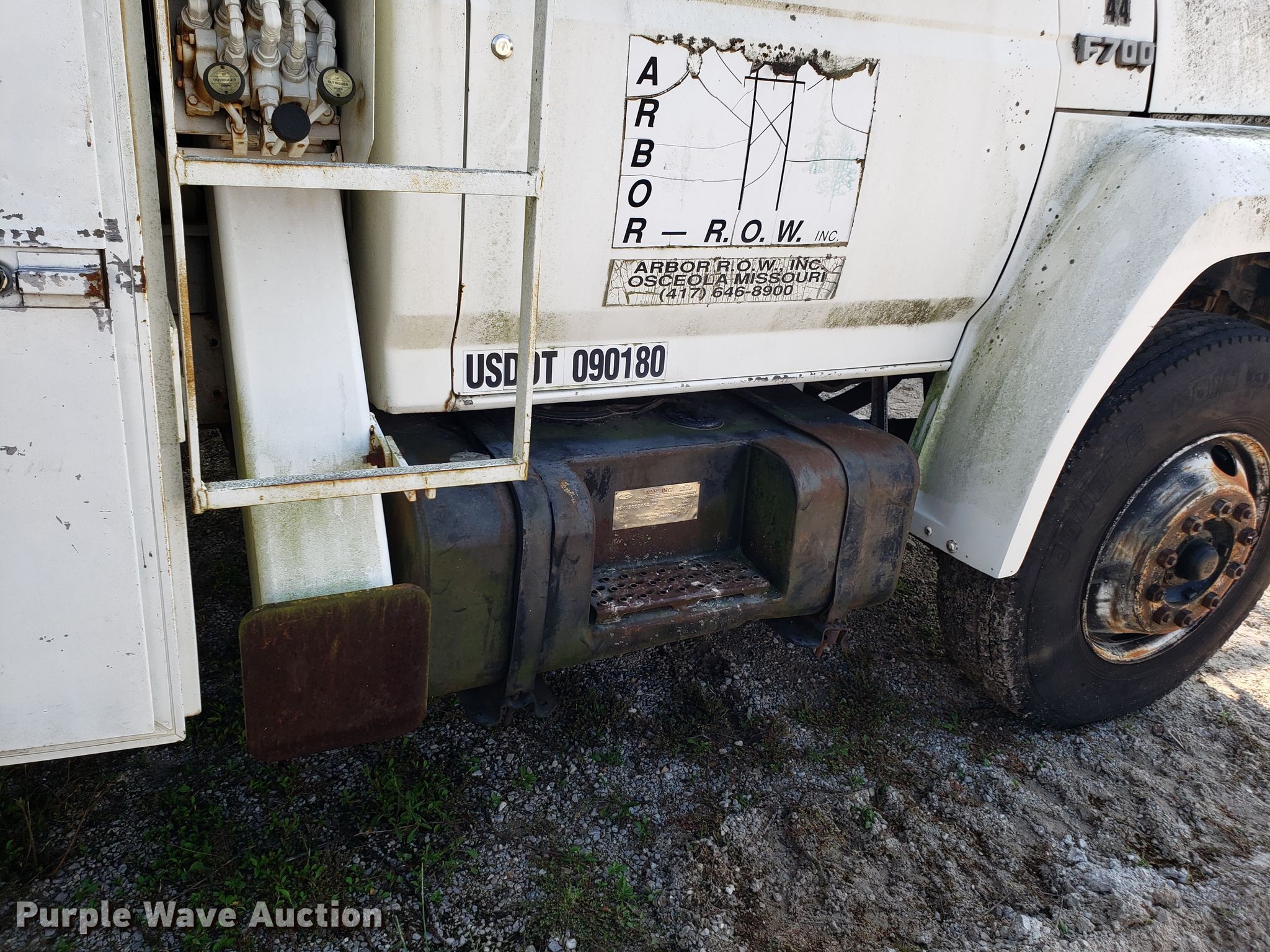 1987 Ford F700 bucket truck. 54,115 miles on odometer, 6.1L V8 gas engine, Five speed manual transmission, PTO, 10'L x 96"W chipper bed 60" side height, Asplundh LR50 boom 300 lbs maximum lift capacity, 50' maximum lift height, Man basket, Serial 978886, Spring suspension, Hydraulic brakes, 11R22.5 tires, Bed contents included, Unknown operating condition. Missouri title. Title distribution may be delayed up to 30 days from verification of funds. 1FDNF70H3HVA15346. Arbor R.O.W. 6537 W Independence Dr. Springfield, MO 65802