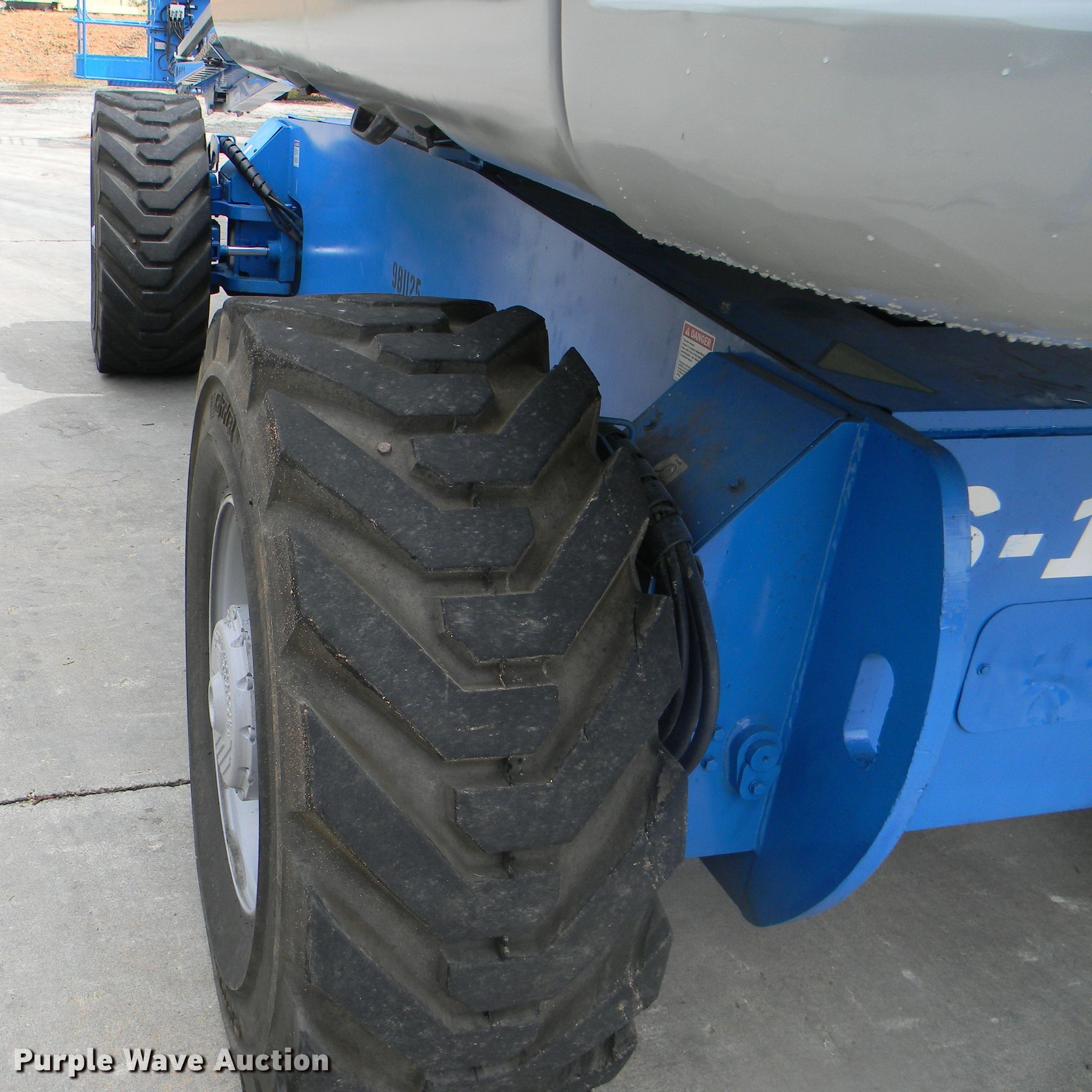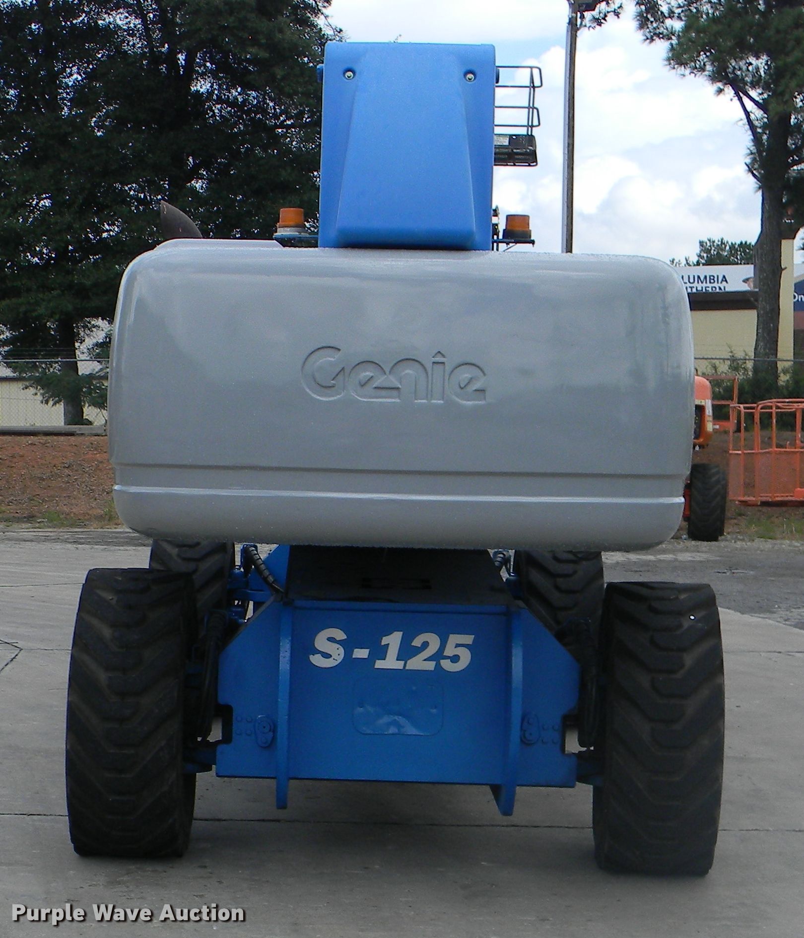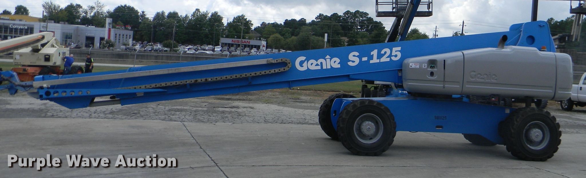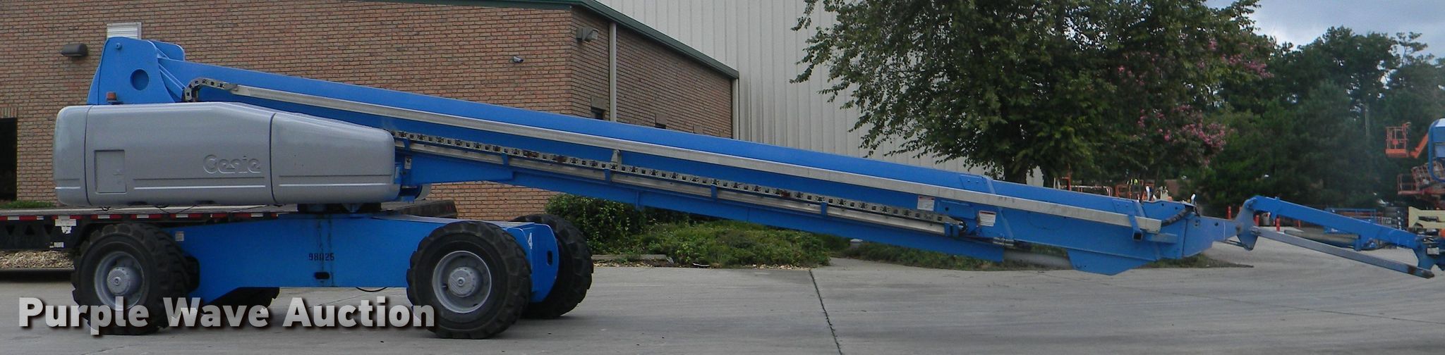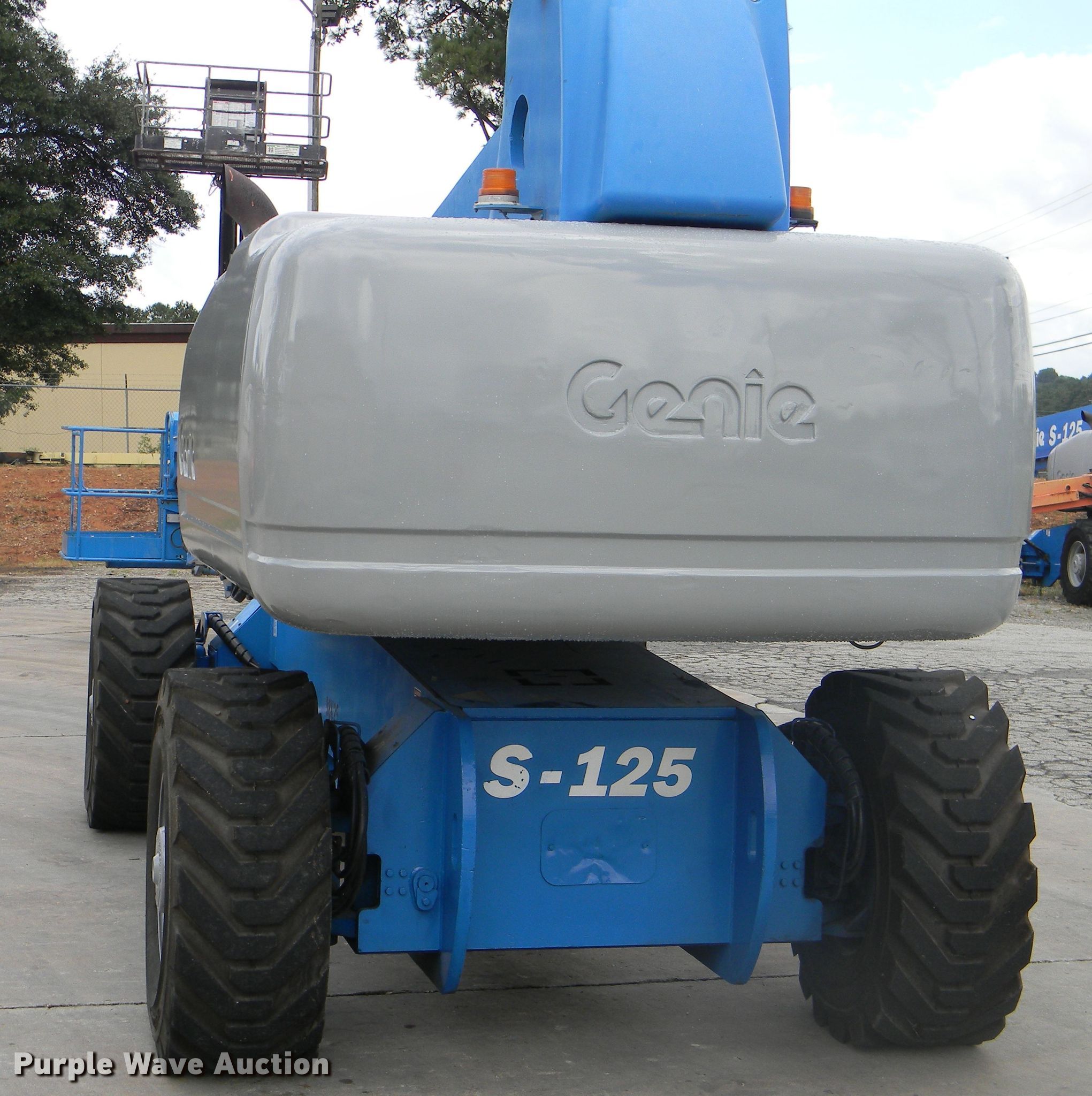 Purple Wave is selling a used Boom Lift in Georgia. This item is a 2002 Genie S-125 boom lift with the following: 7,355 hours on meter, Four cylinder diesel engine, Four wheel drive, 500 lbs maximum lift capacity, 80' maximum reach, 125' maximum lift height, Hydraulic extendable jib, 8'L x 3'W platform, AC power outlet, Platform and ground controls, Hydraulic platform rotation, 445/65D22.5 foam filled tires, Serial S125-457