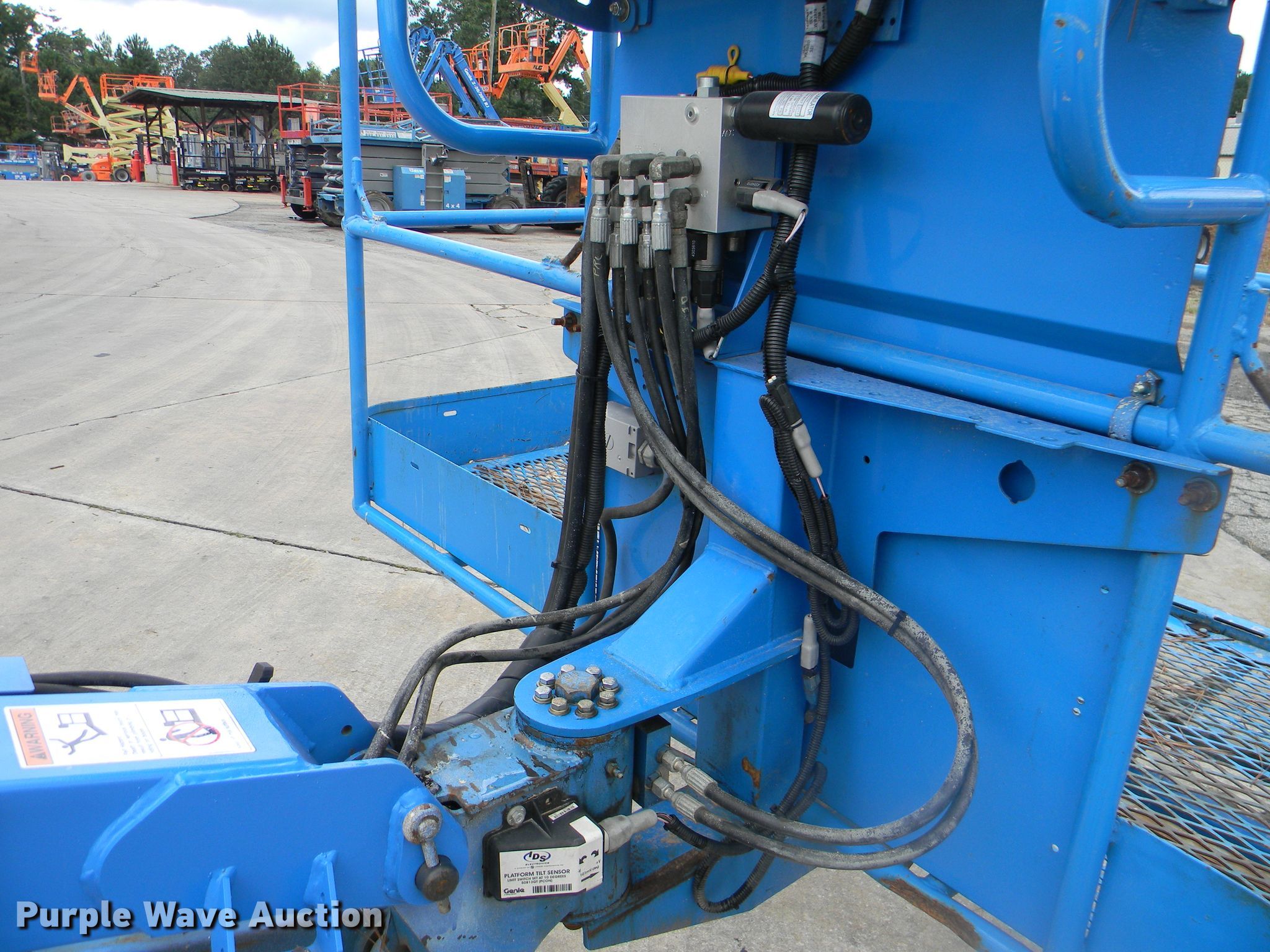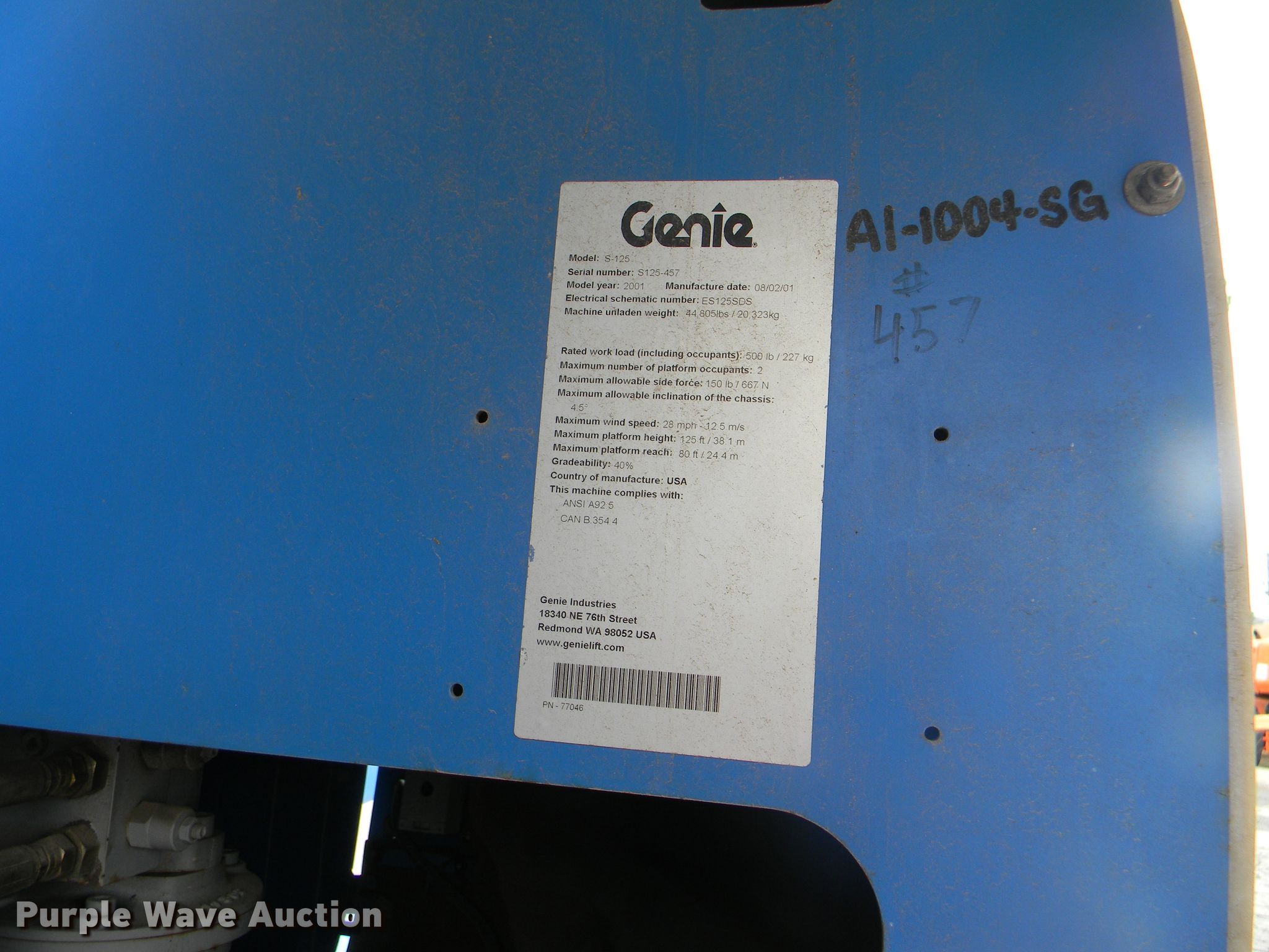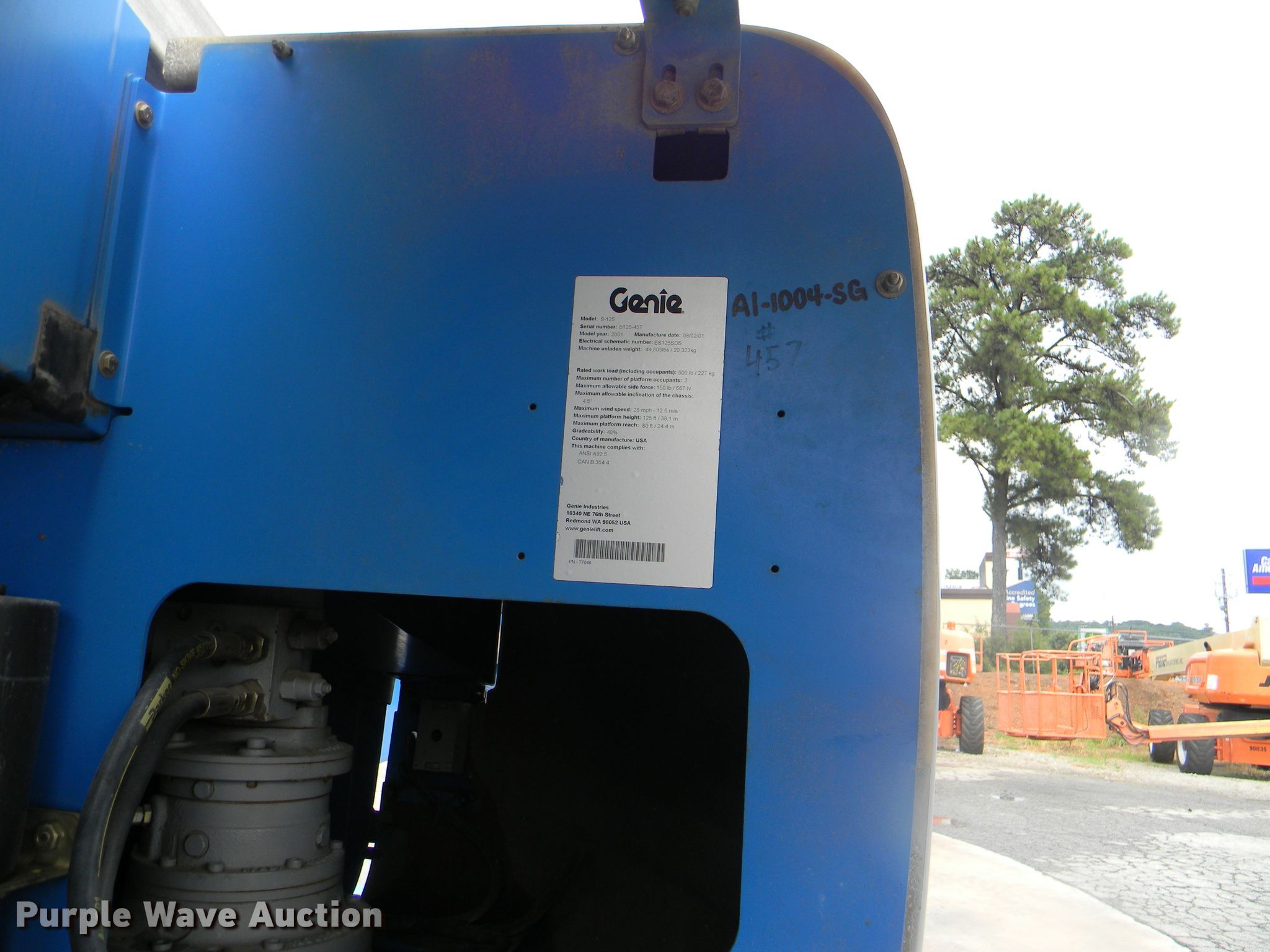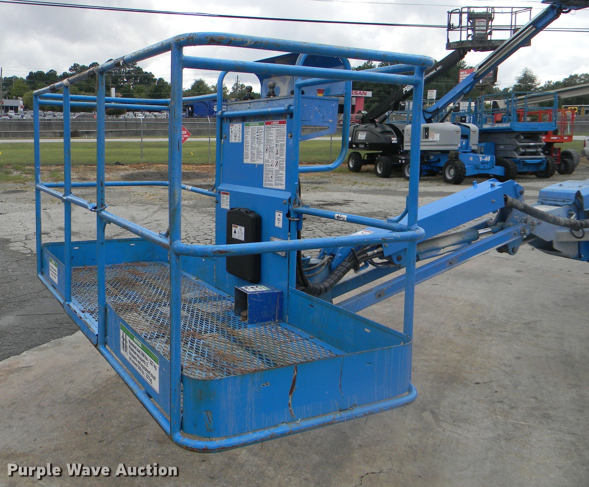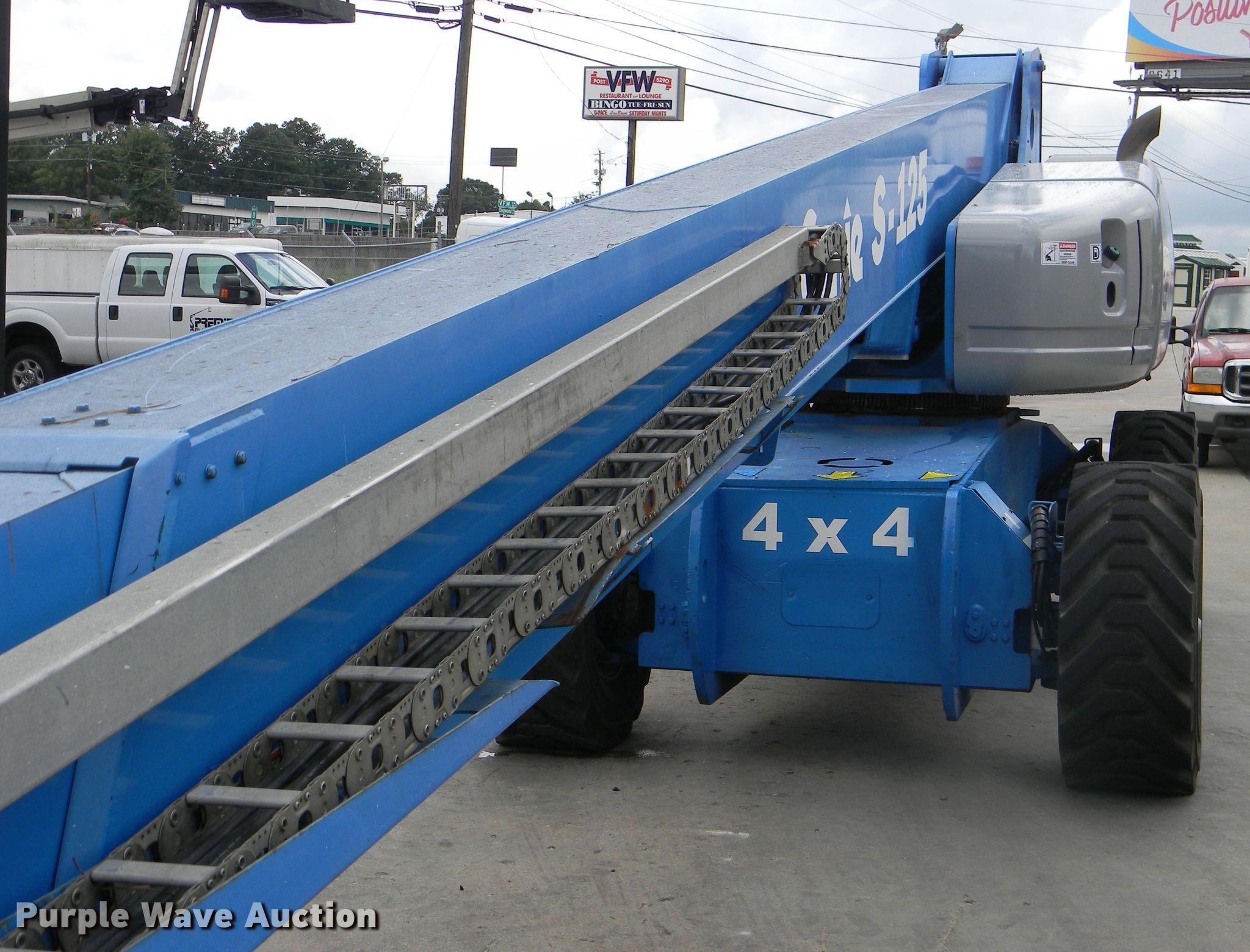 Purple Wave is selling a used Boom Lift in Georgia. This item is a 2002 Genie S-125 boom lift with the following: 7,355 hours on meter, Four cylinder diesel engine, Four wheel drive, 500 lbs maximum lift capacity, 80' maximum reach, 125' maximum lift height, Hydraulic extendable jib, 8'L x 3'W platform, AC power outlet, Platform and ground controls, Hydraulic platform rotation, 445/65D22.5 foam filled tires, Serial S125-457